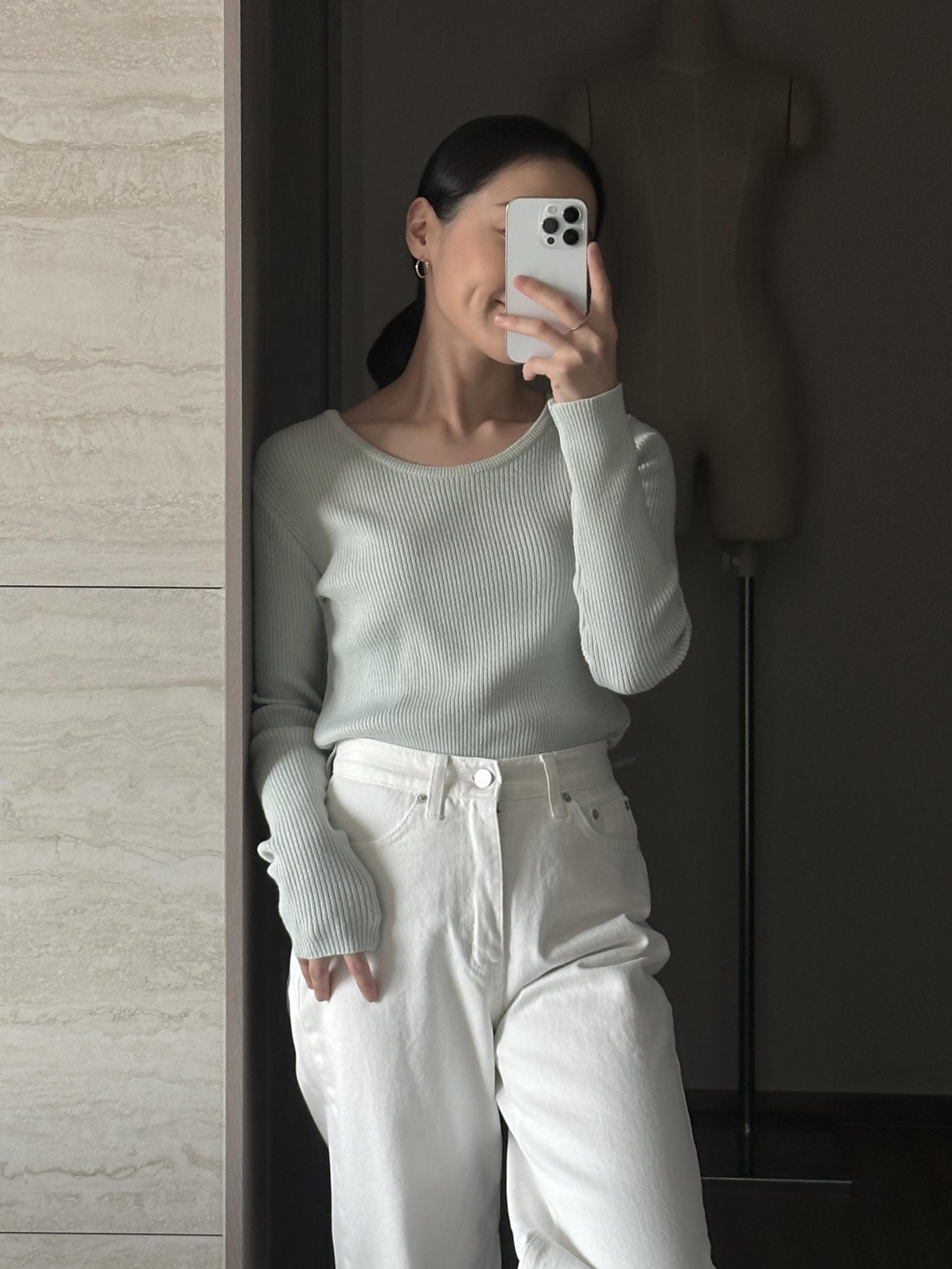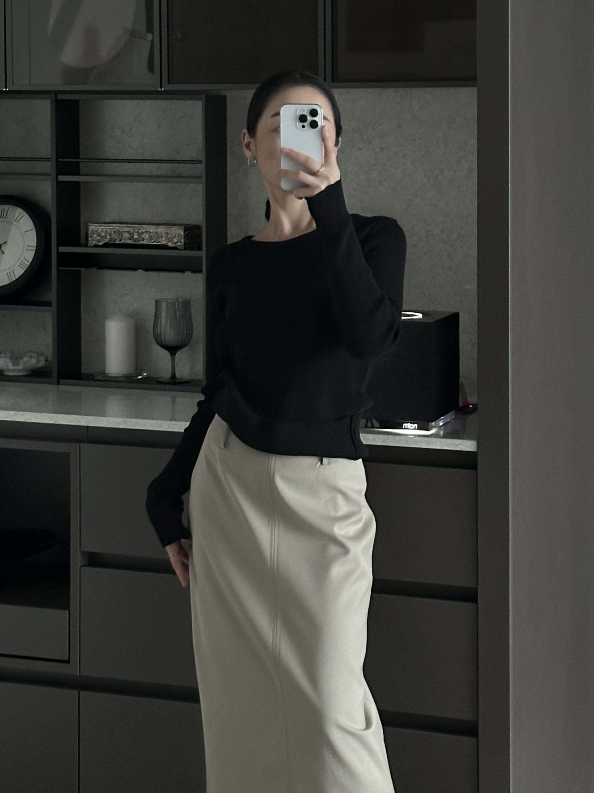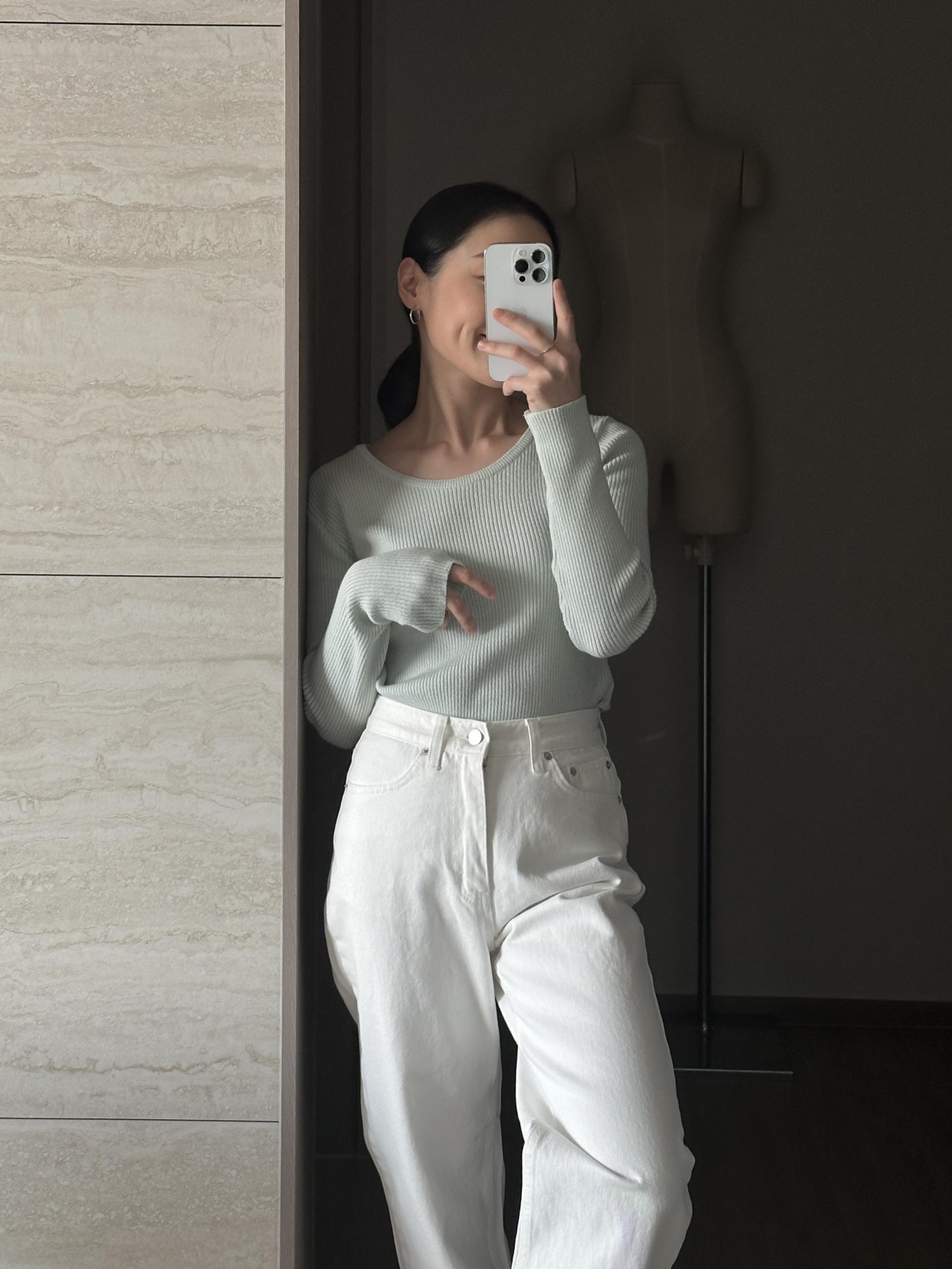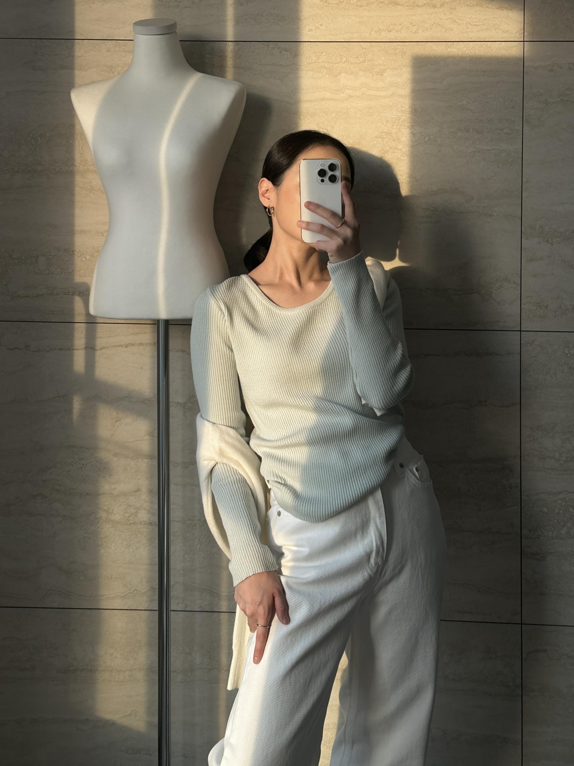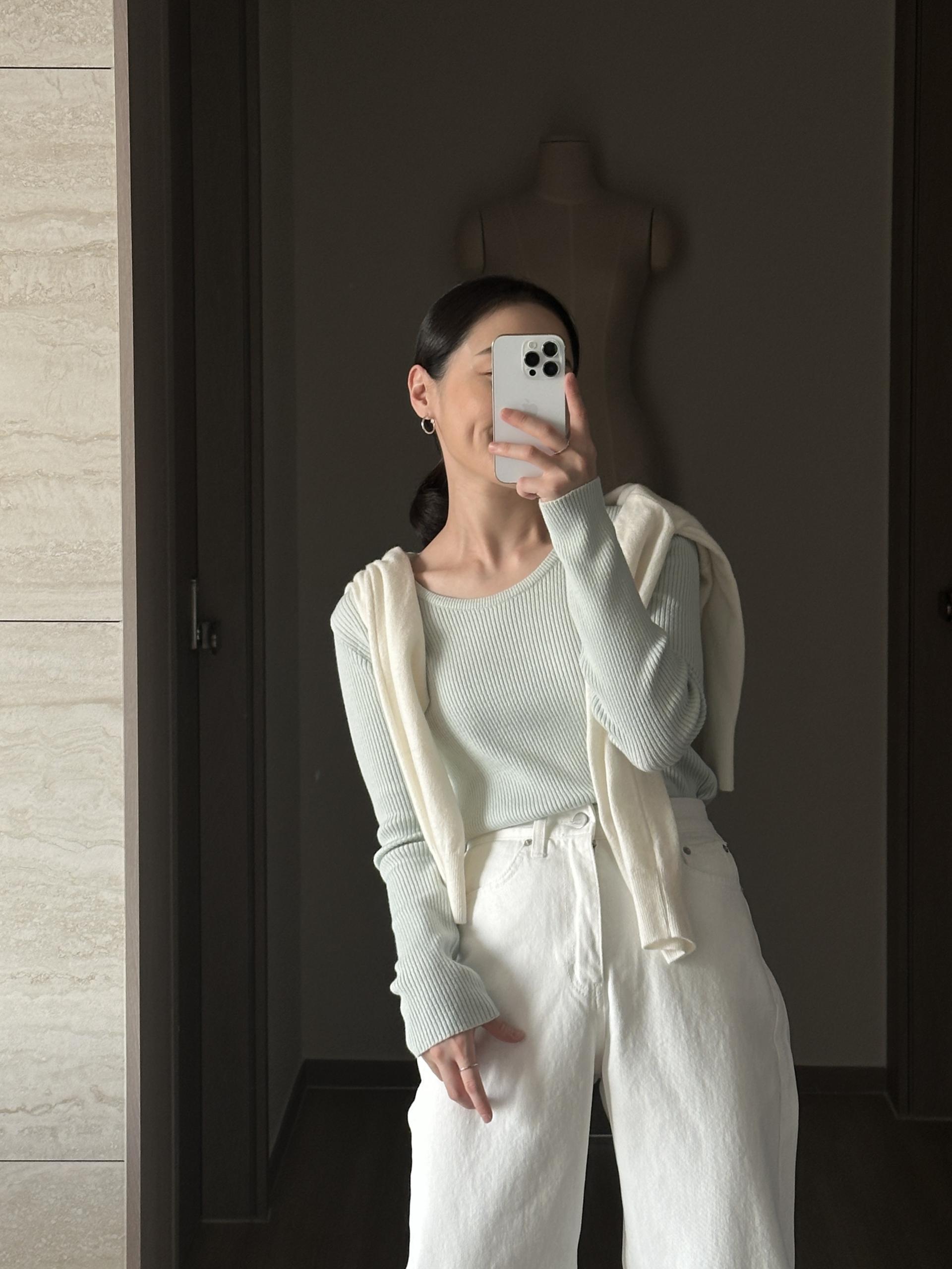 실용적으로 착용하기 좋은 적당한 슬림핏 니트웨어입니다.
