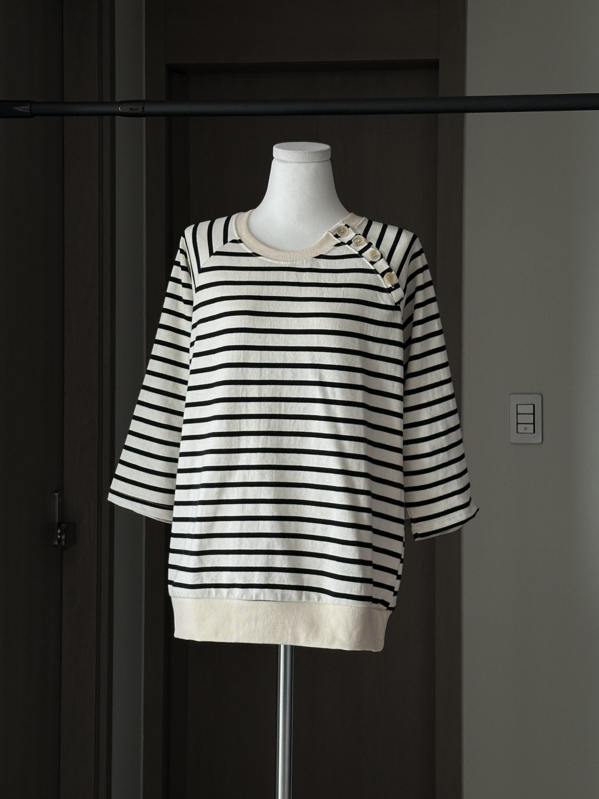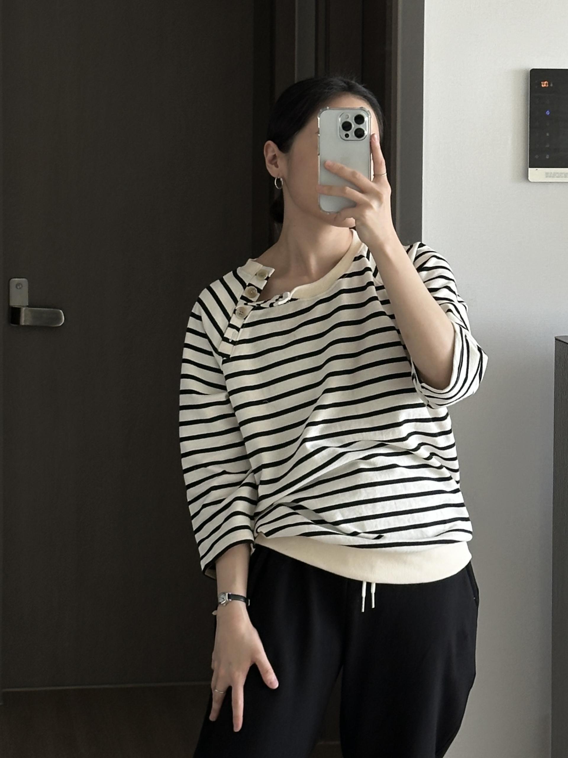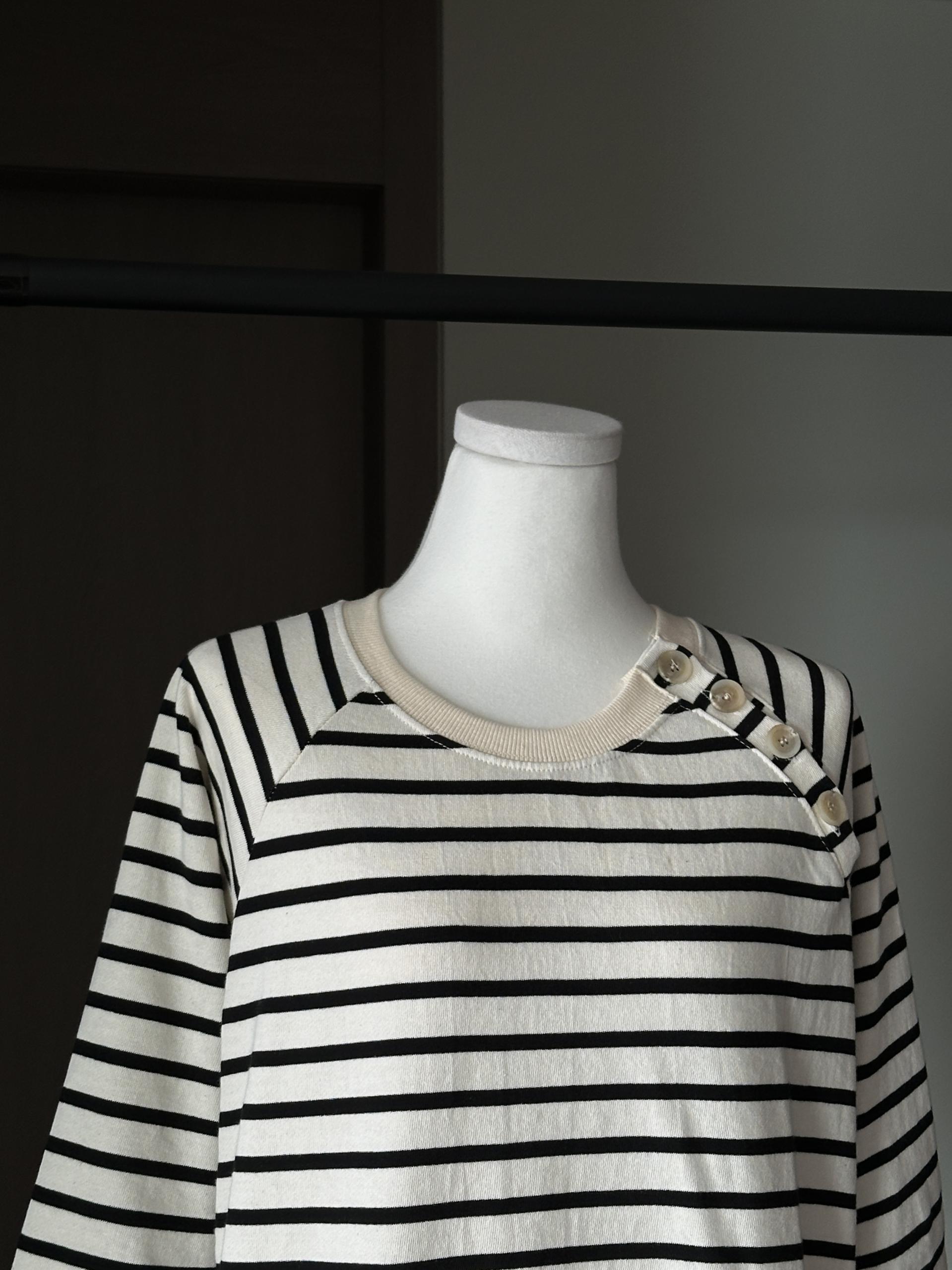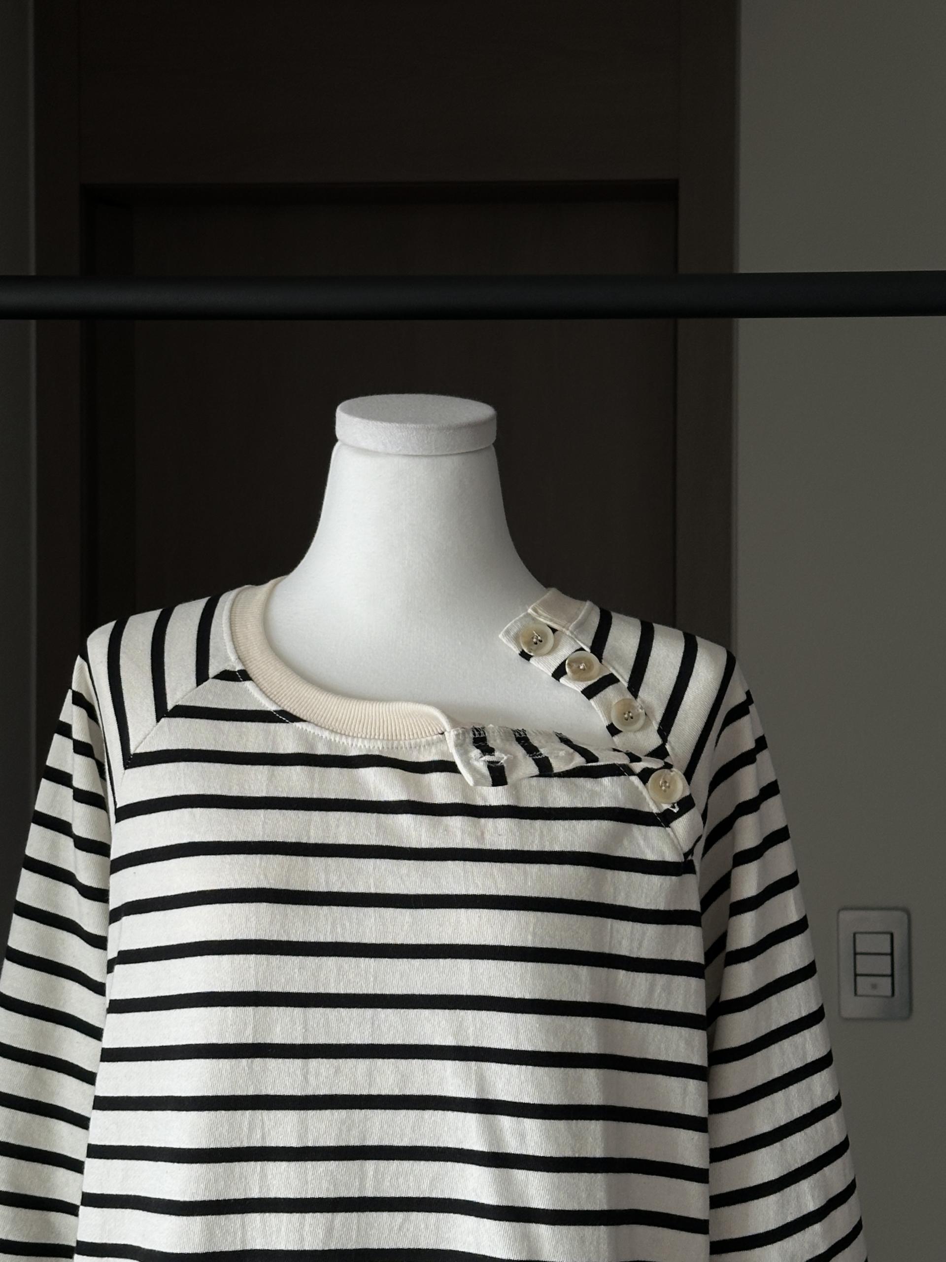스트라이프 패턴에 네크라인 사이드의 포버튼이 포인트!