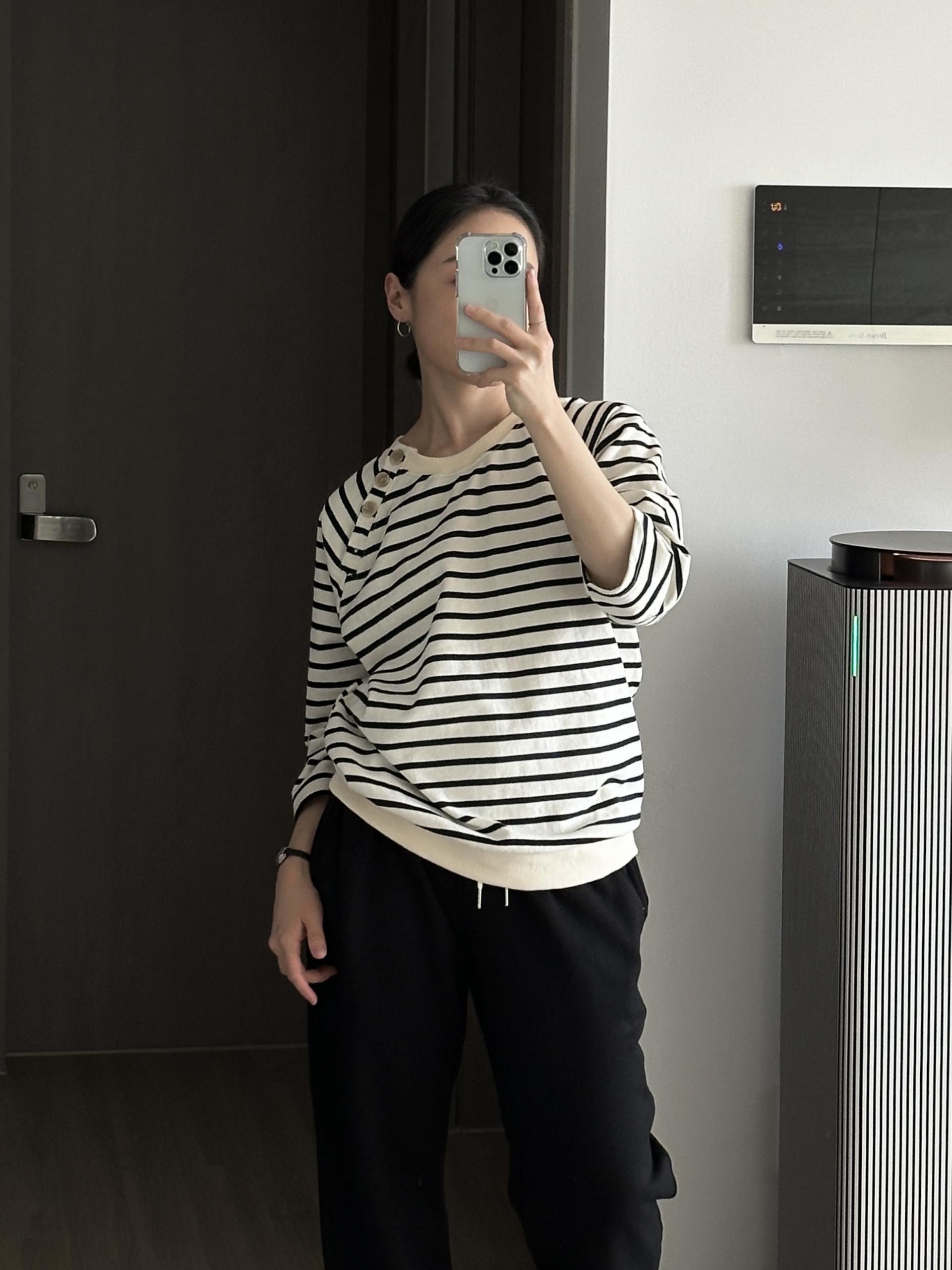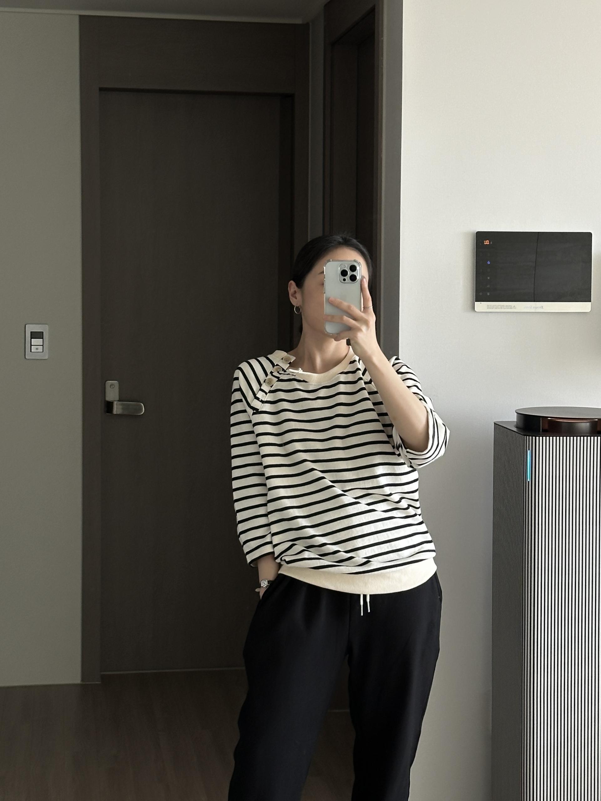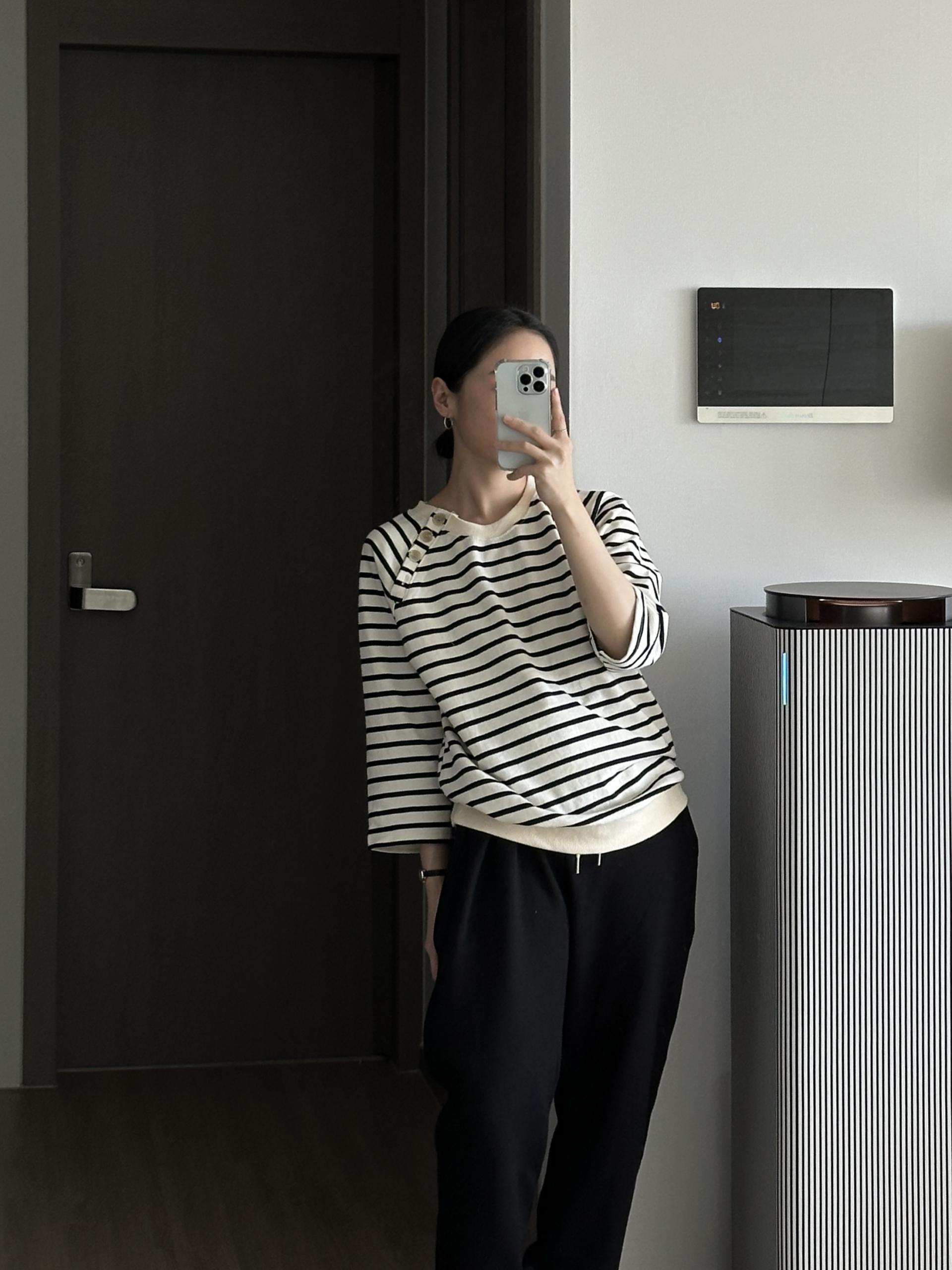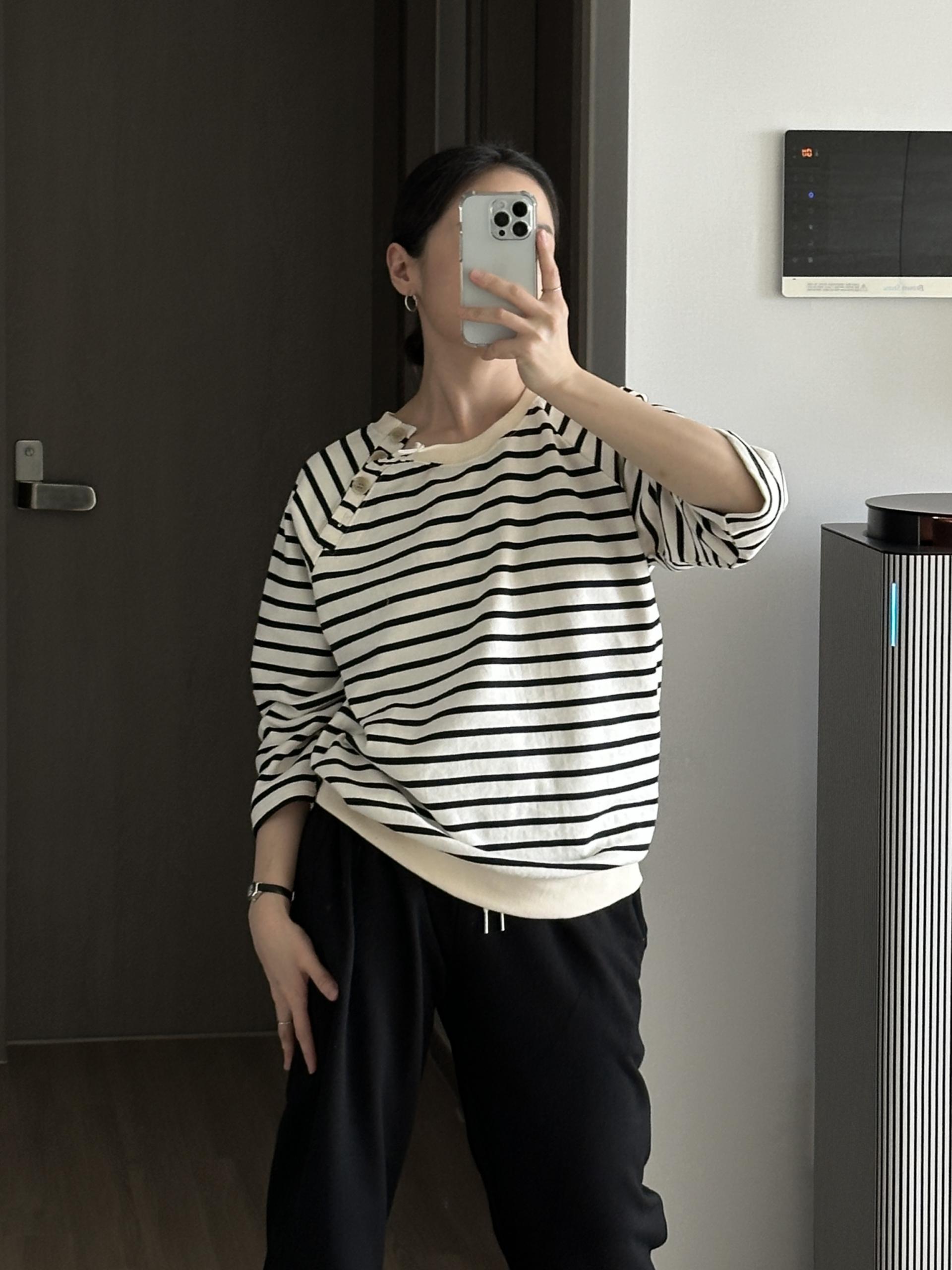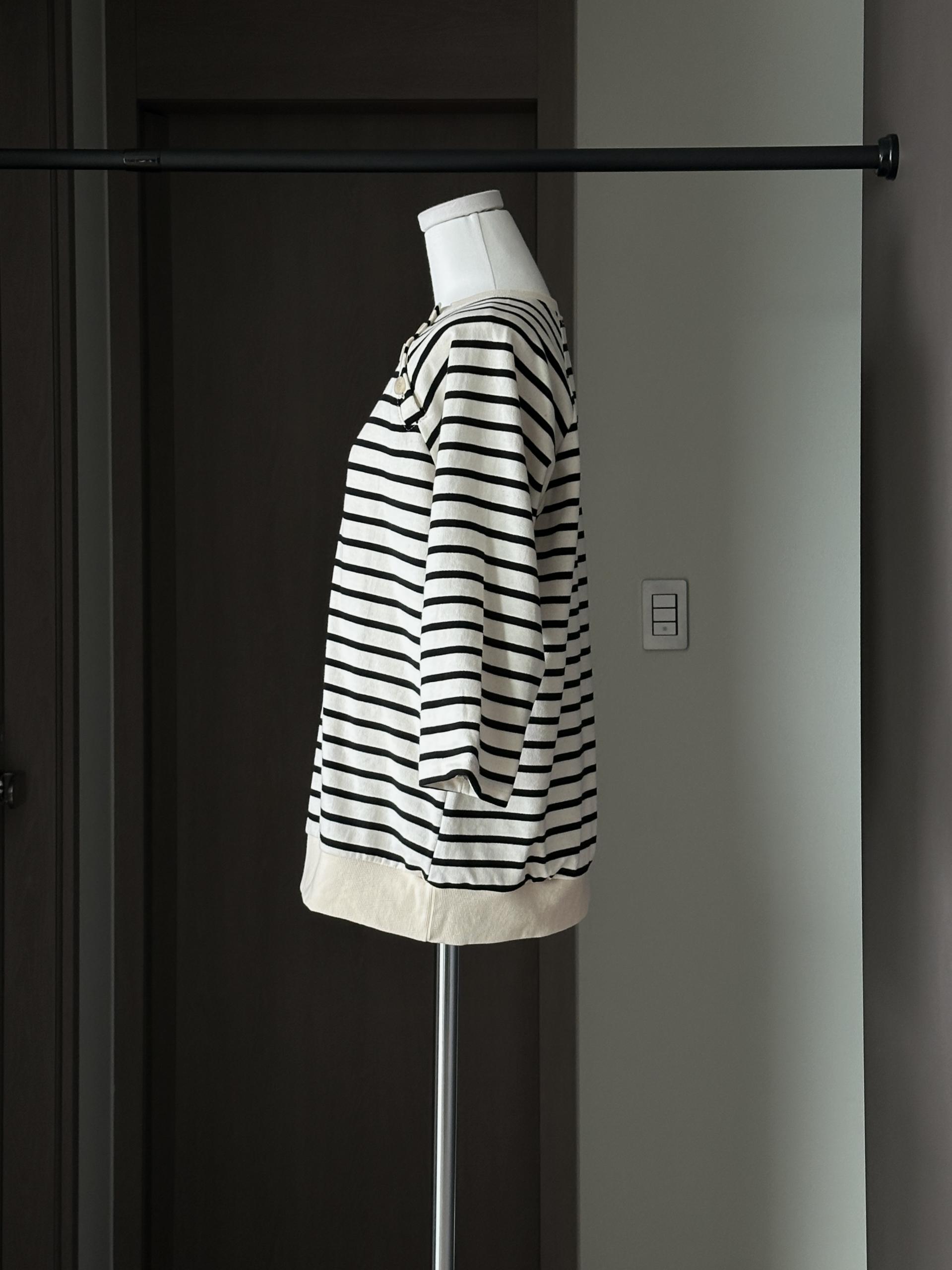 스트라이프 패턴에 네크라인 사이드의 포버튼이 포인트!