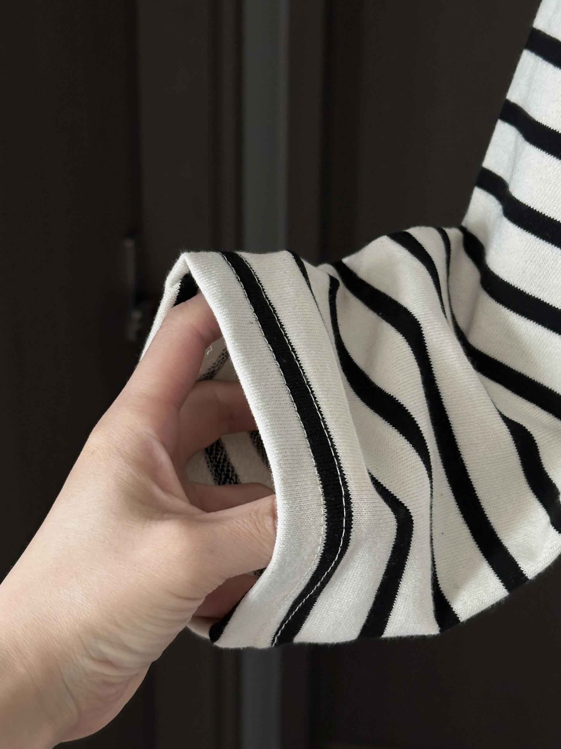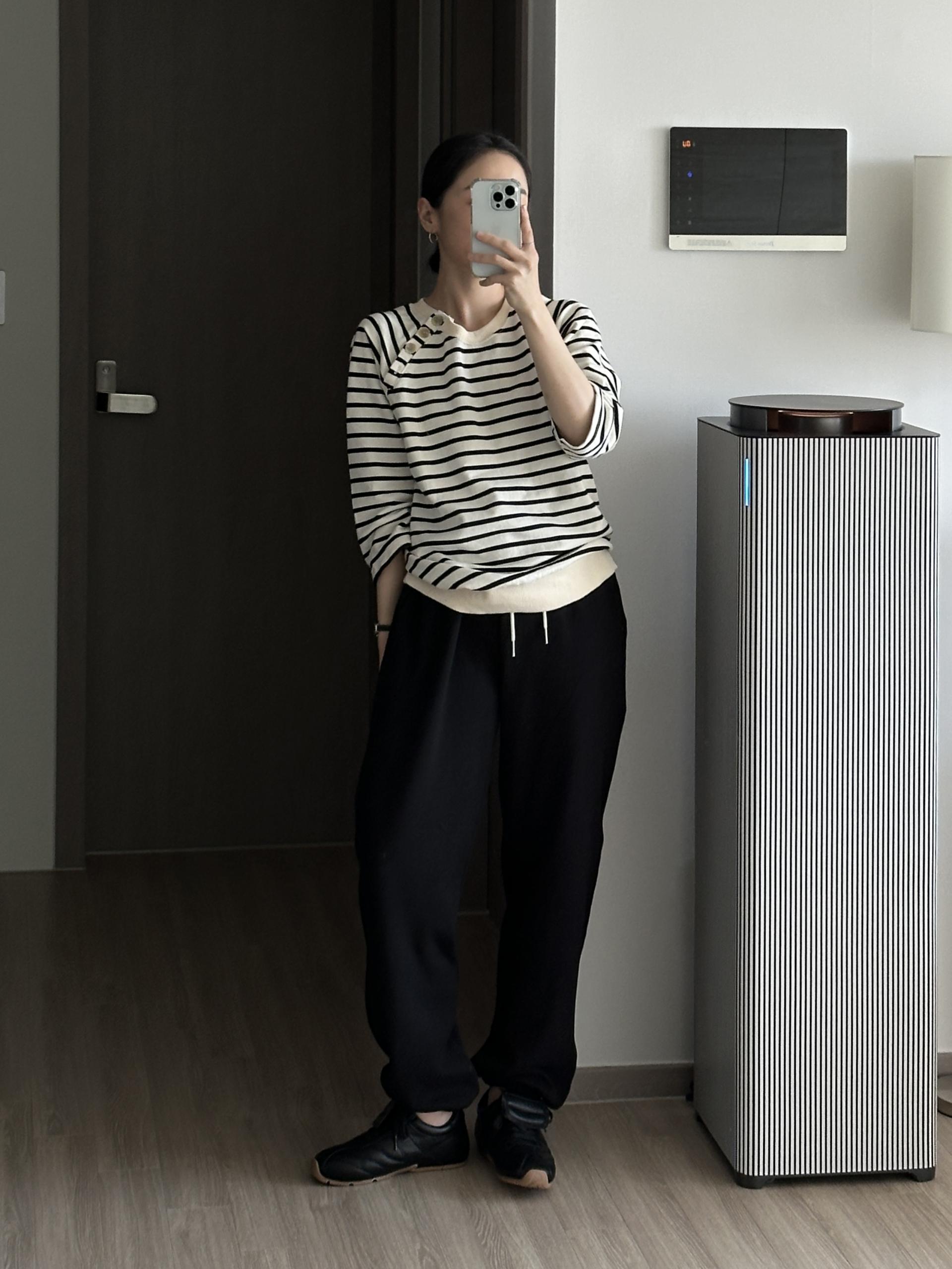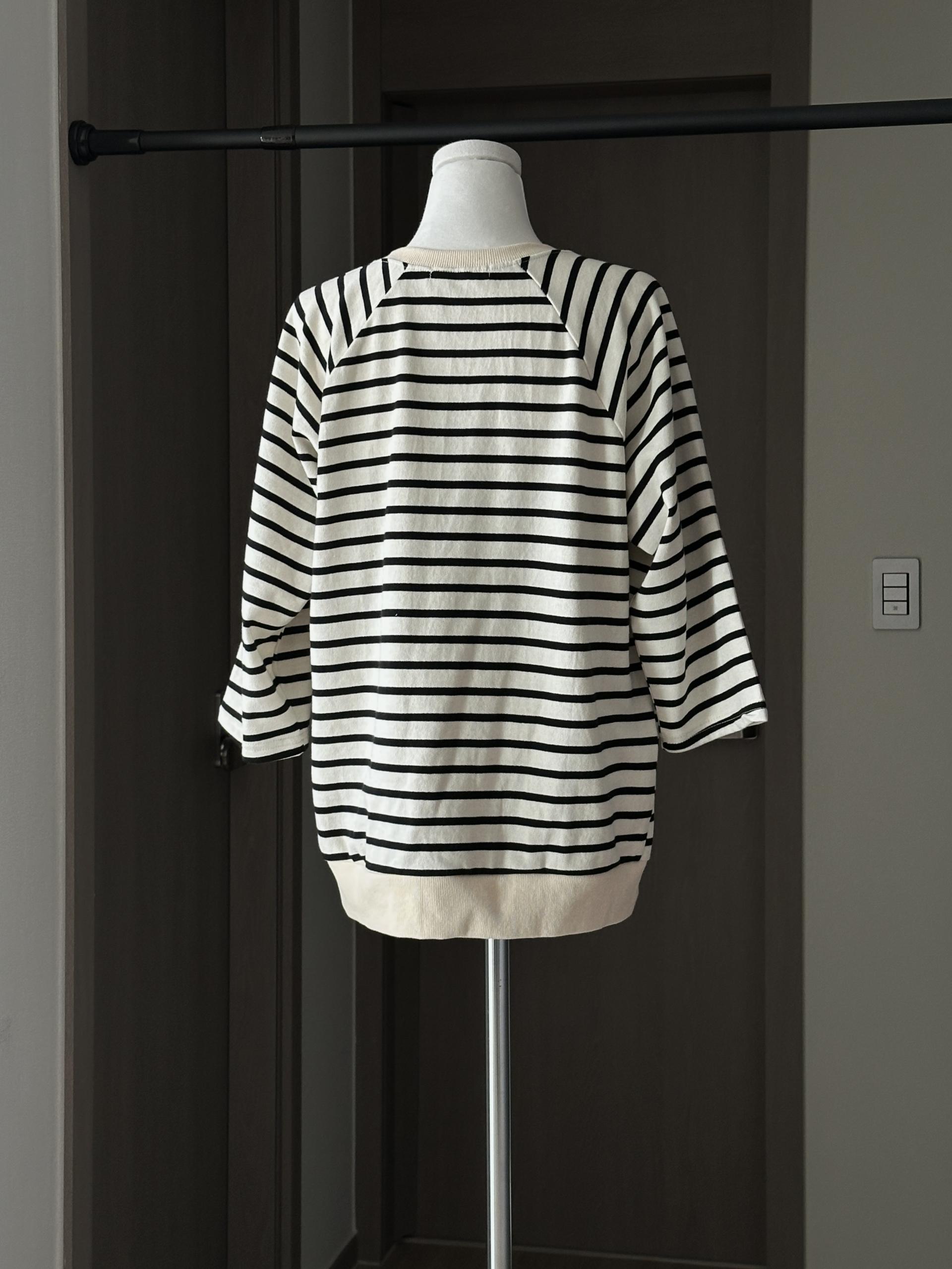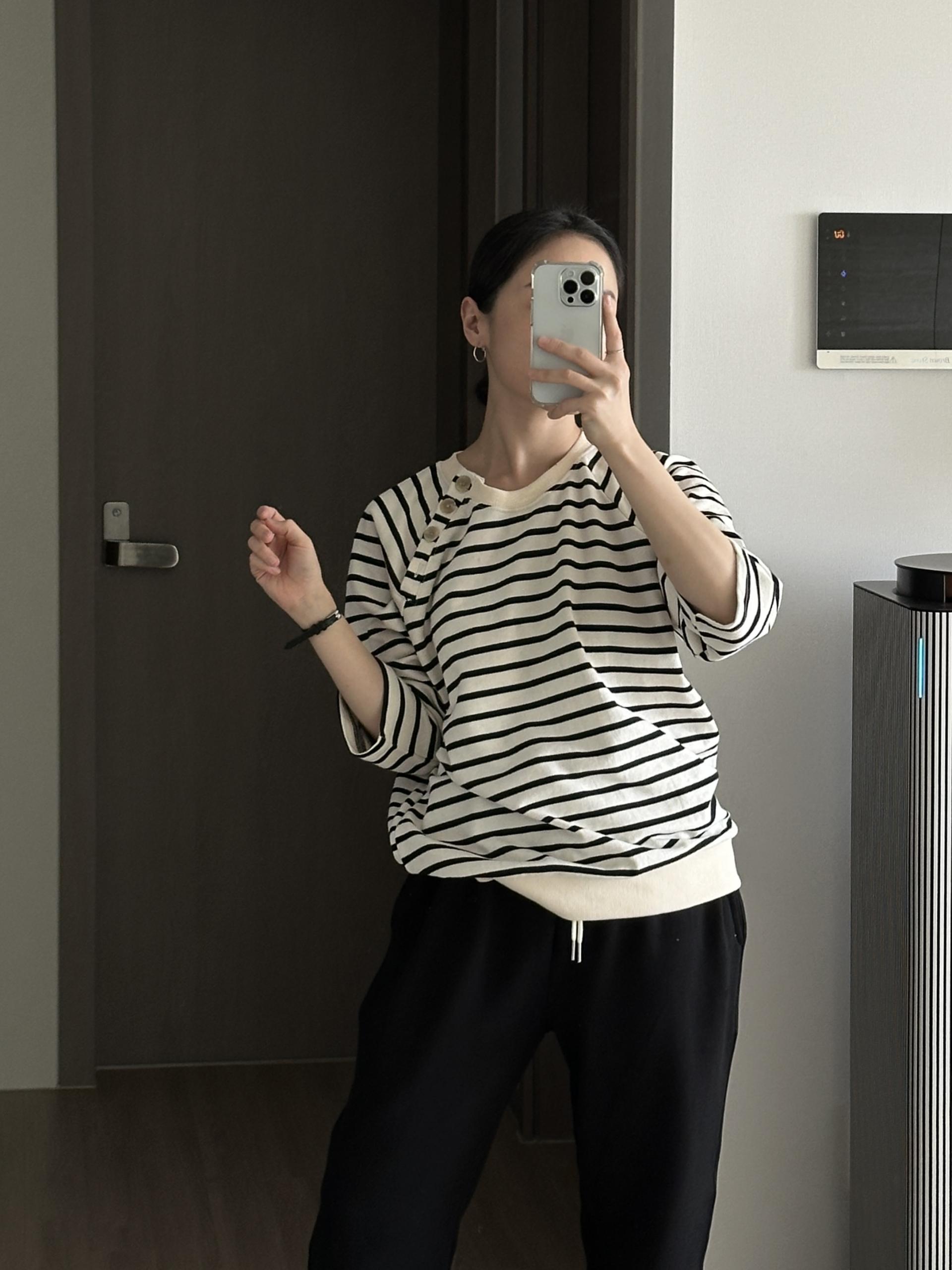 스트라이프 패턴에 네크라인 사이드의 포버튼이 포인트!