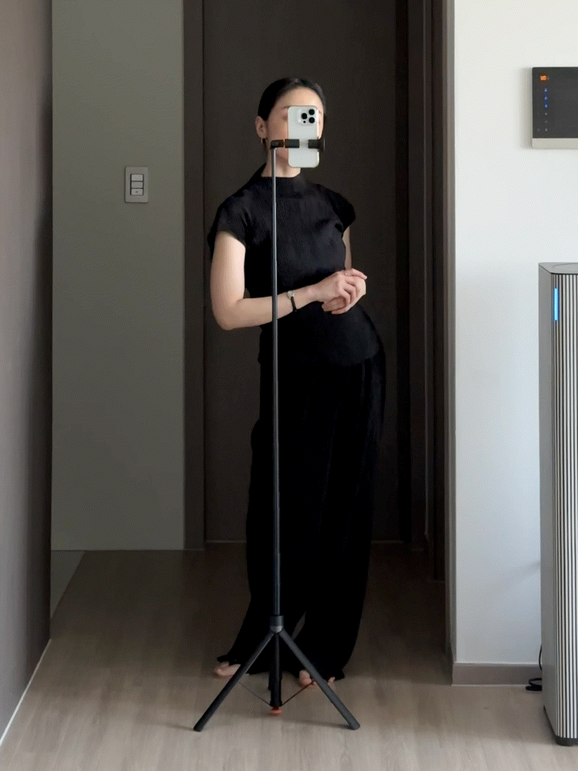 플리츠로 기본 신축이 있으며 약간 슬림한 실루엣에