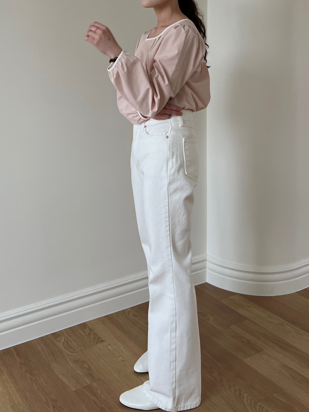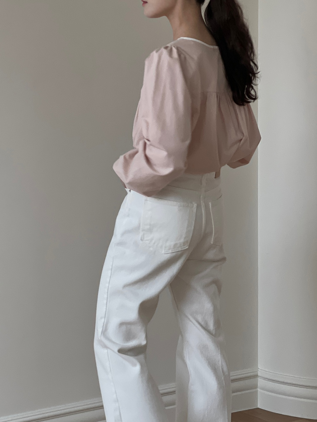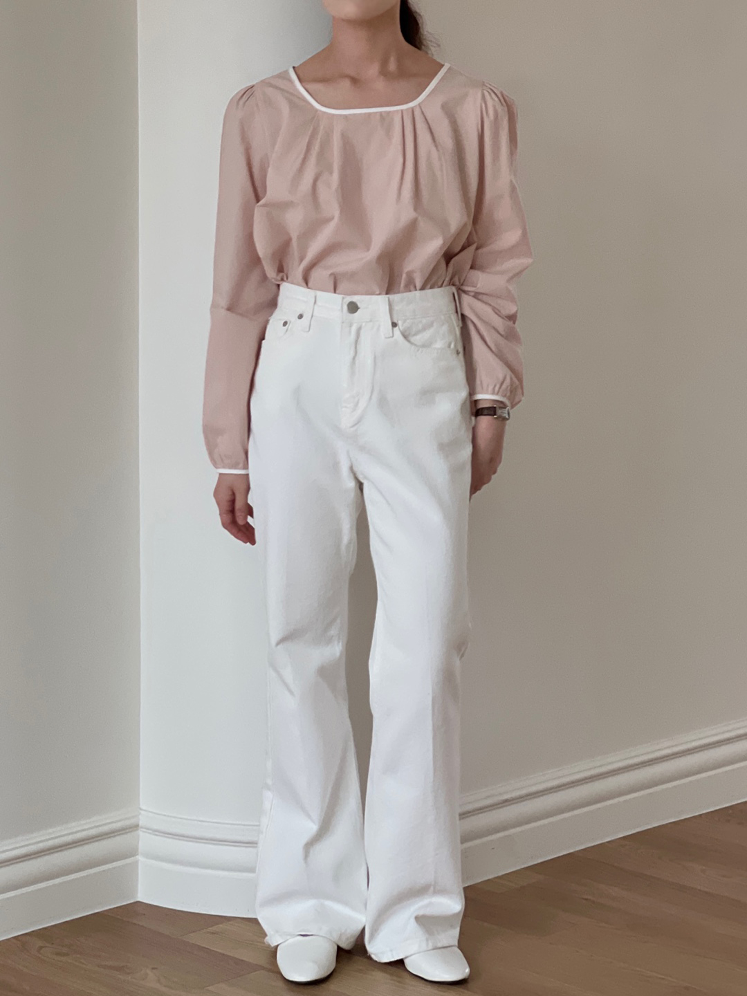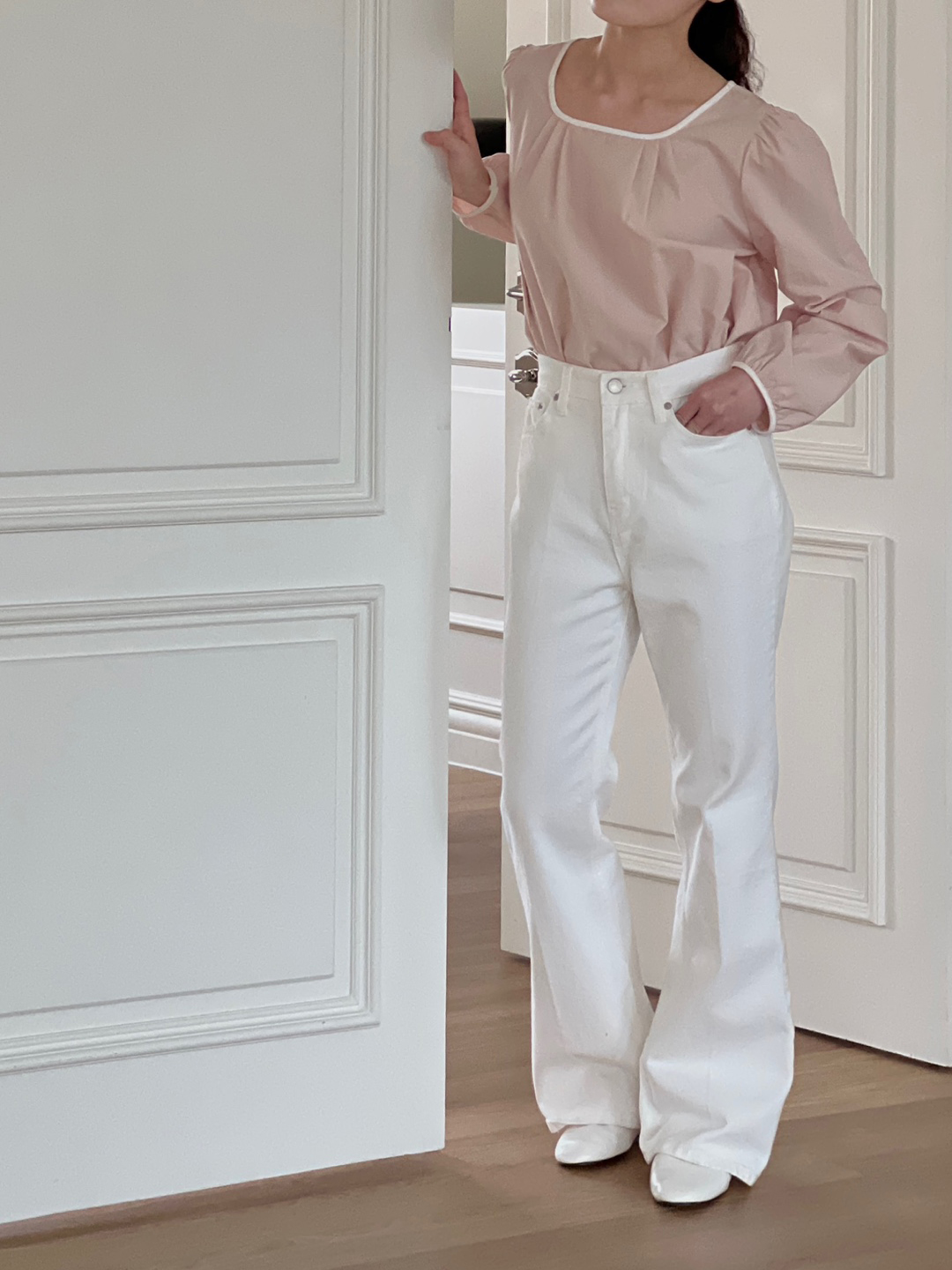 파우더리한 원단감과 어우러져 페미닌한 매력이 느껴져요.