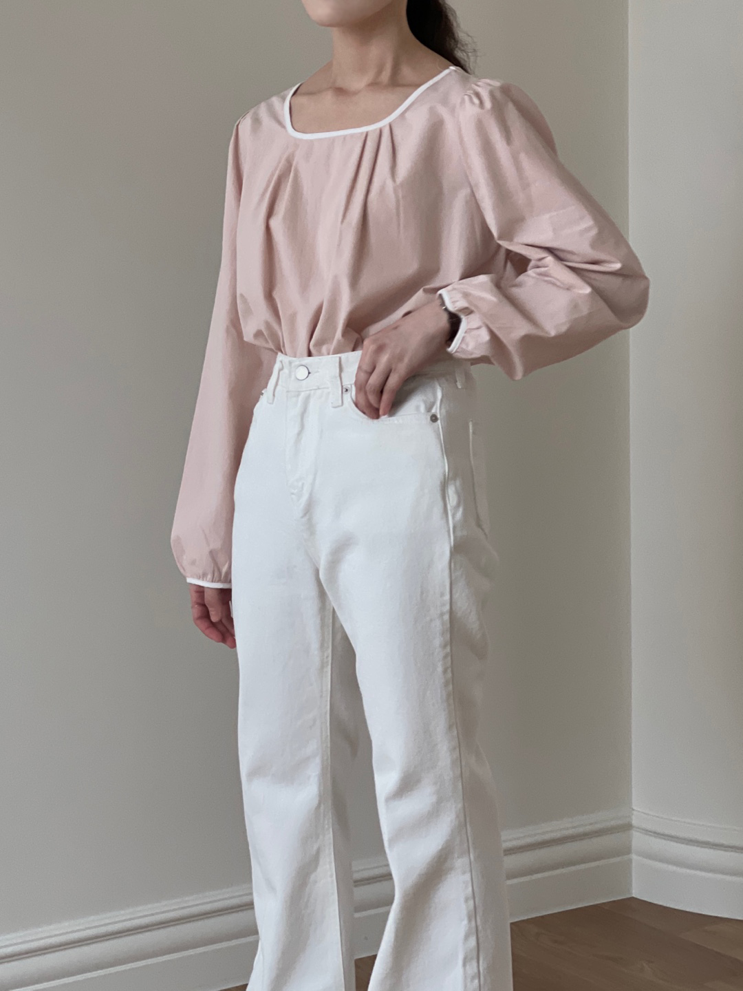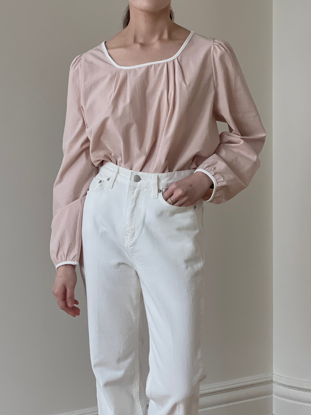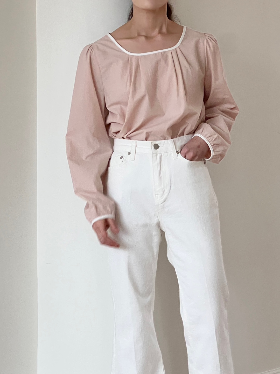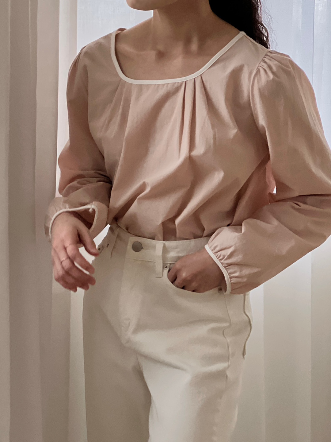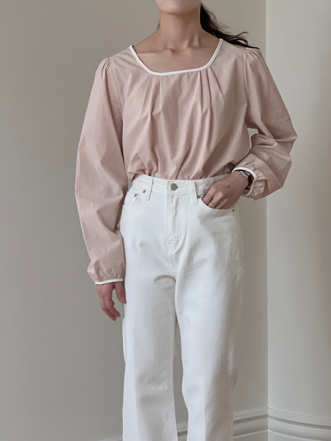 넥라인과 소매단이 아이보리 배색으로 바인딩