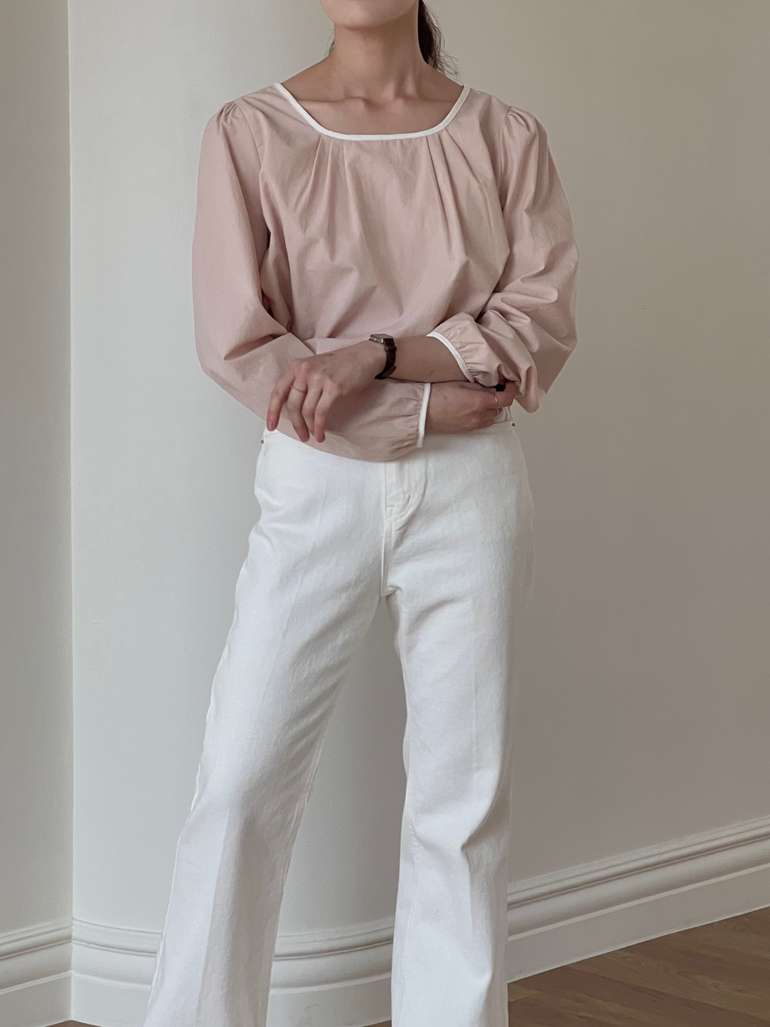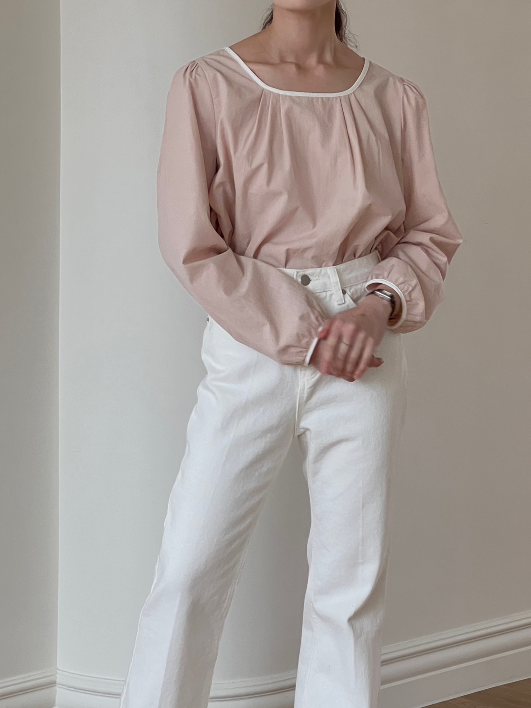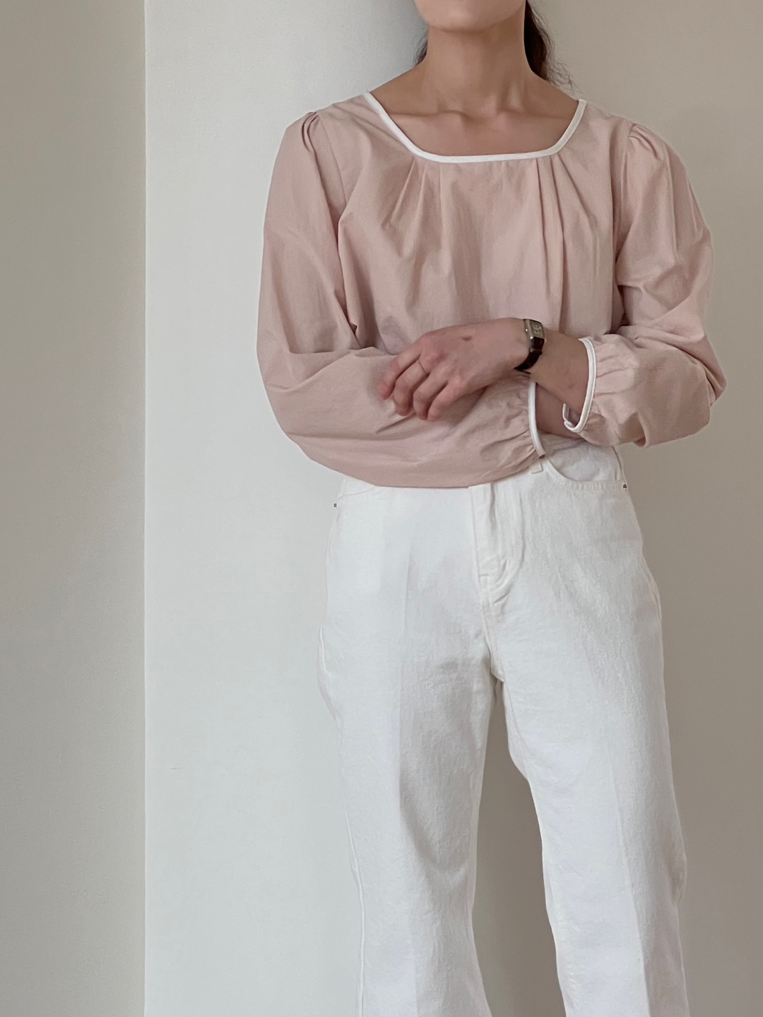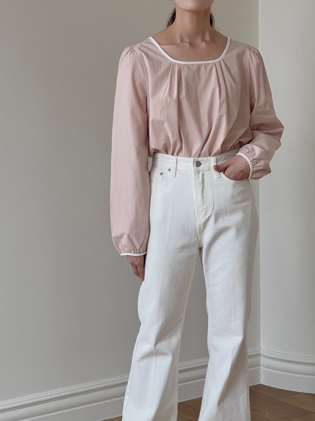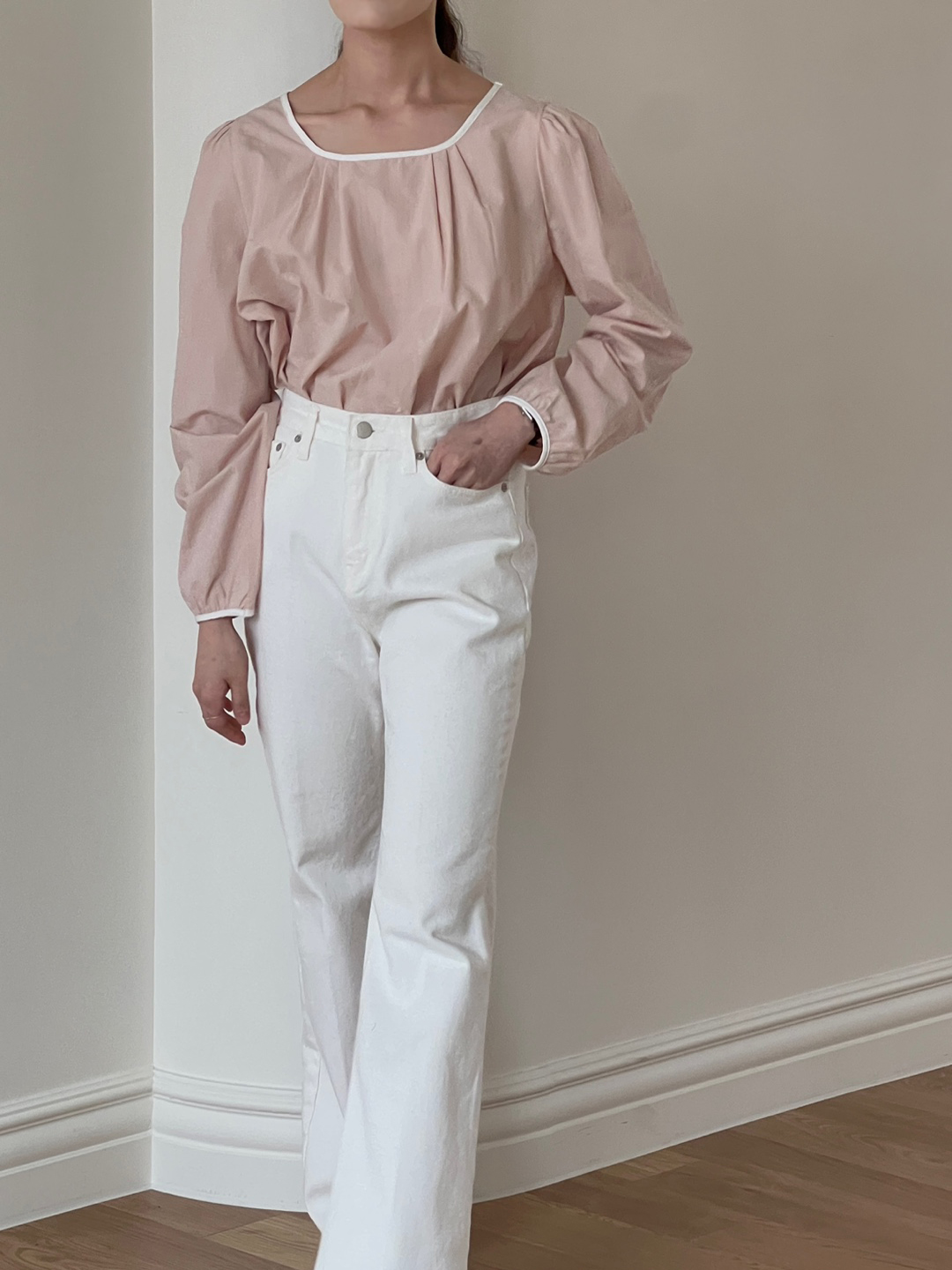 넥라인과 소매단이 아이보리 배색으로 바인딩