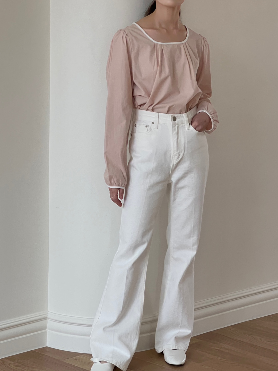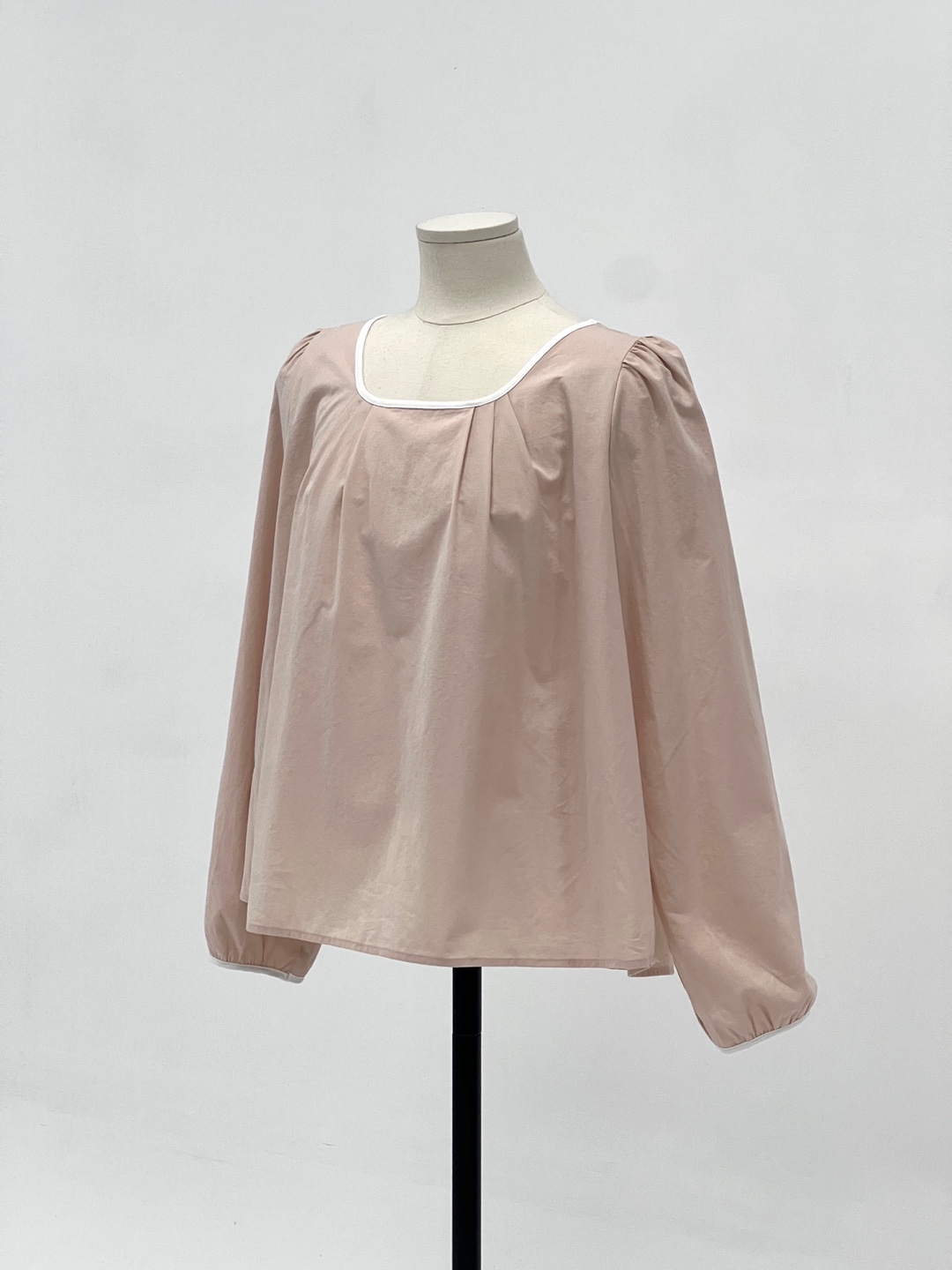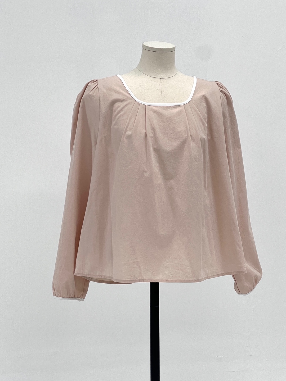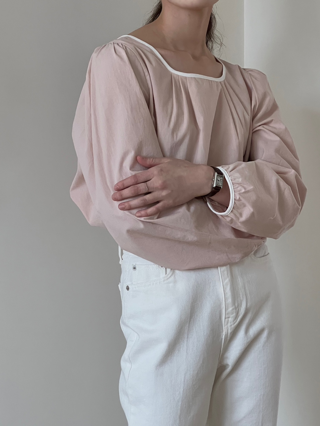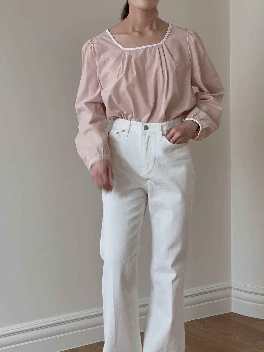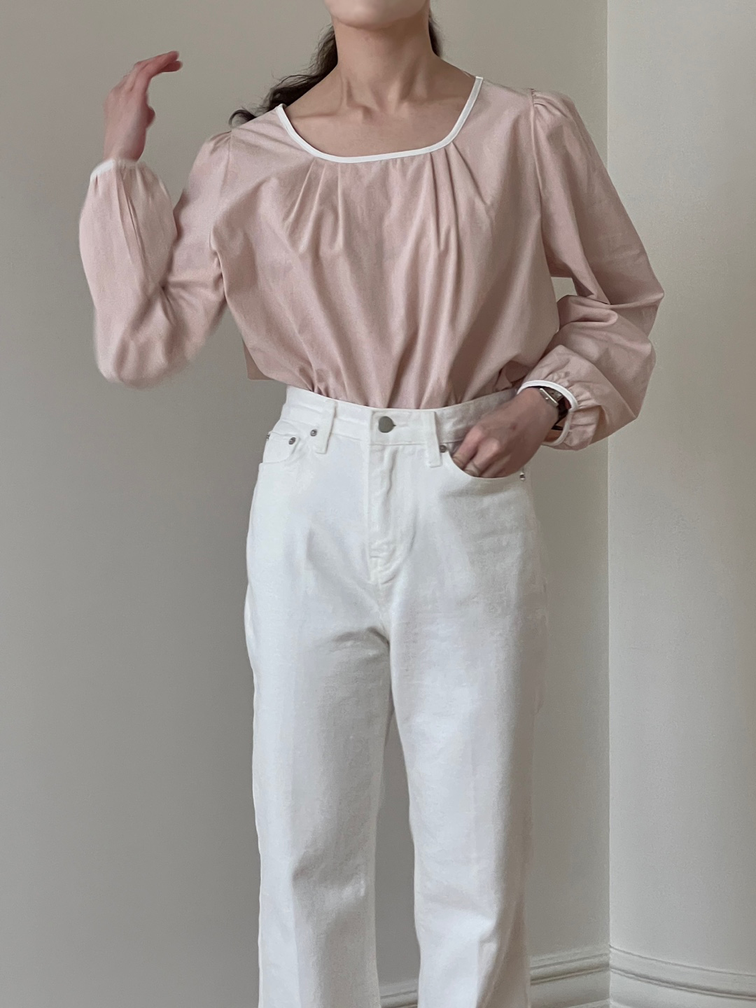 넥라인과 소매단이 아이보리 배색으로 바인딩