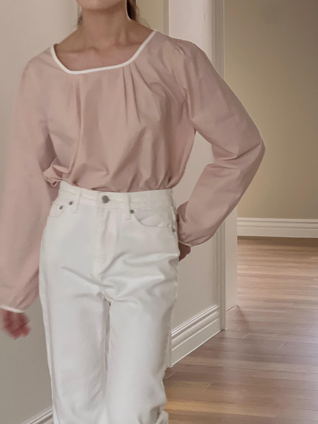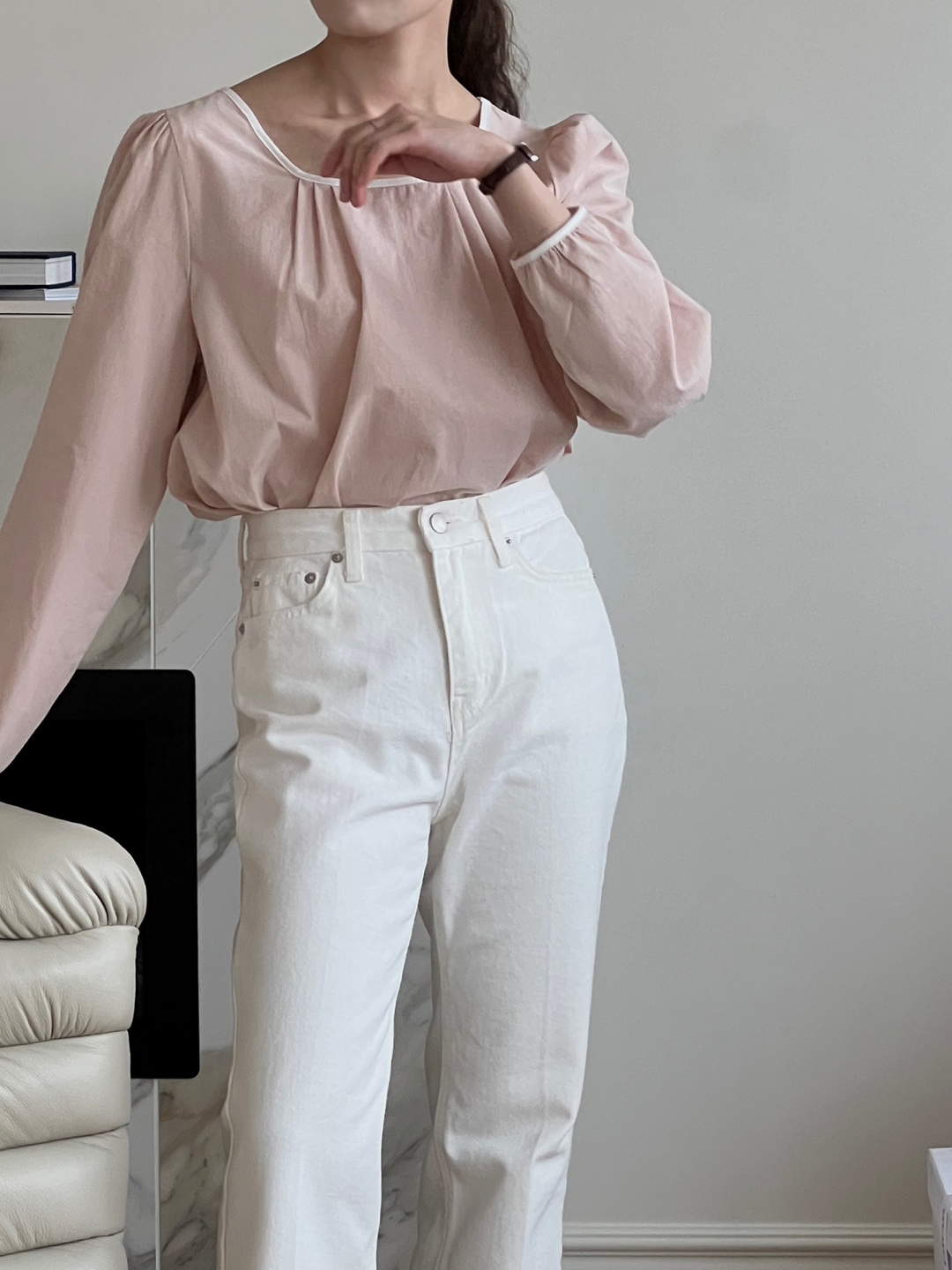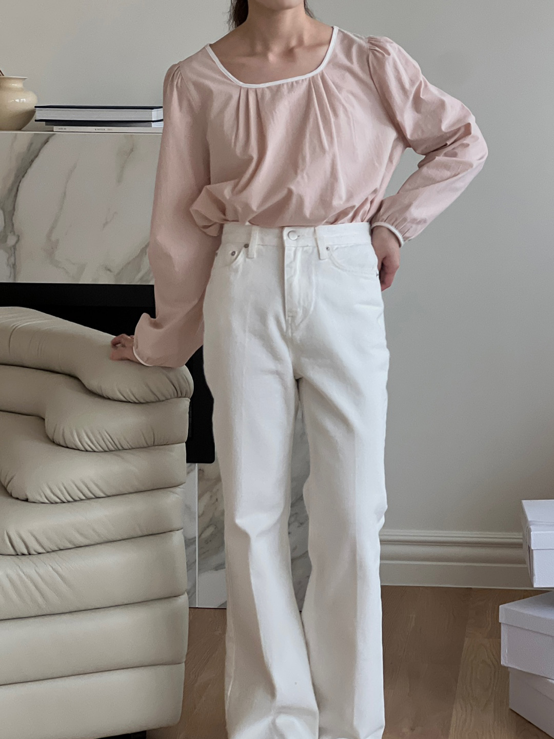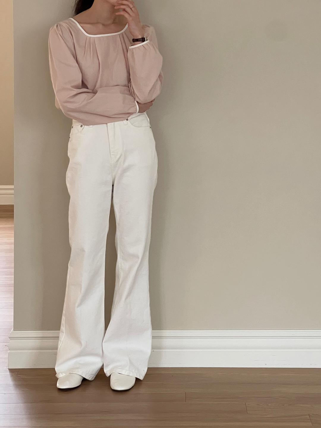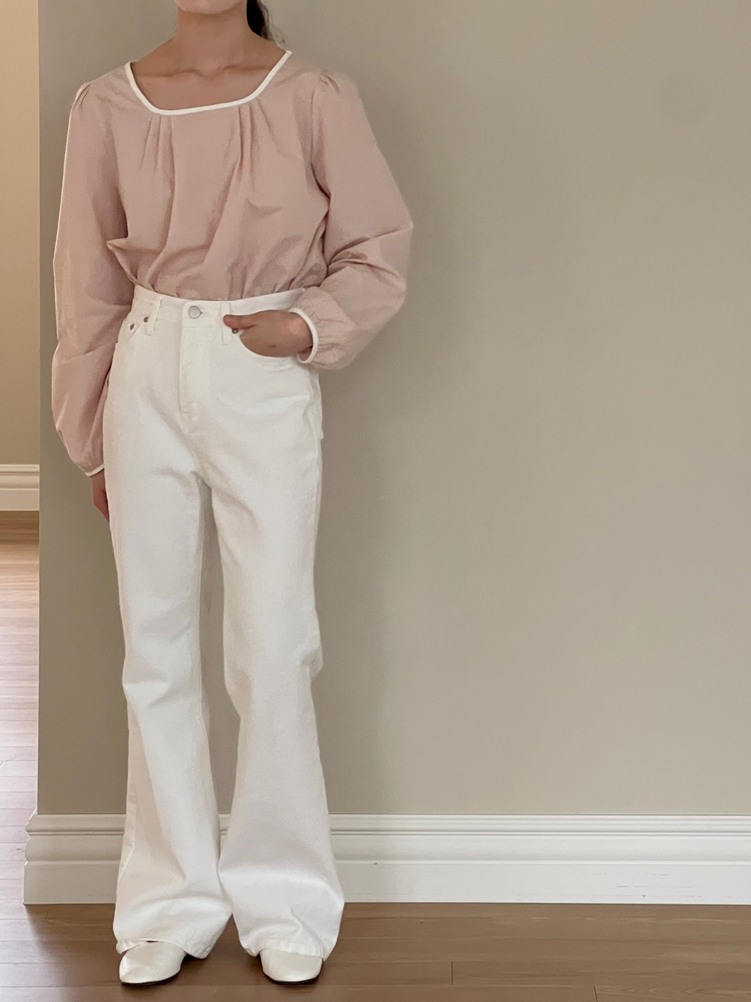 넥라인과 소매단이 아이보리 배색으로 바인딩