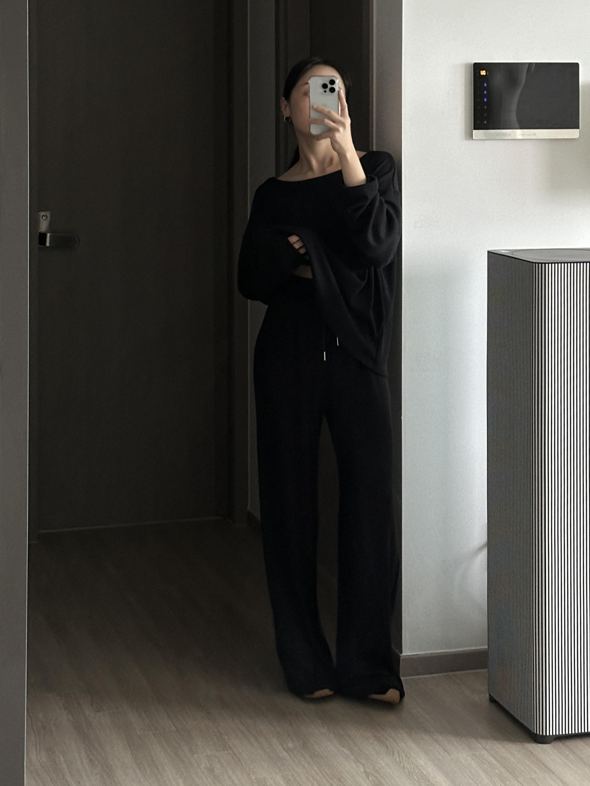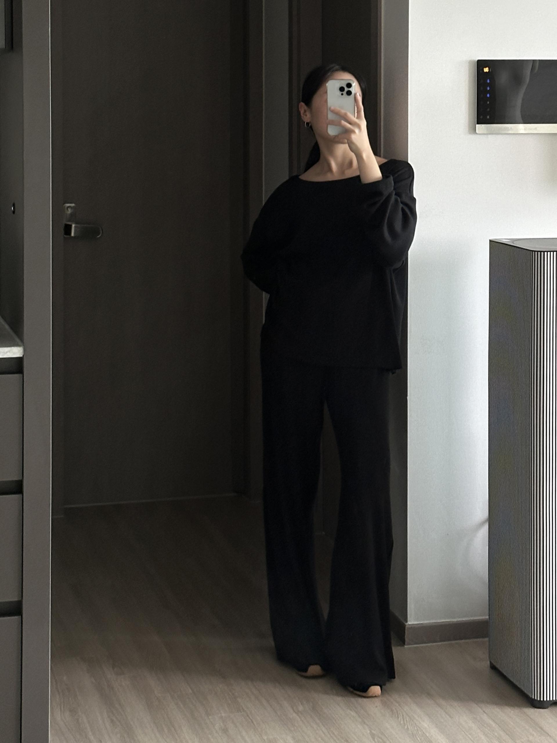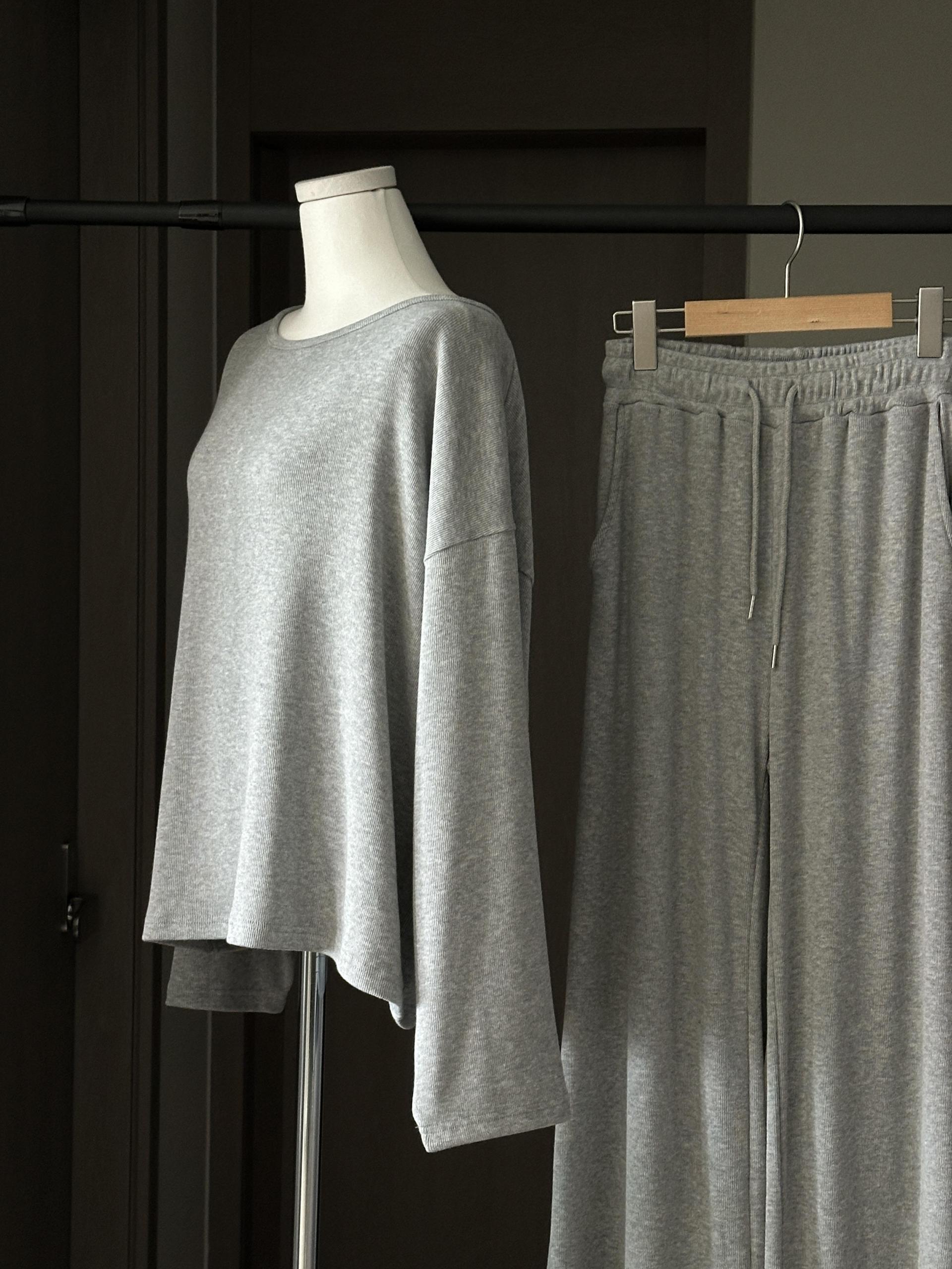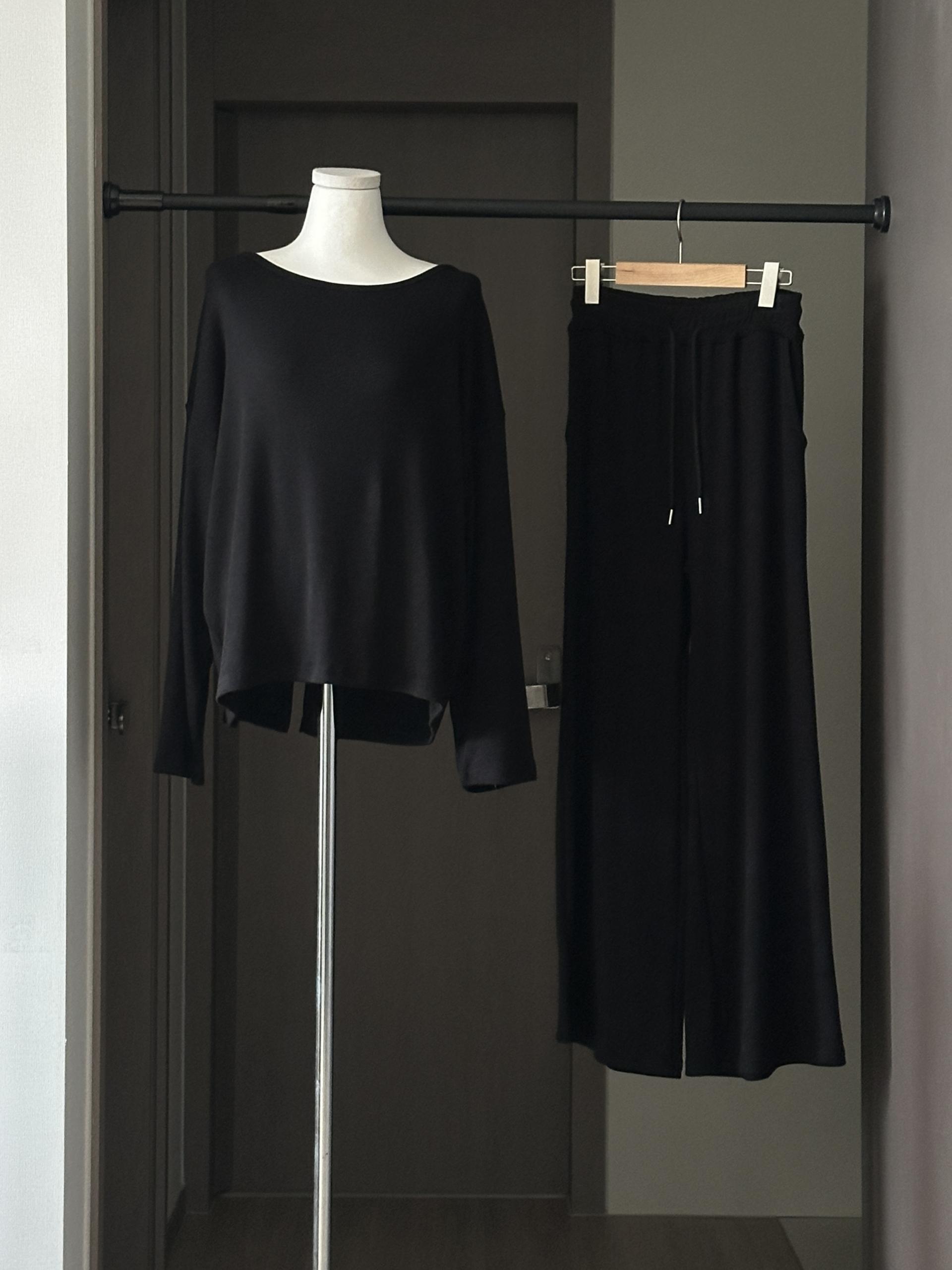 상의는 루즈핏의 롱 슬리브 탑으로 어깨선이