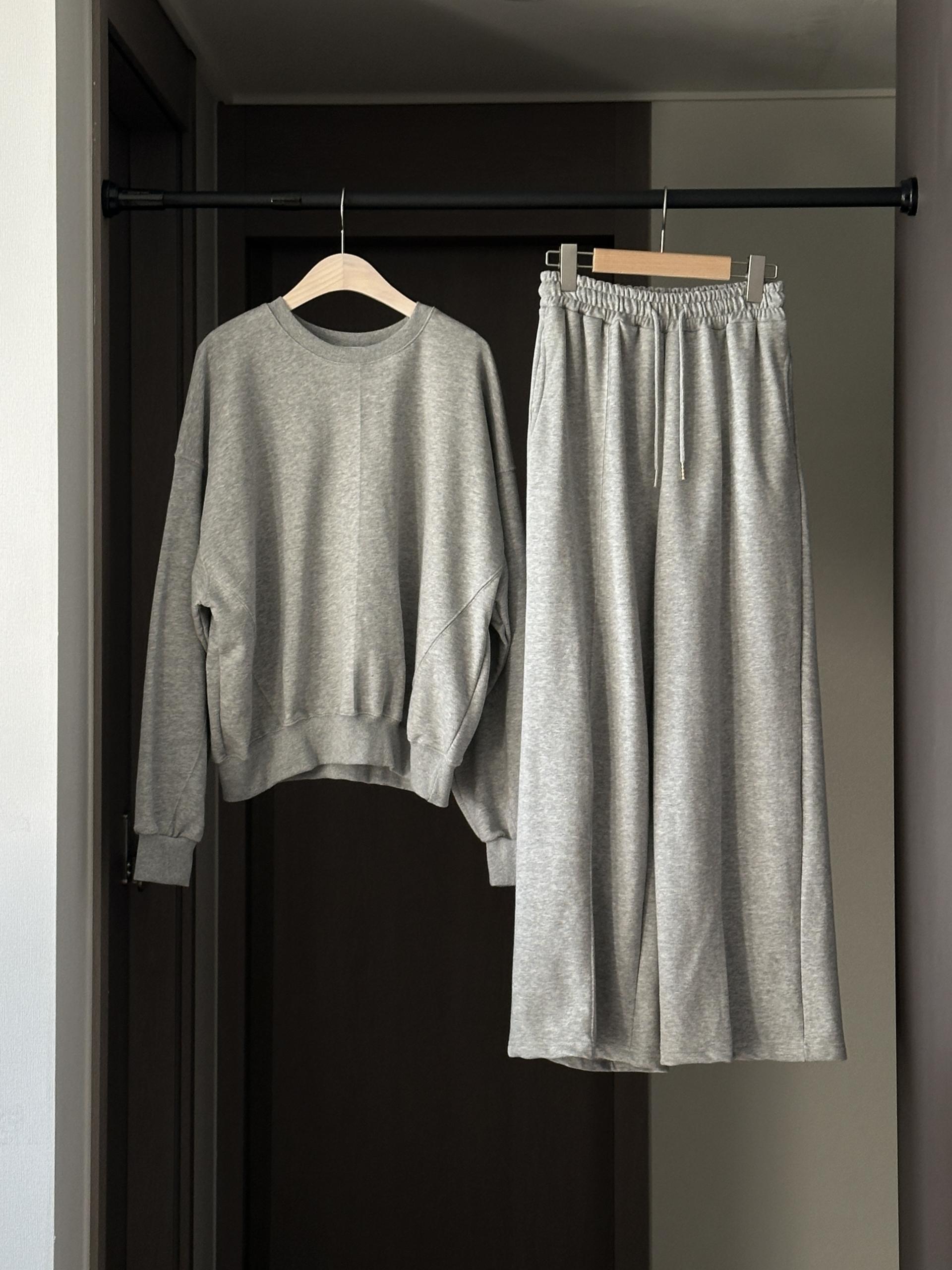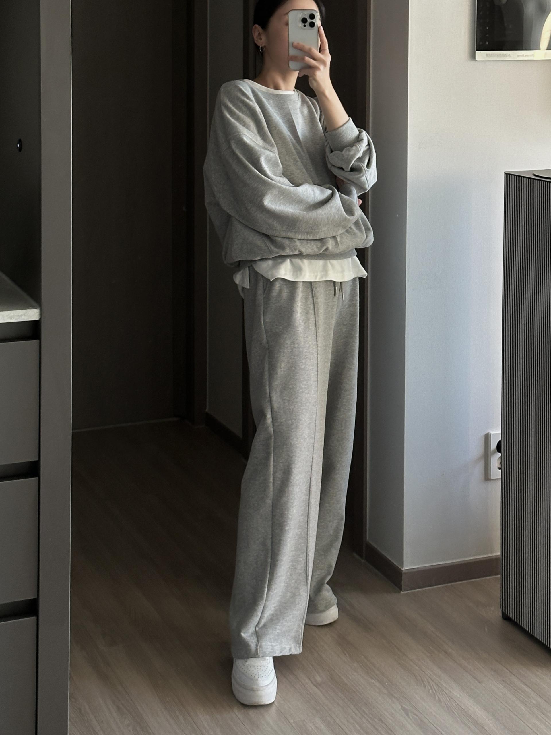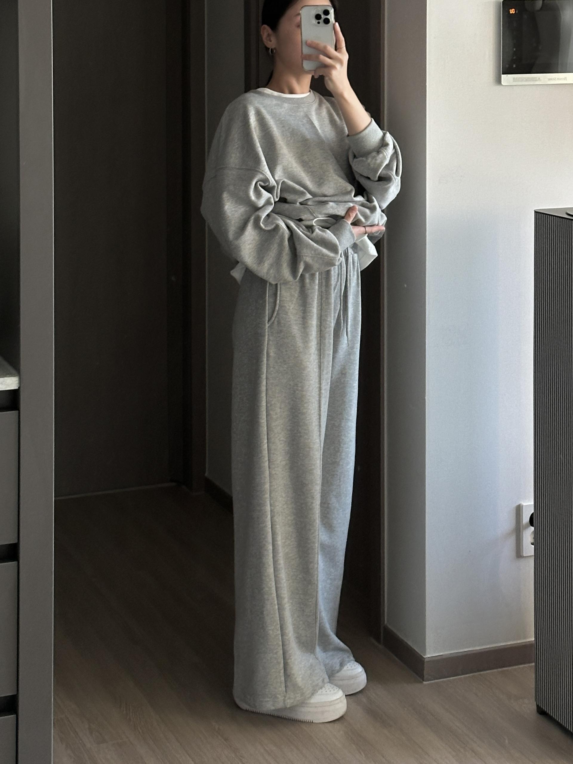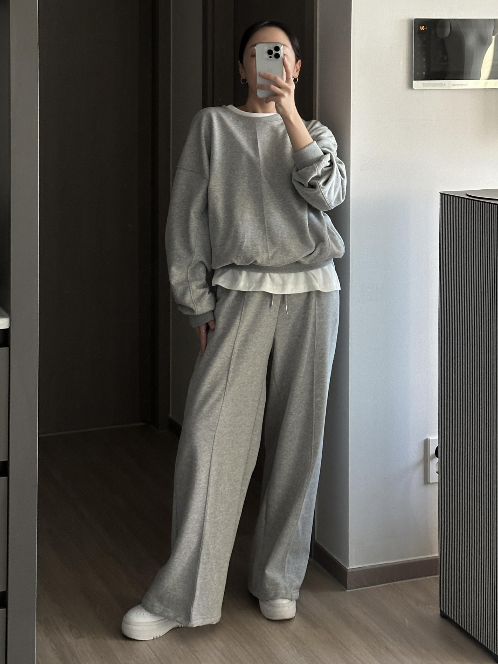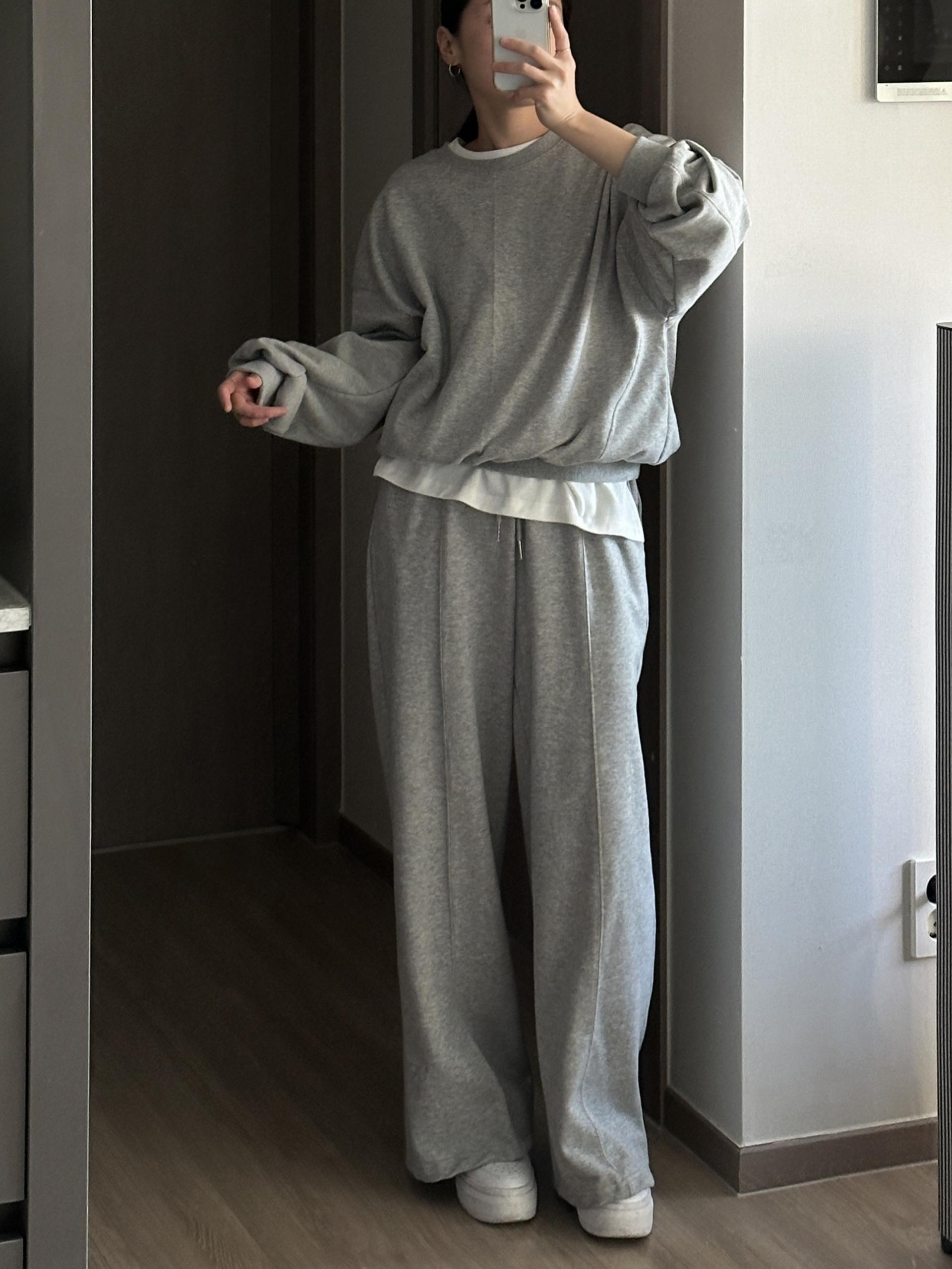루즈핏 맨투맨 와이드 팬츠 구성의 캐쥬얼 세트에요.