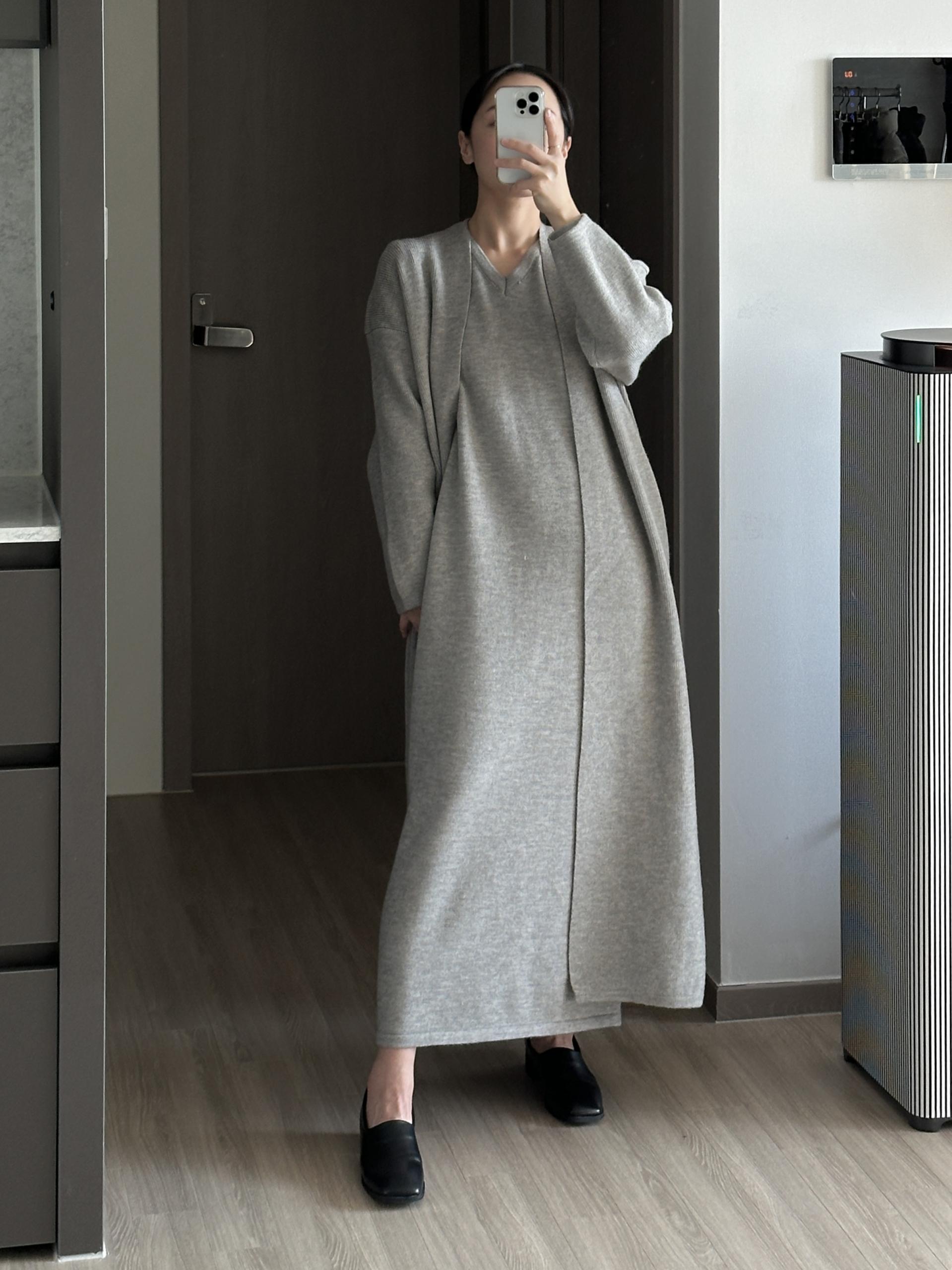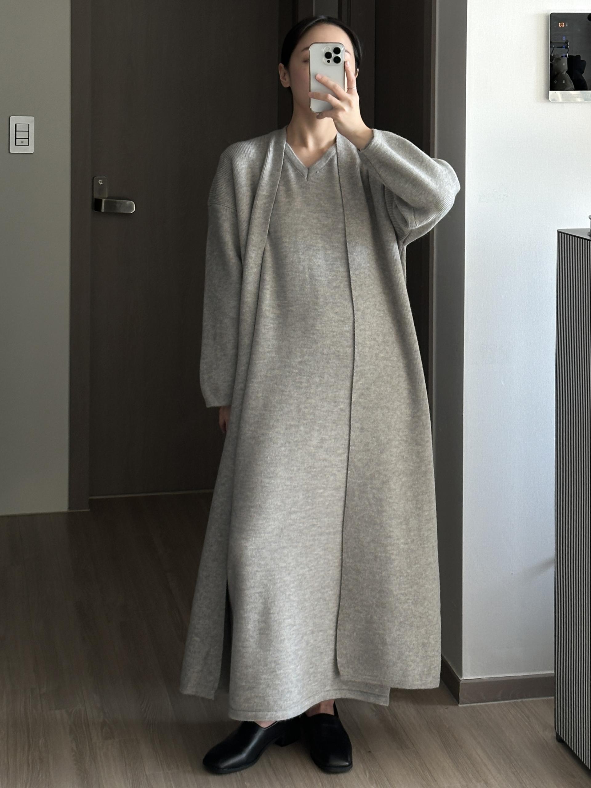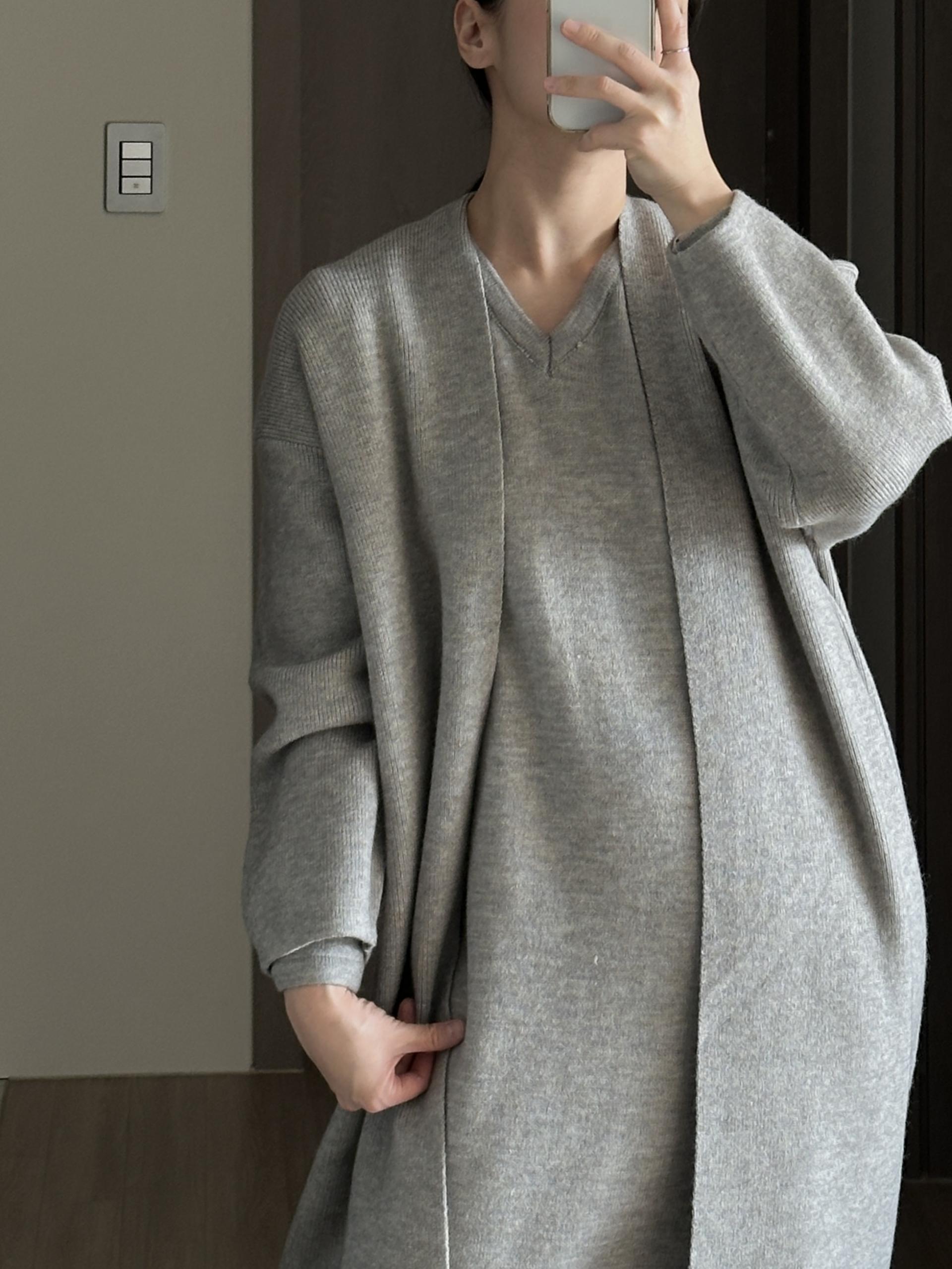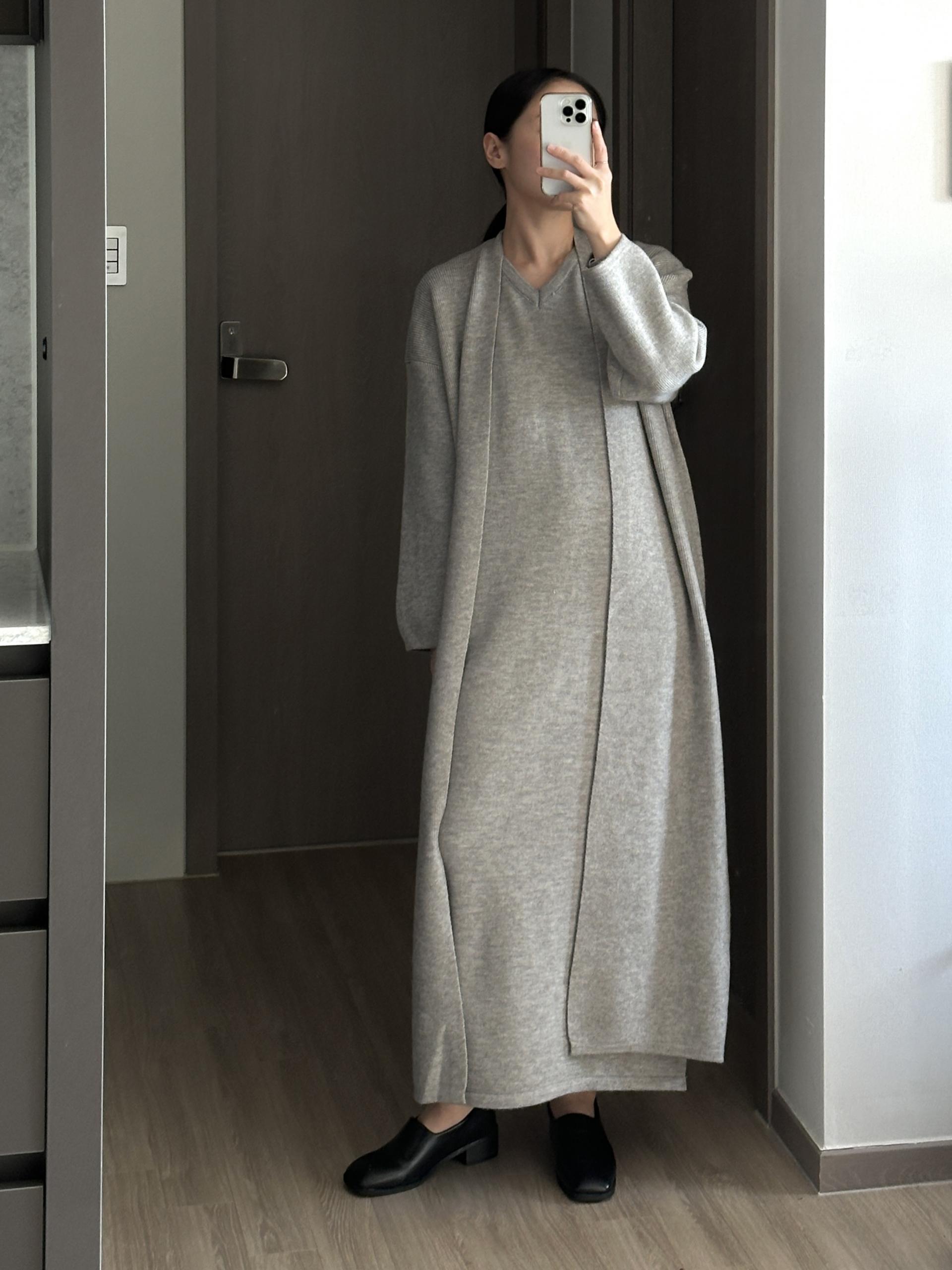 브이넥 니트 원피스에 같은 짜임의 롱 가디건을 매치하여