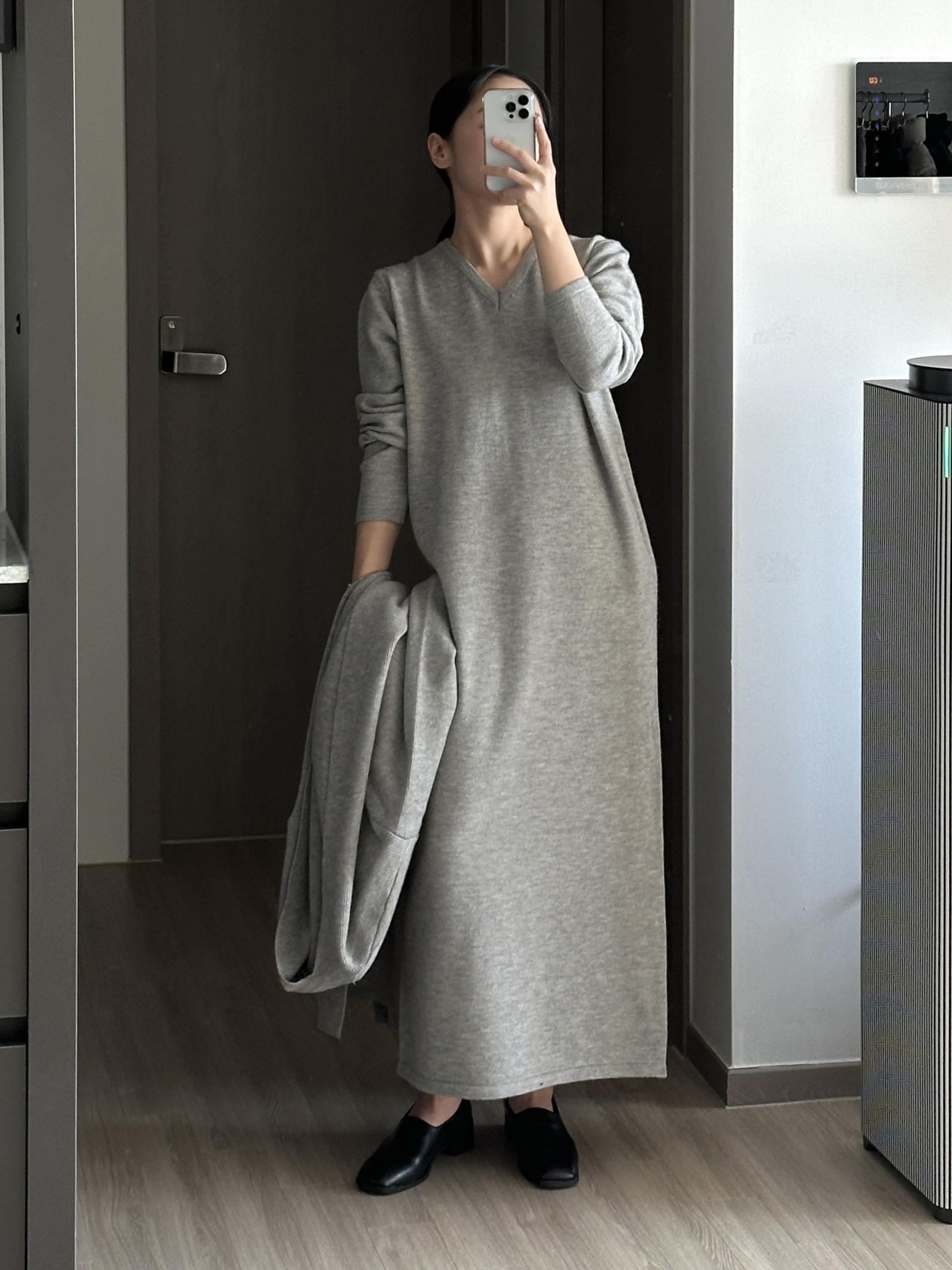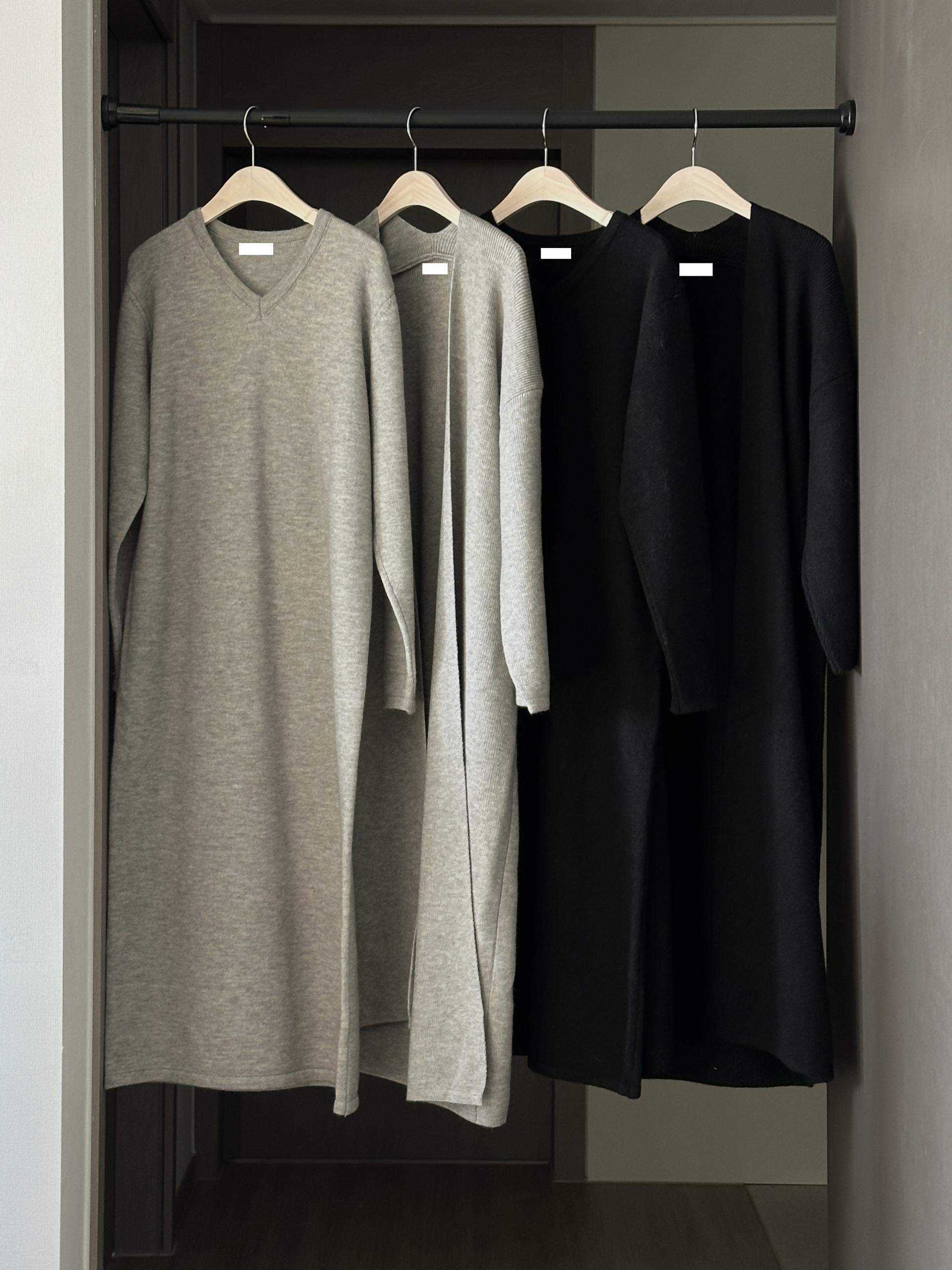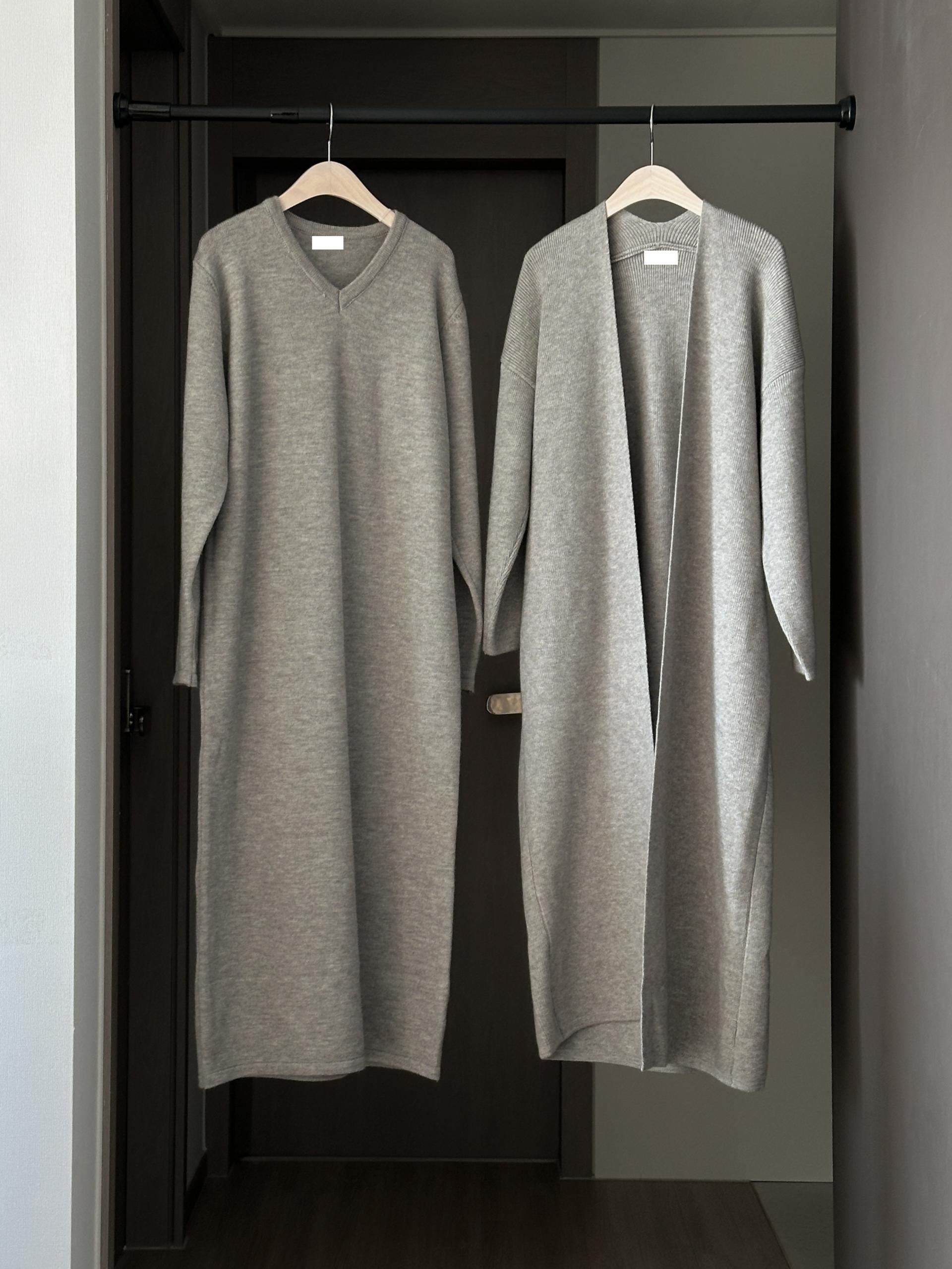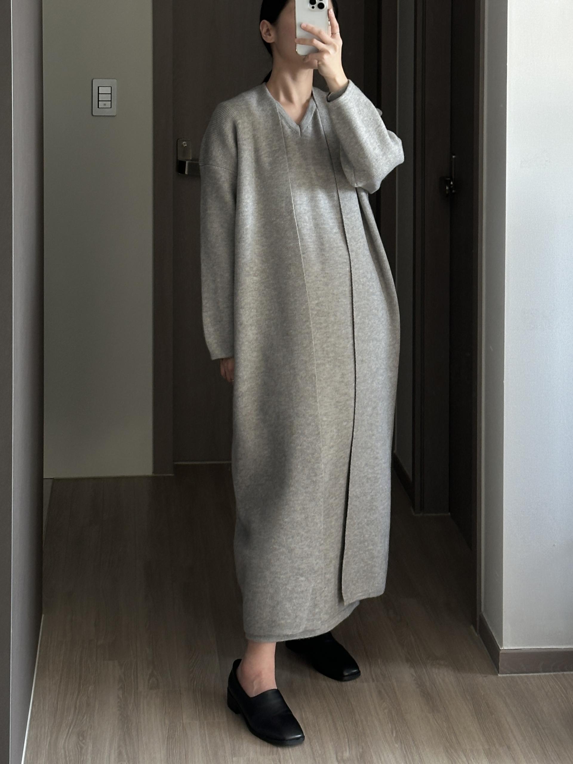 브이넥 니트 원피스에 같은 짜임의 롱 가디건을 매치하여