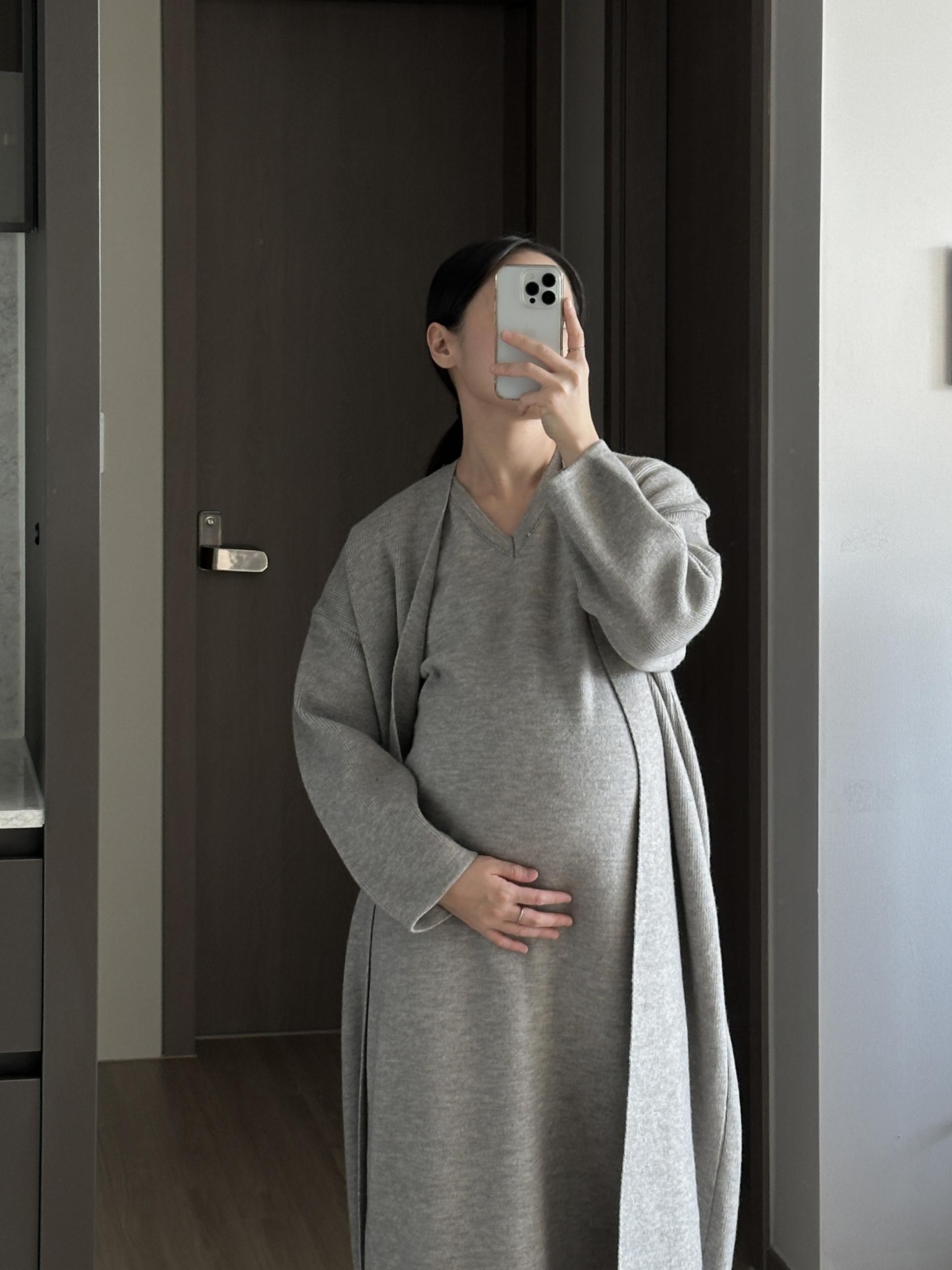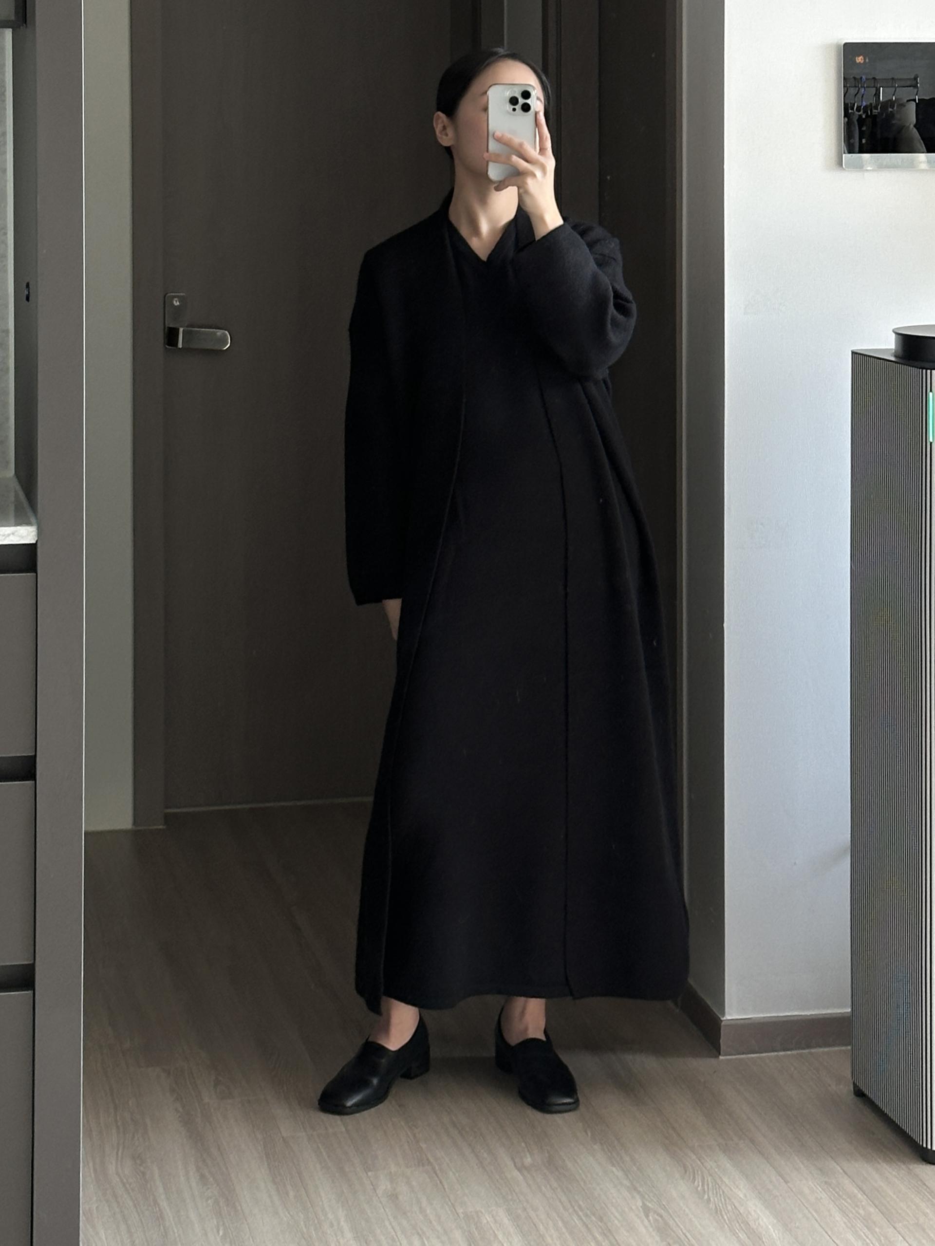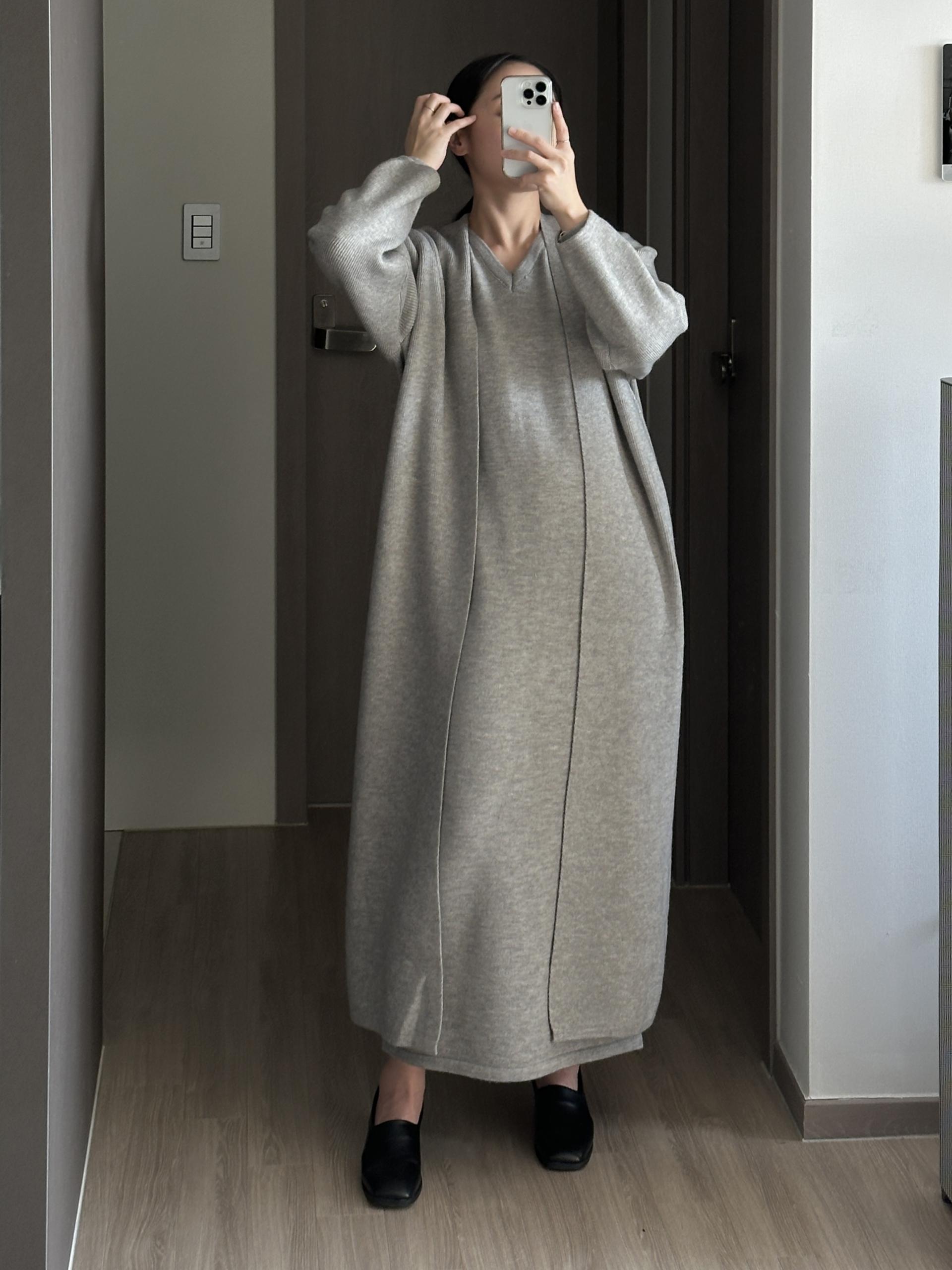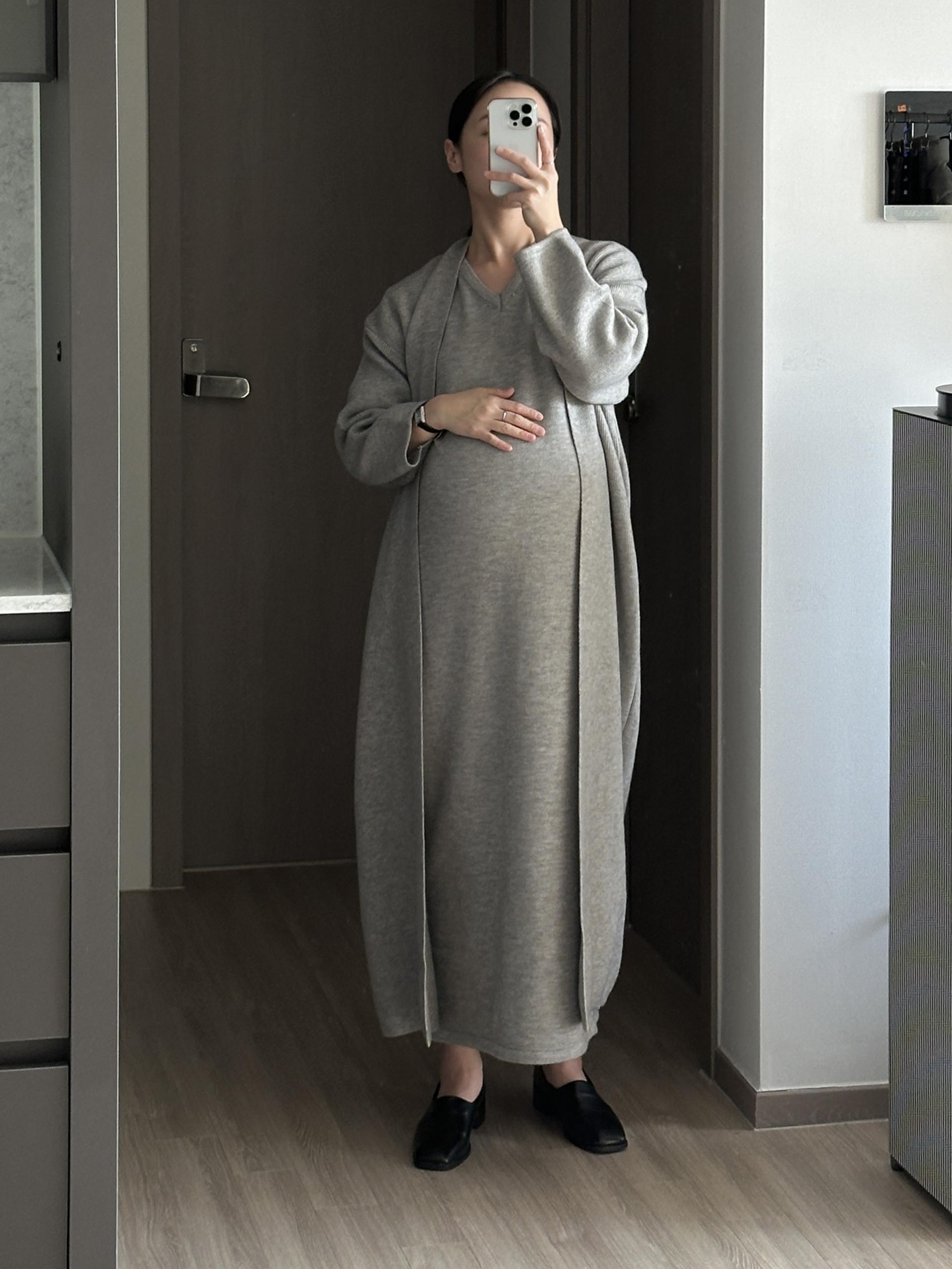 브이넥 니트 원피스에 같은 짜임의 롱 가디건을 매치하여