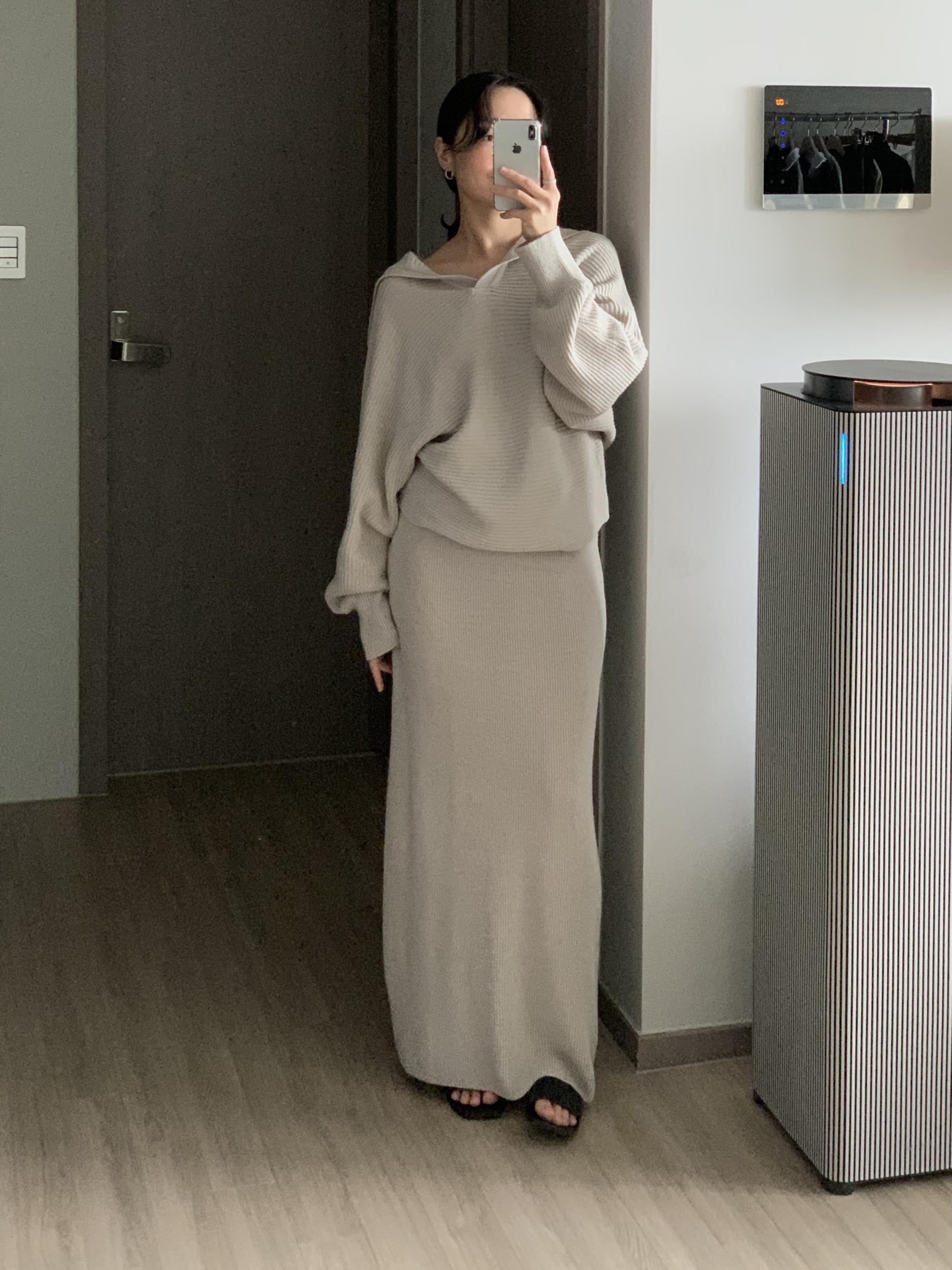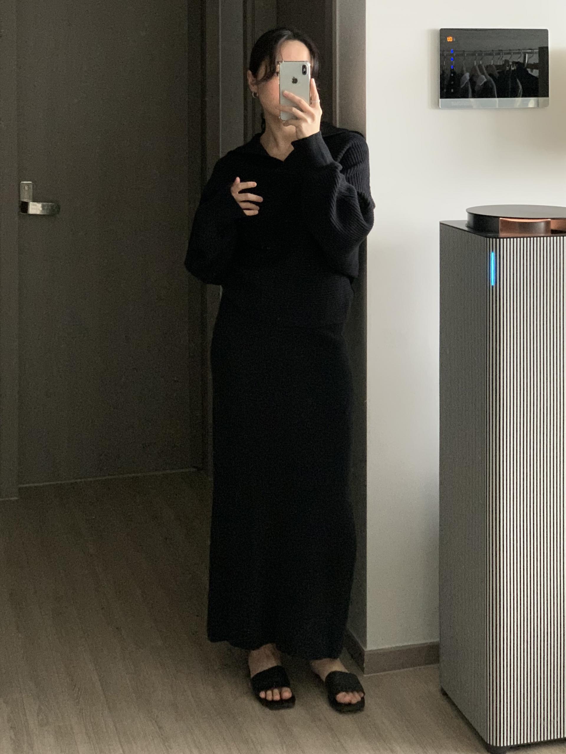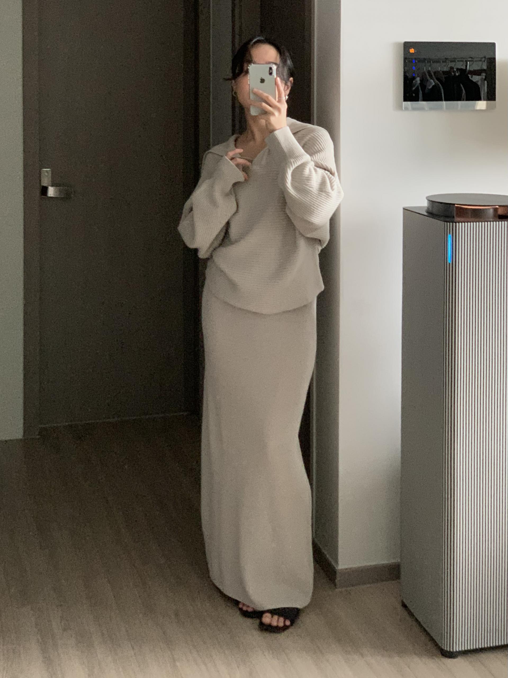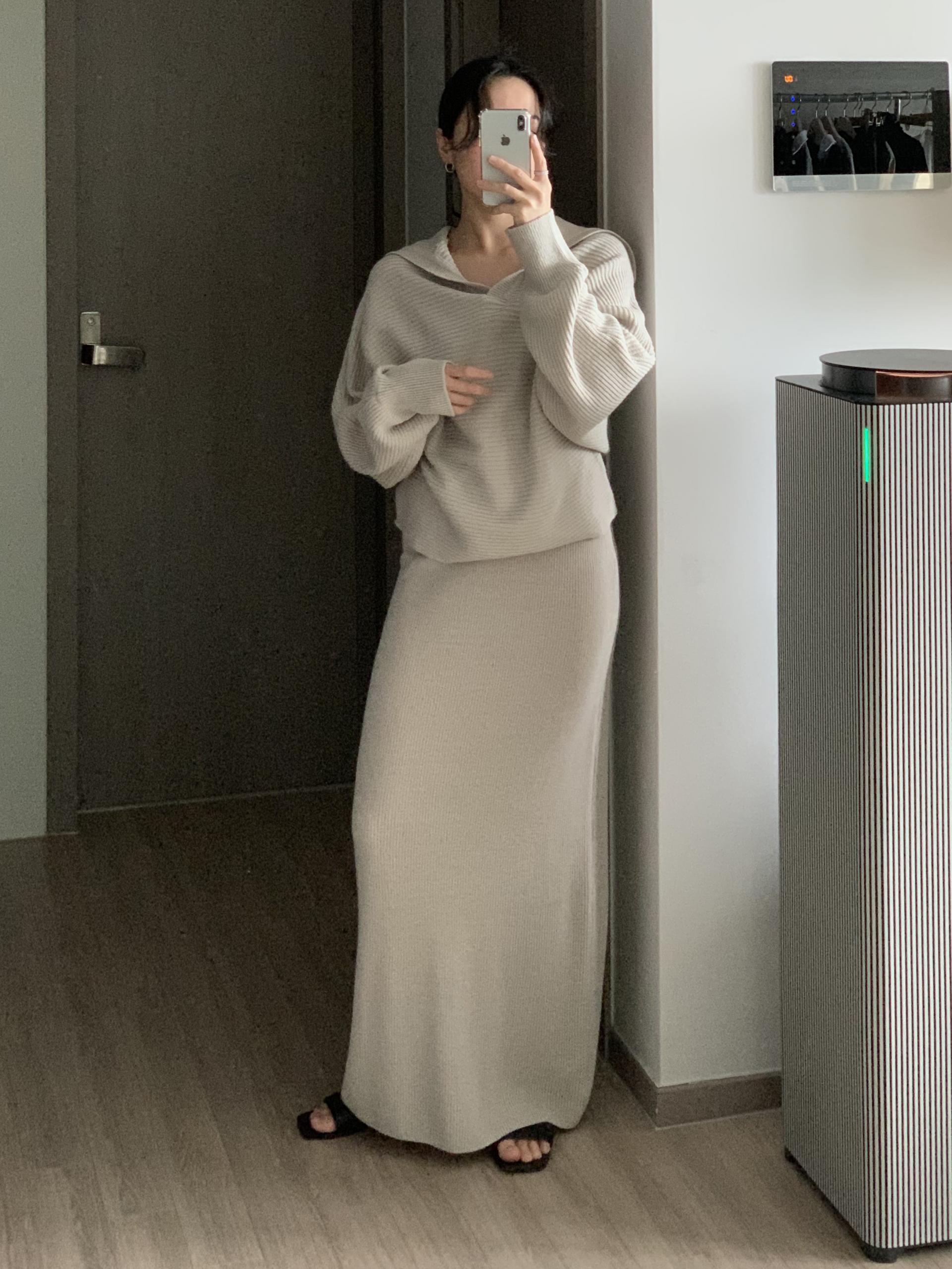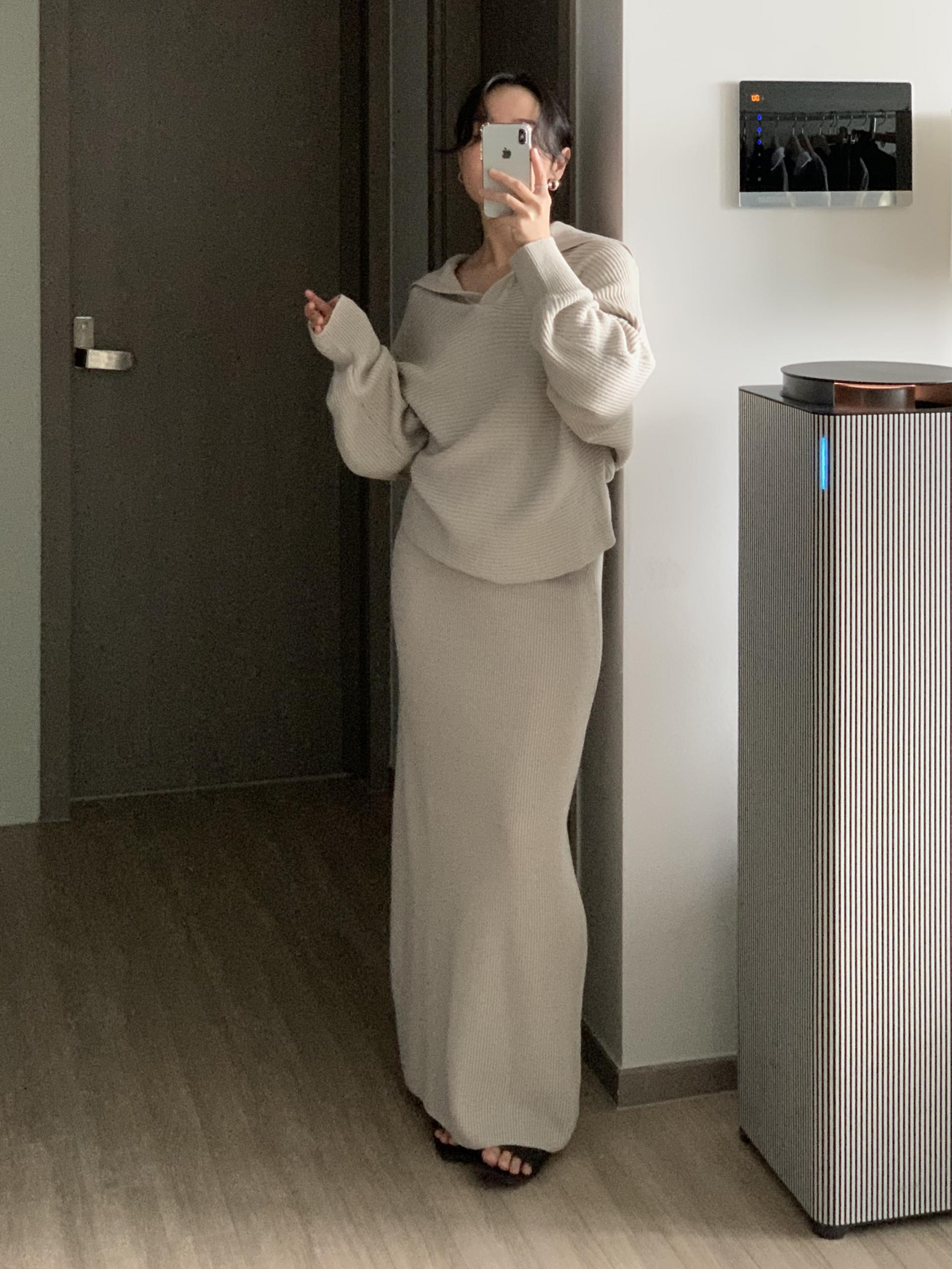 스커트는 일자 패턴으로 군더더기 없이 차분한 핏으로 연출 되구요.