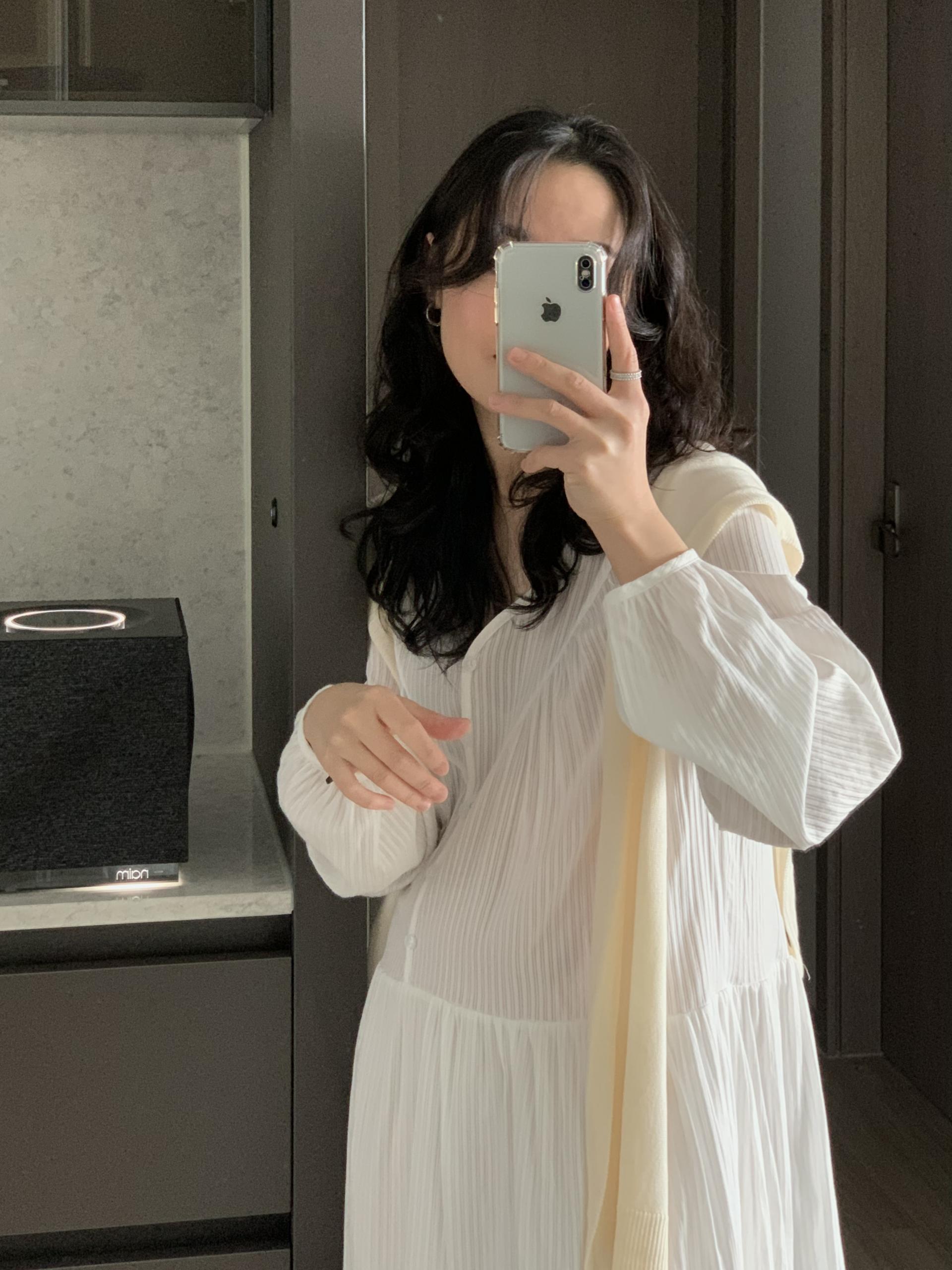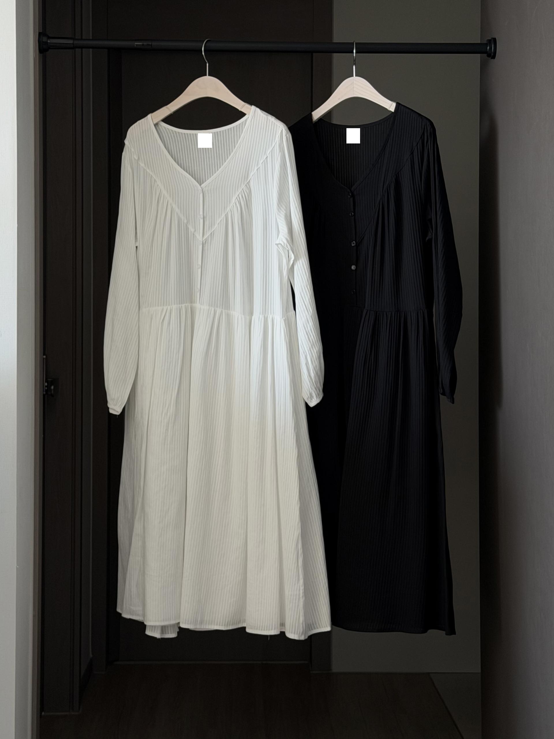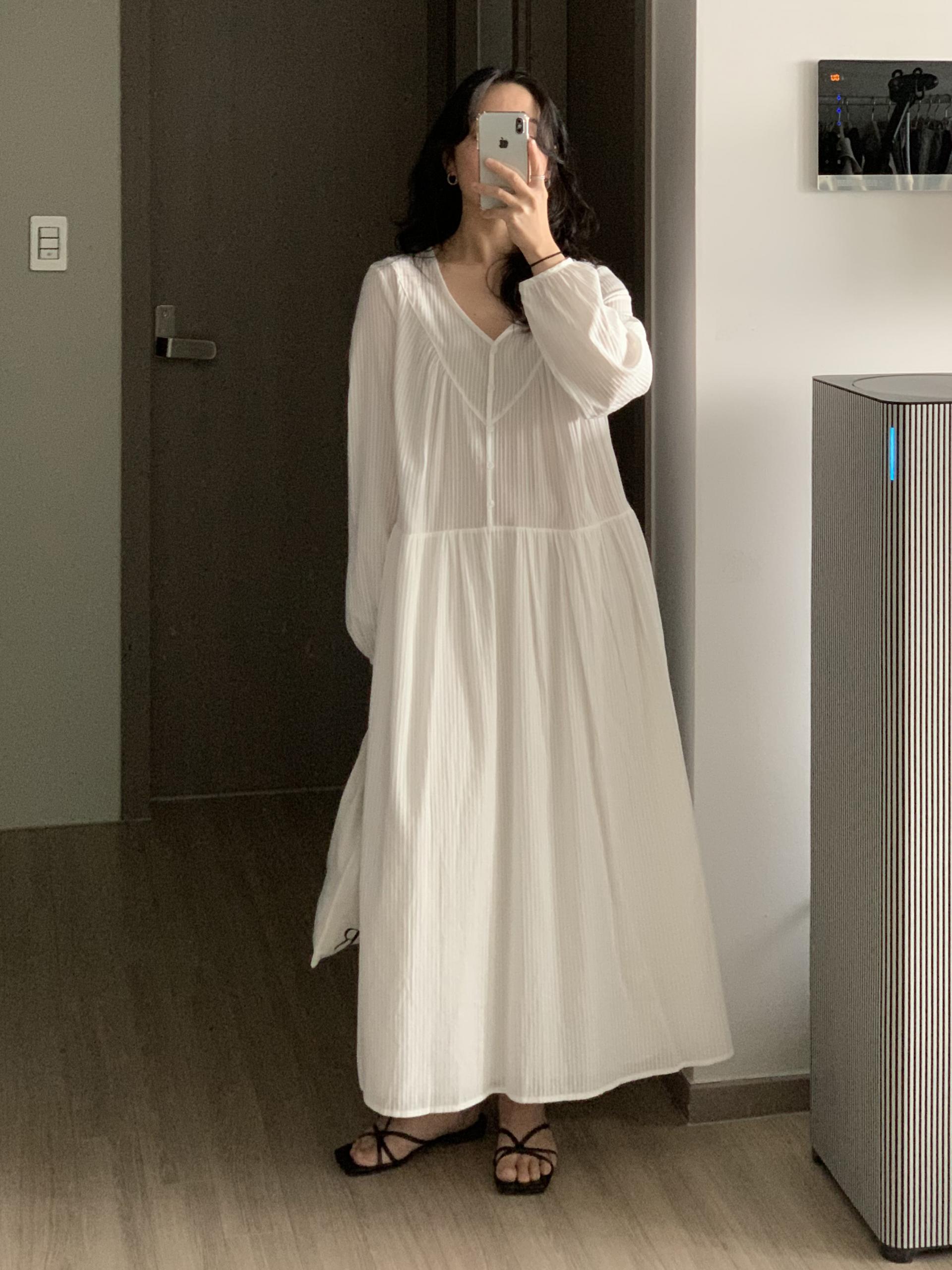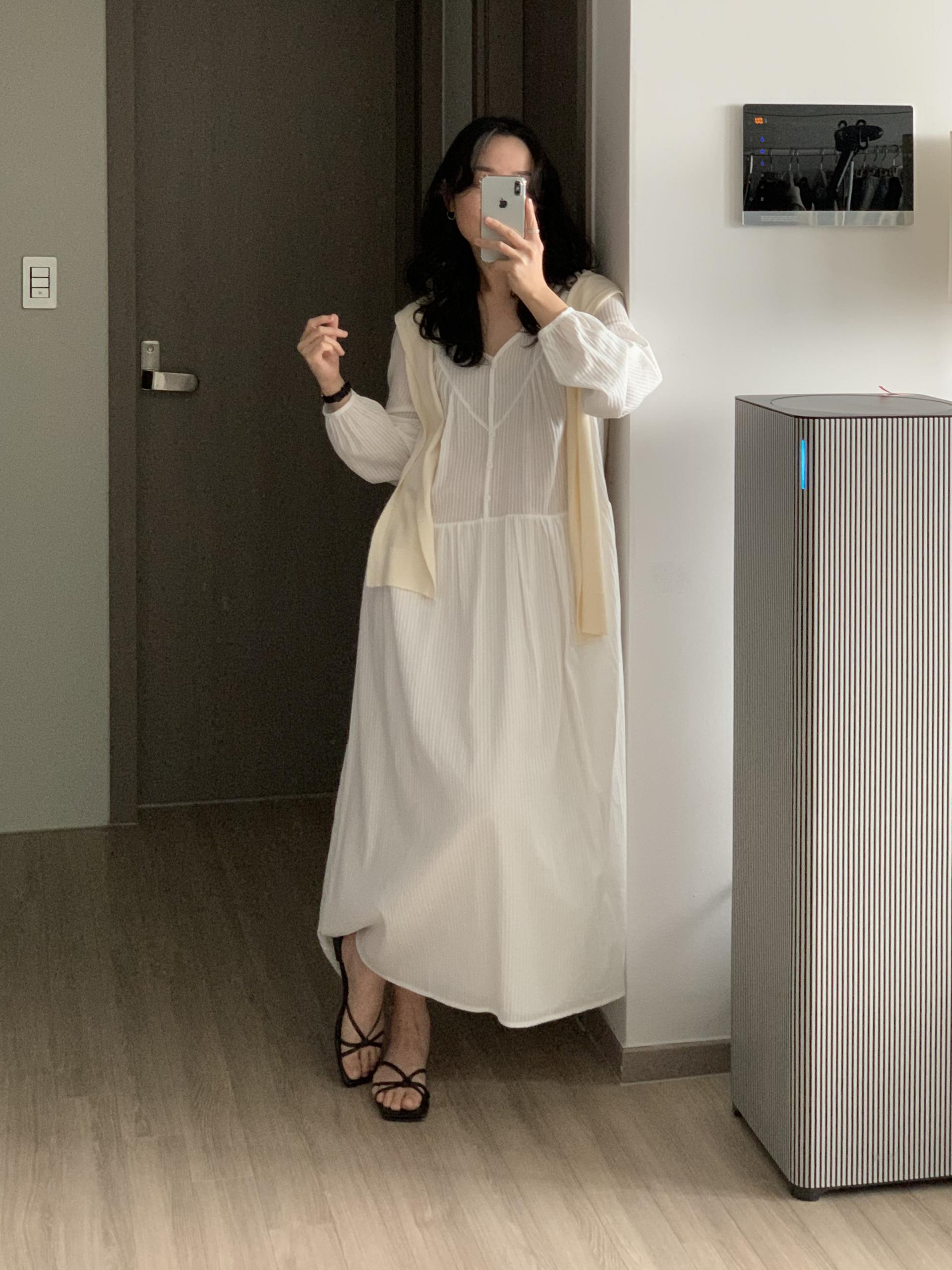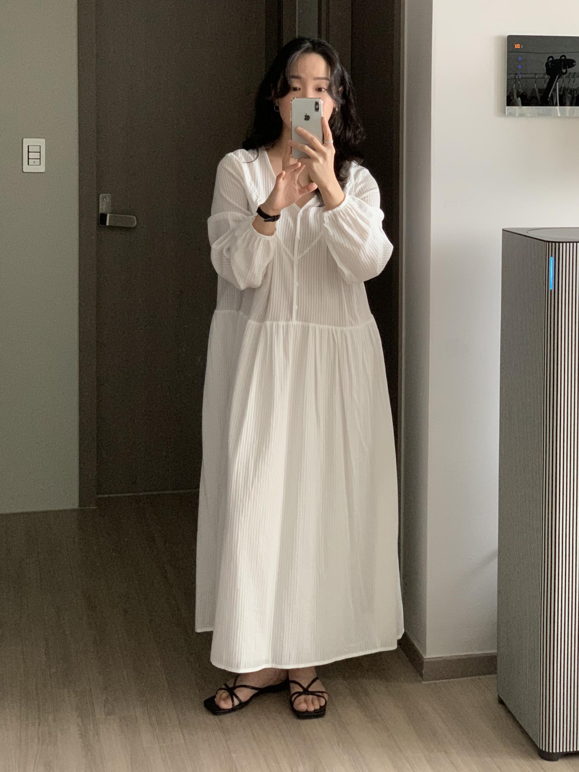 넥라인을 얇고 길게 연출해주며 부담없이 즐기기 좋은 원피스에요.