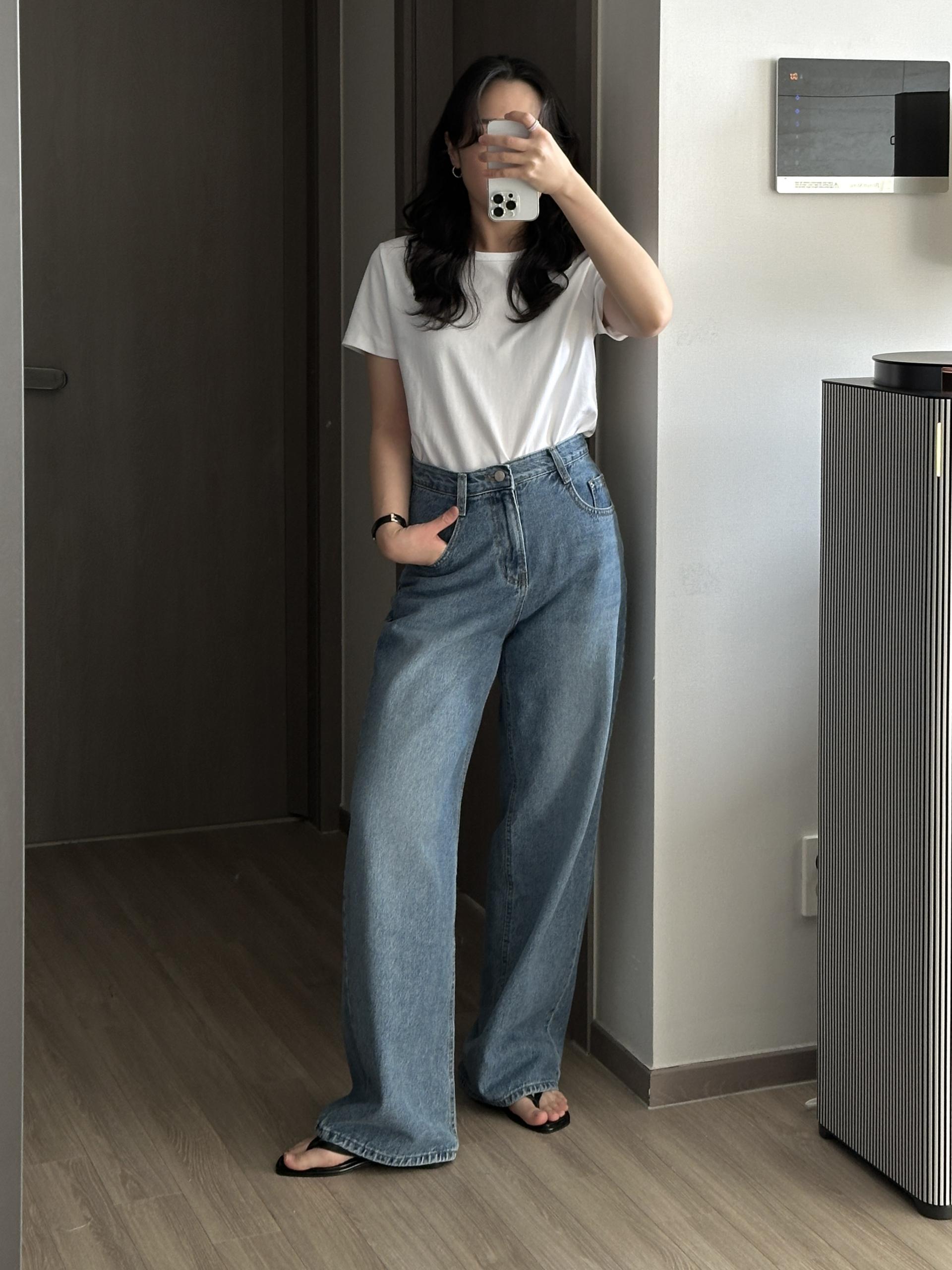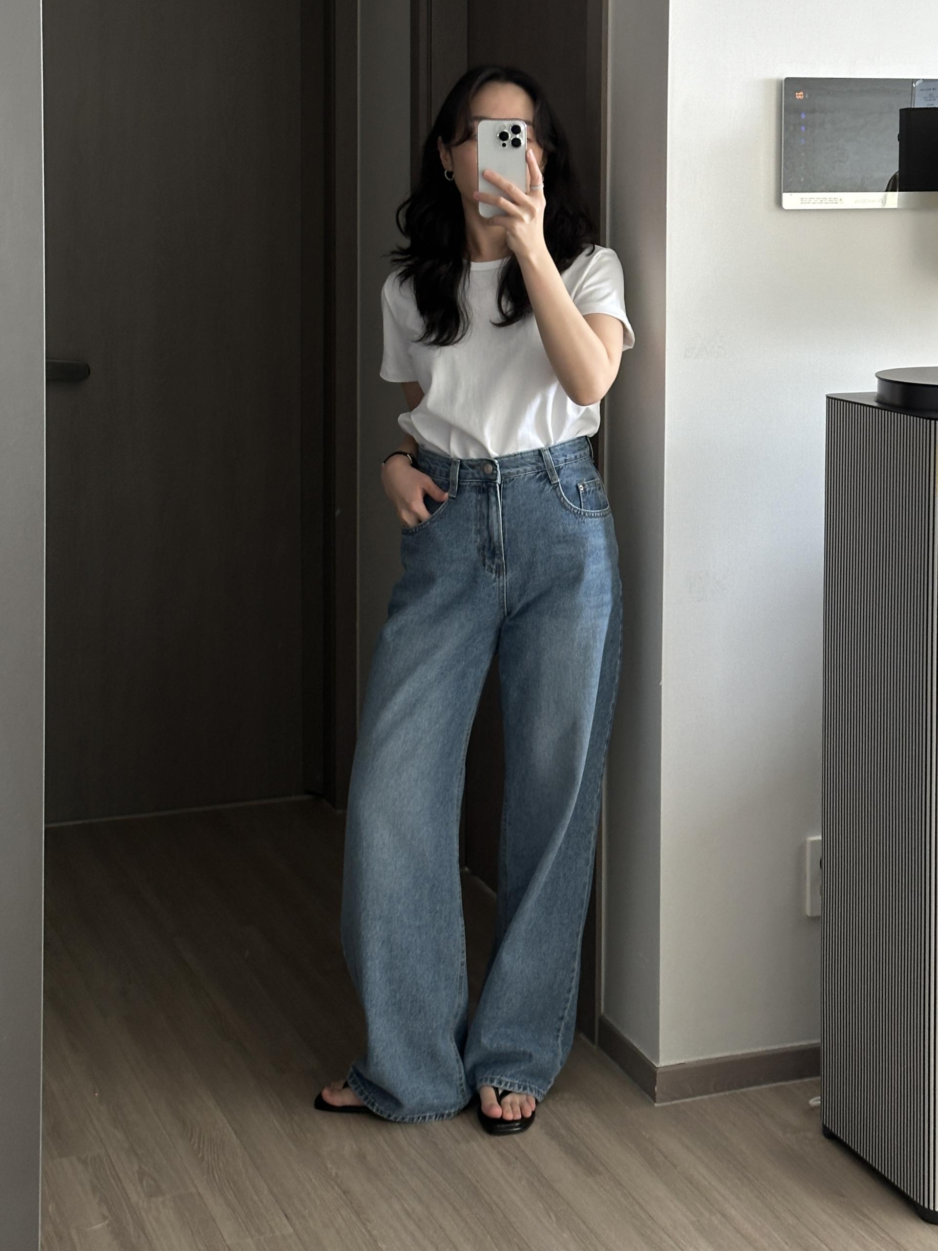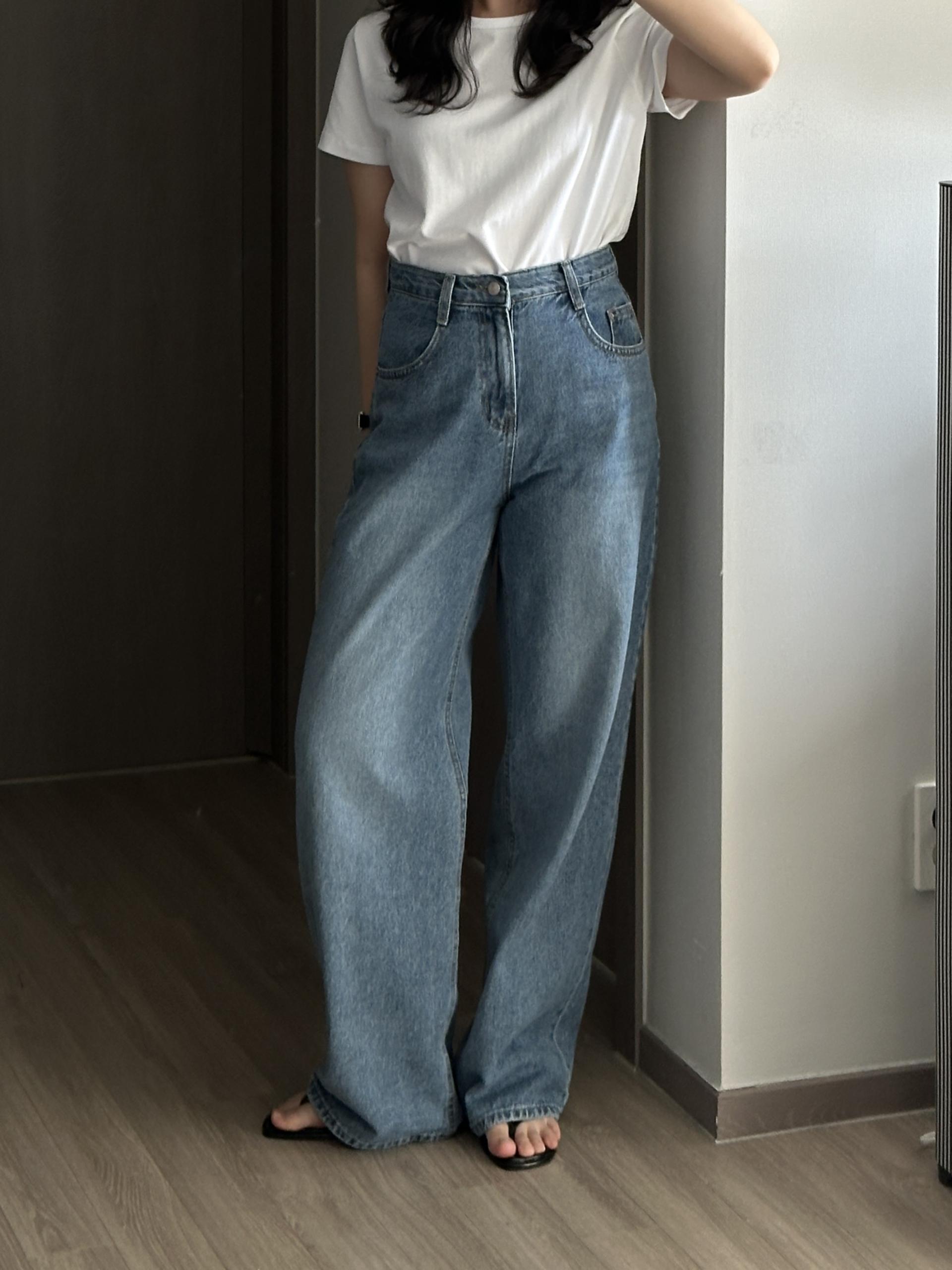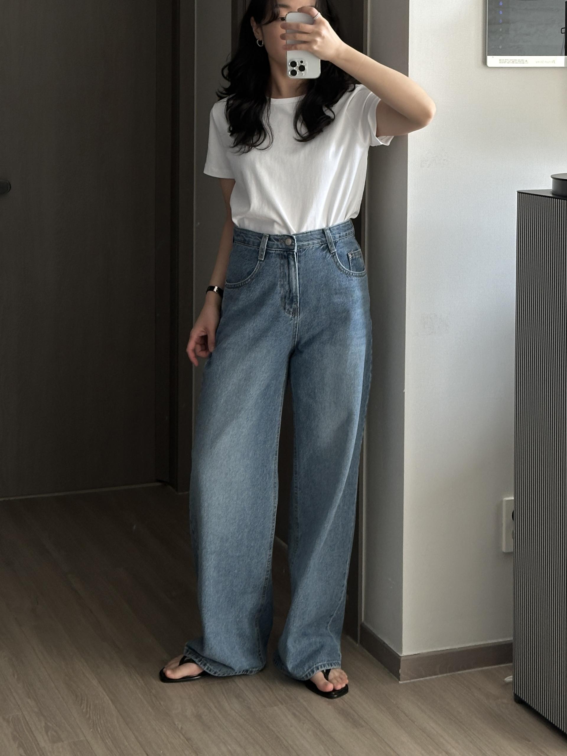 여유 있게 떨어지는 와이드 핏의 중청 데님이에요.