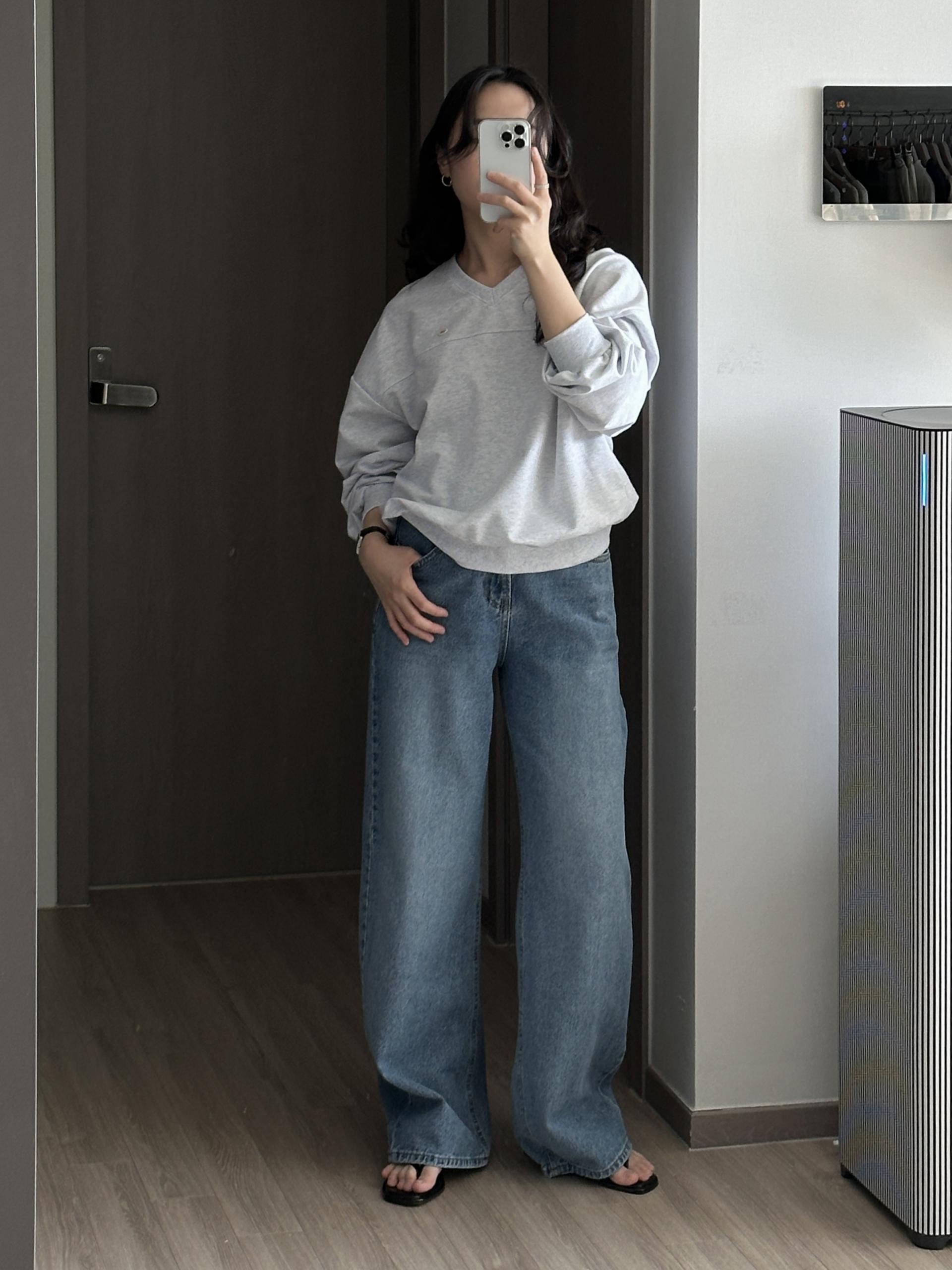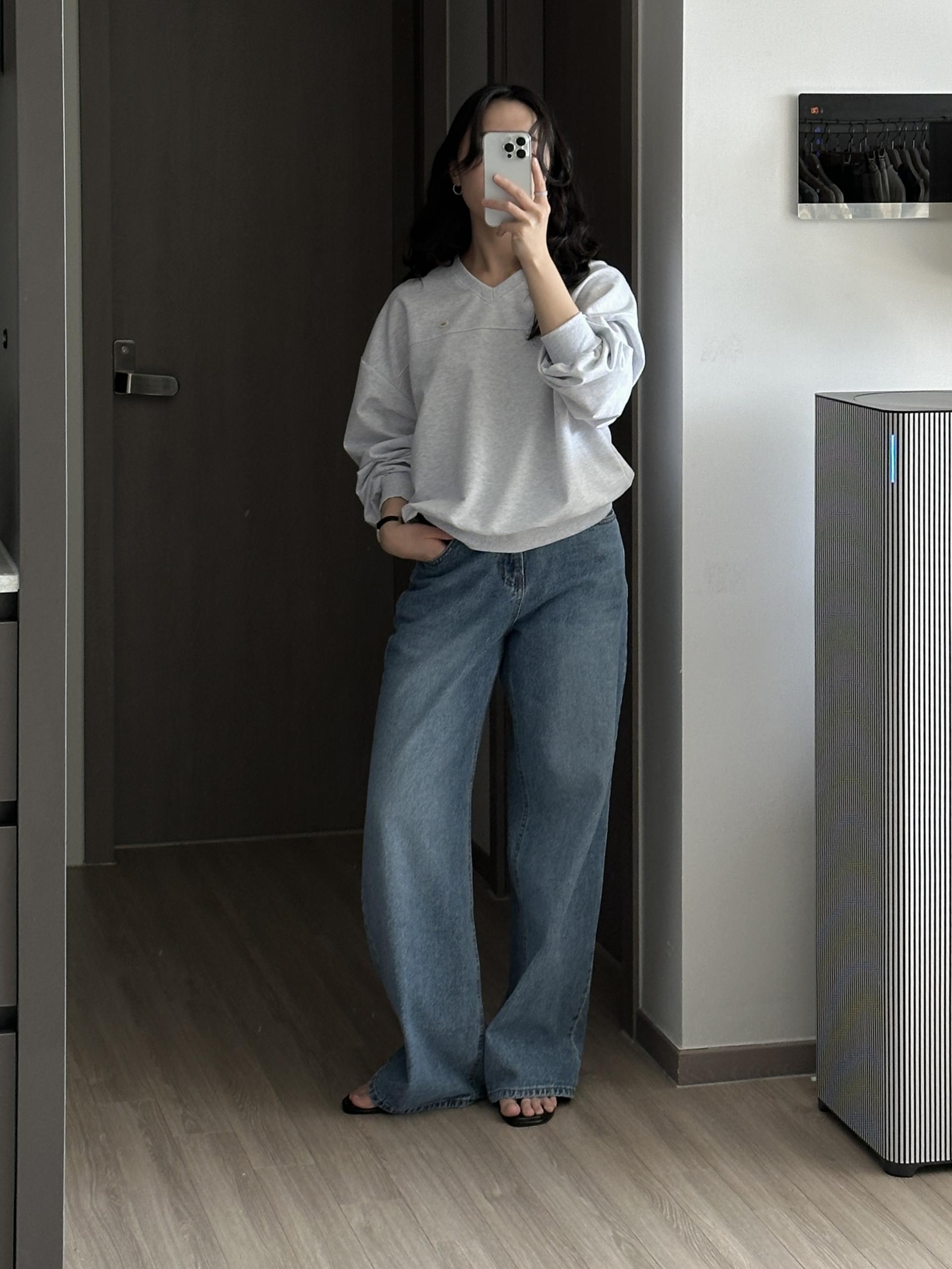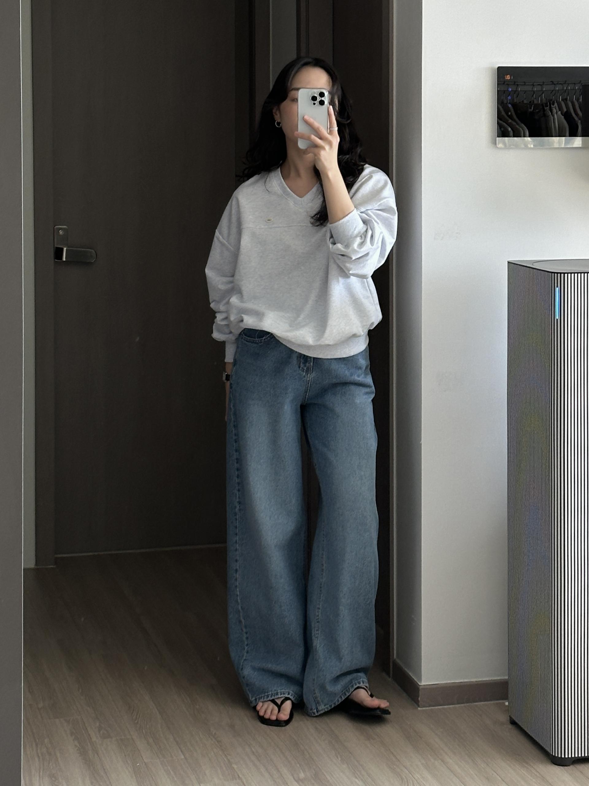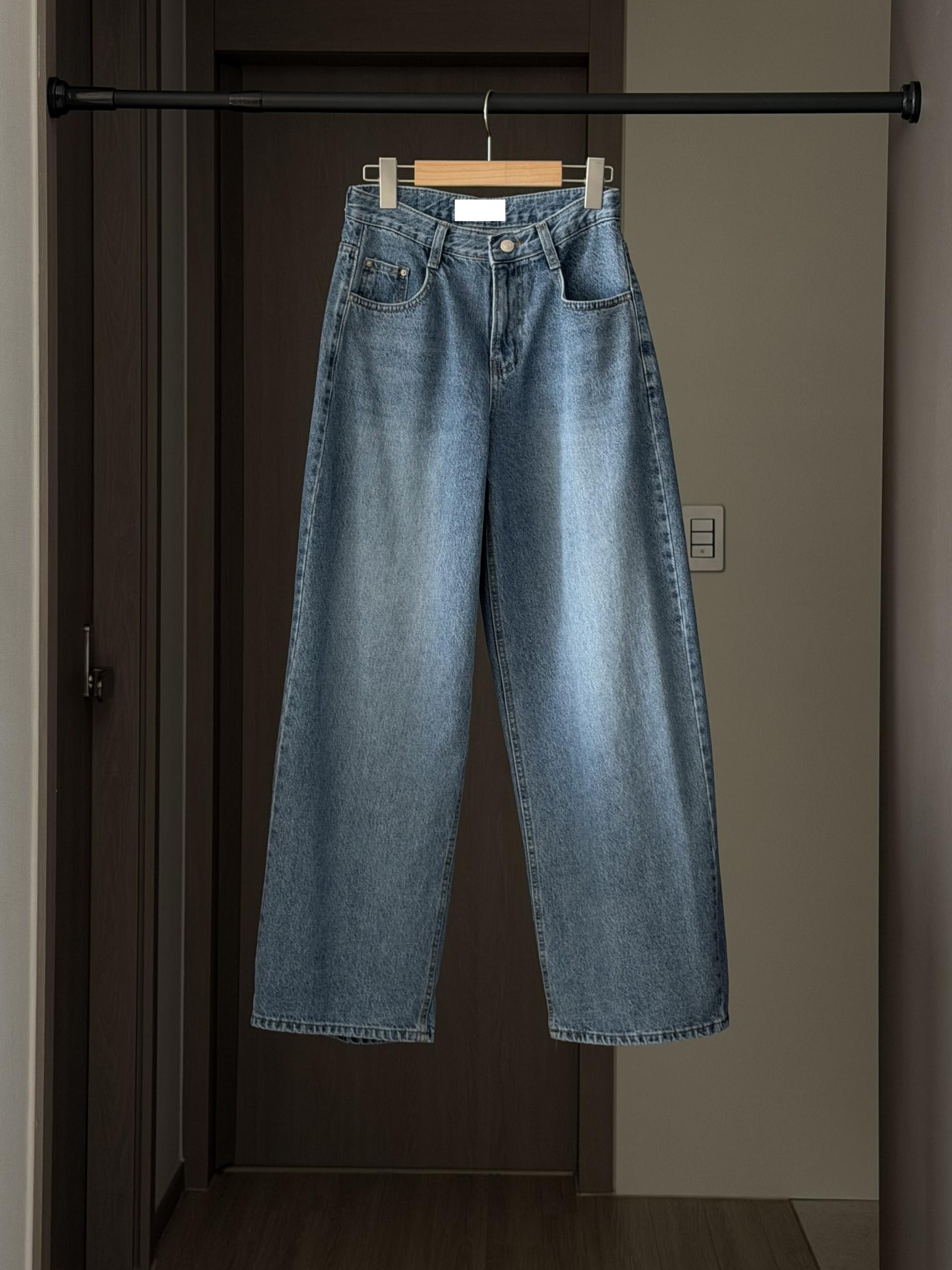 여유 있게 떨어지는 와이드 핏의 중청 데님이에요.