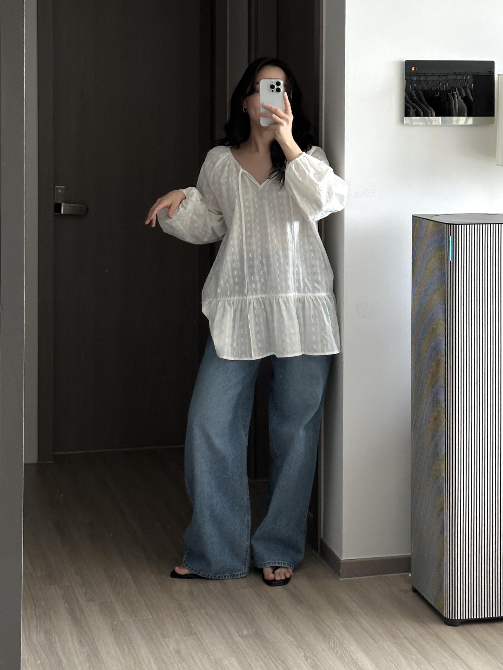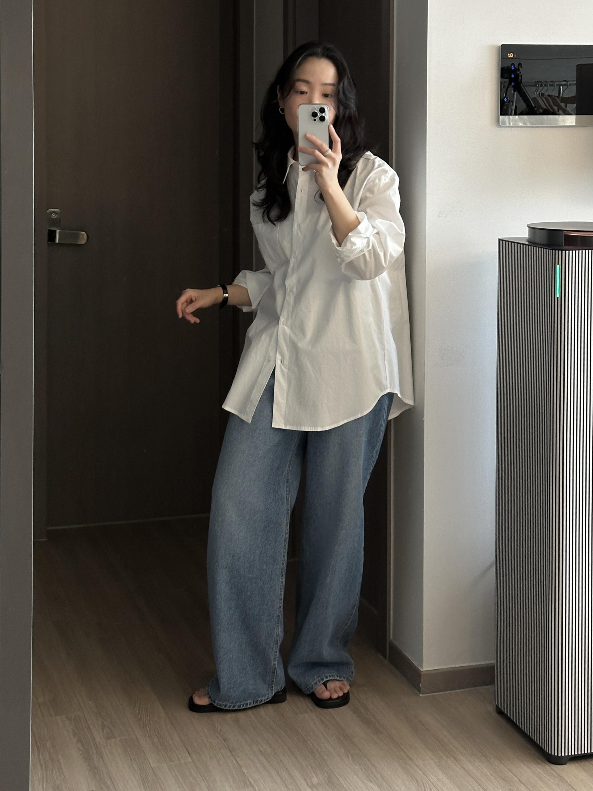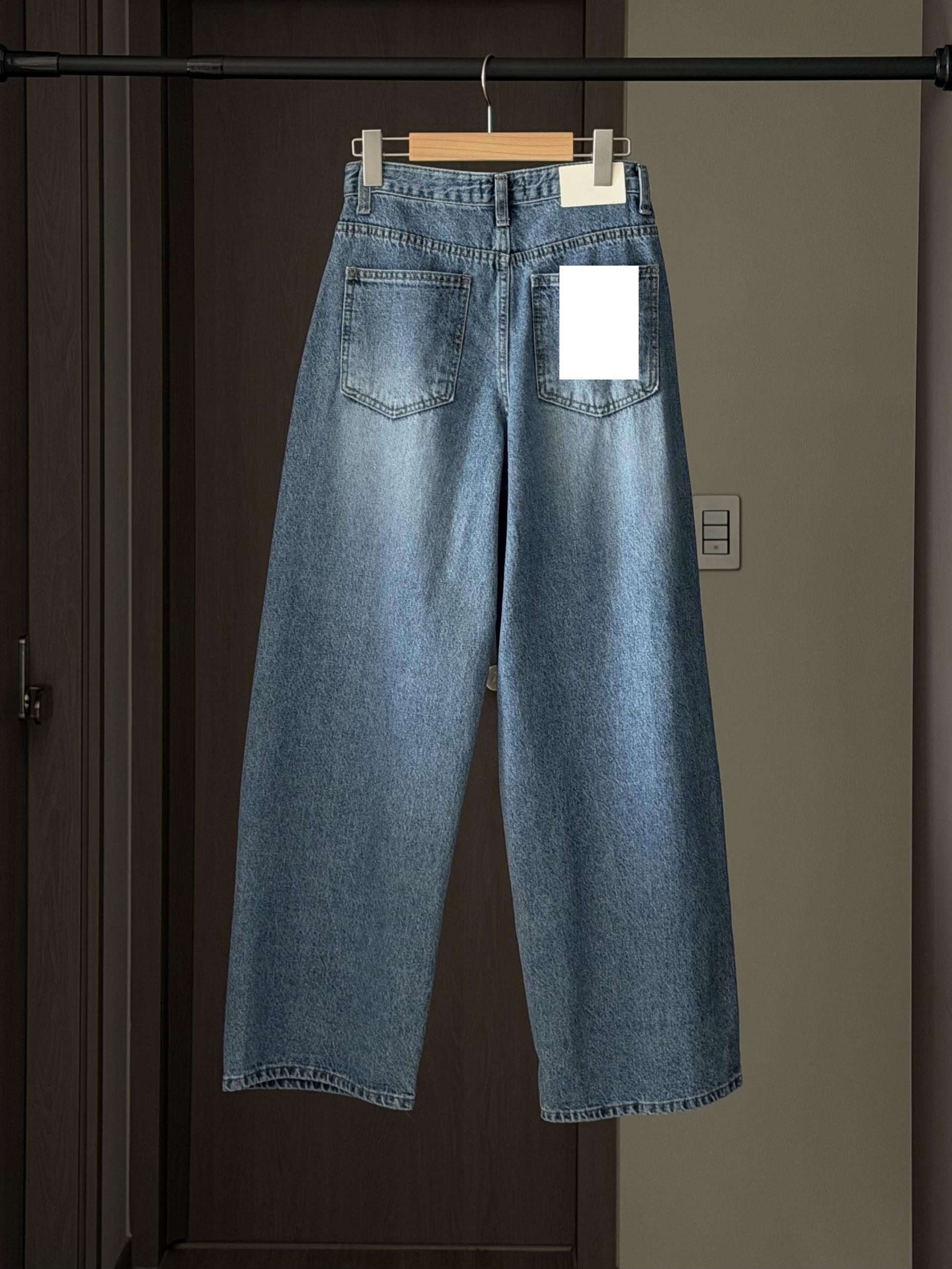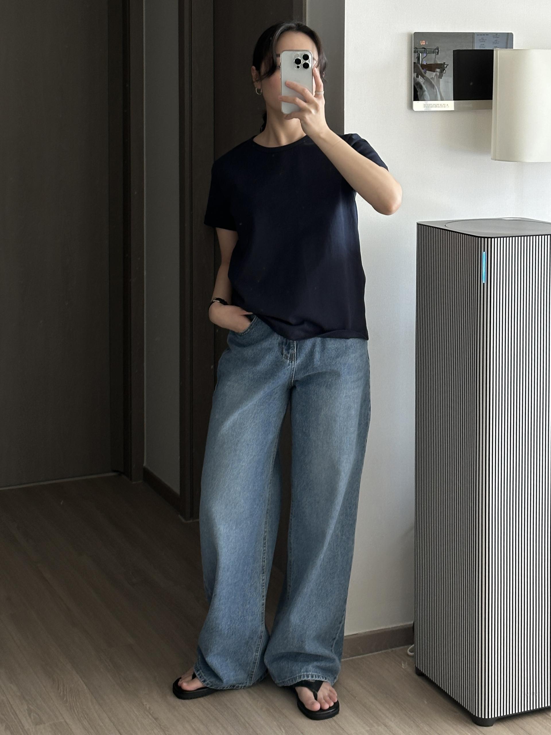 여유 있게 떨어지는 와이드 핏의 중청 데님이에요.