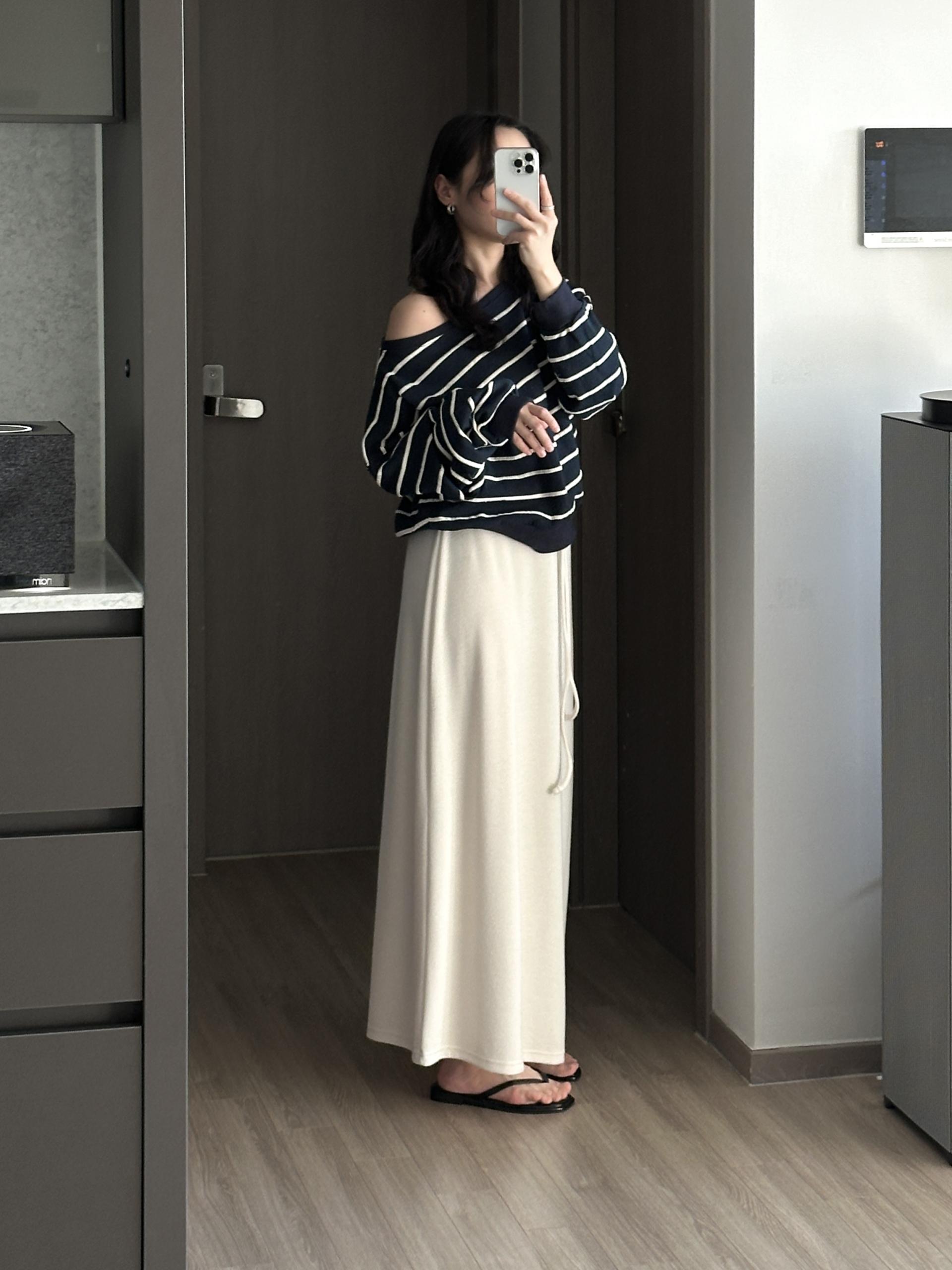 드롭 숄더 라인이 여리한 실루엣을 완성해줍니다.