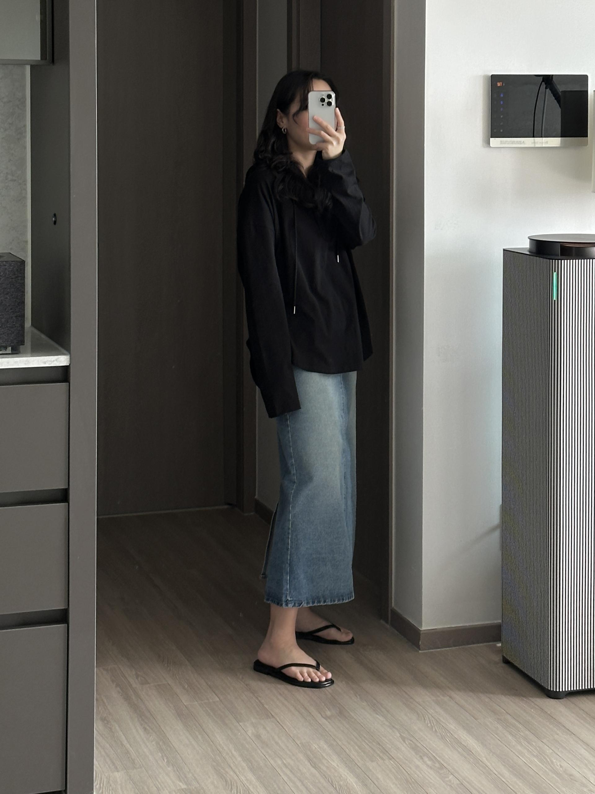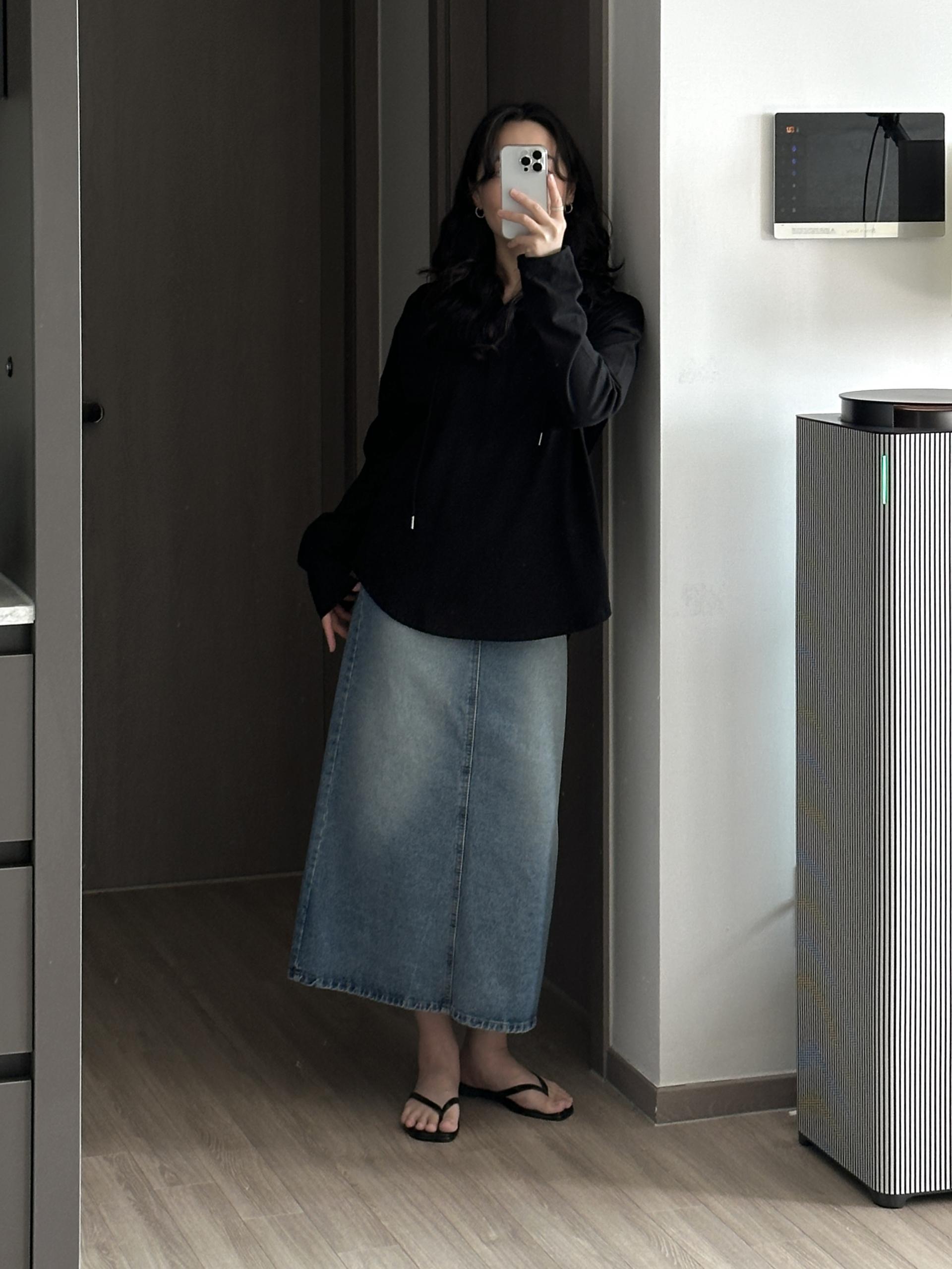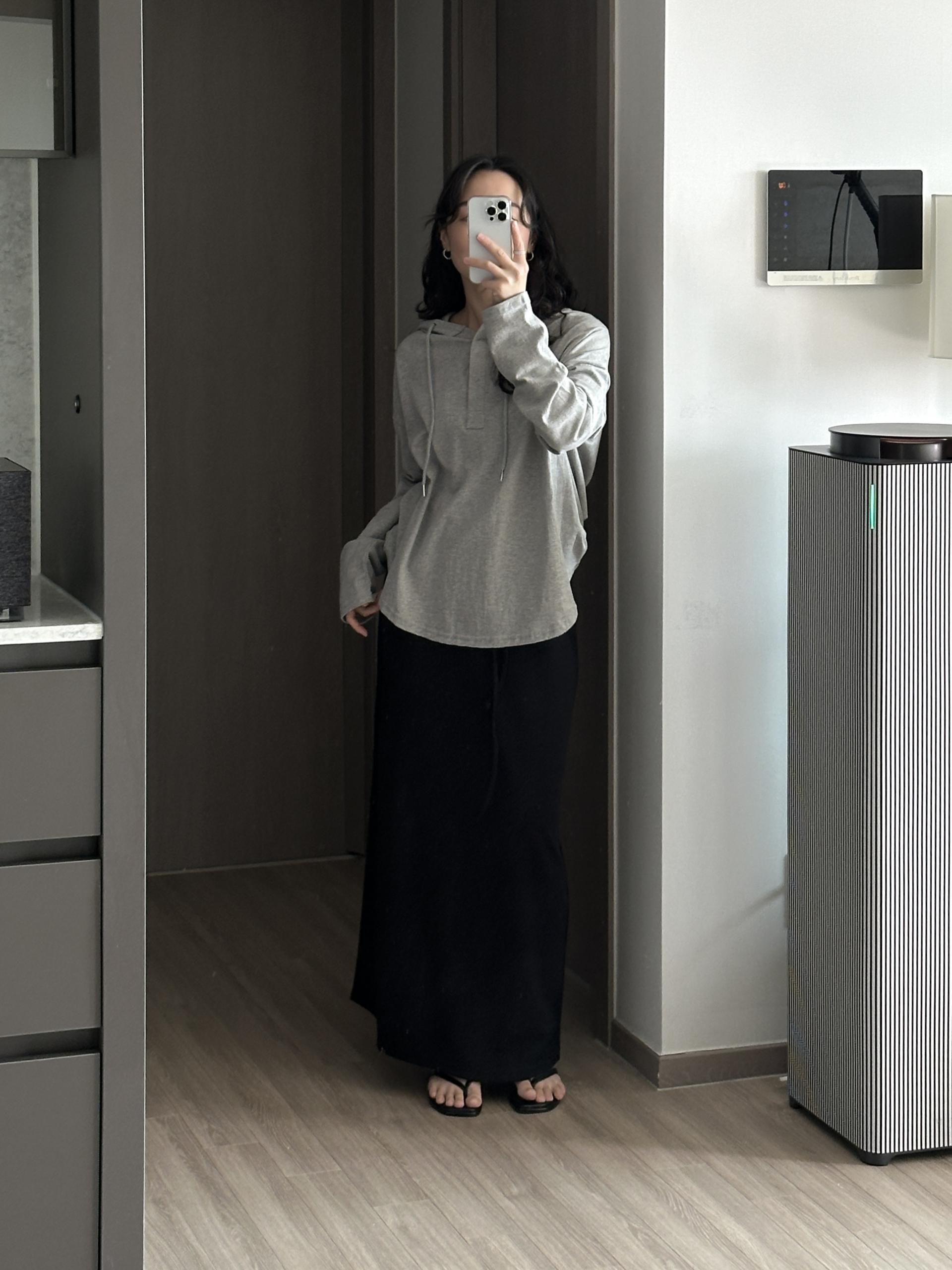 힙을 살짝 덮는 기장으로 안정감 있으며