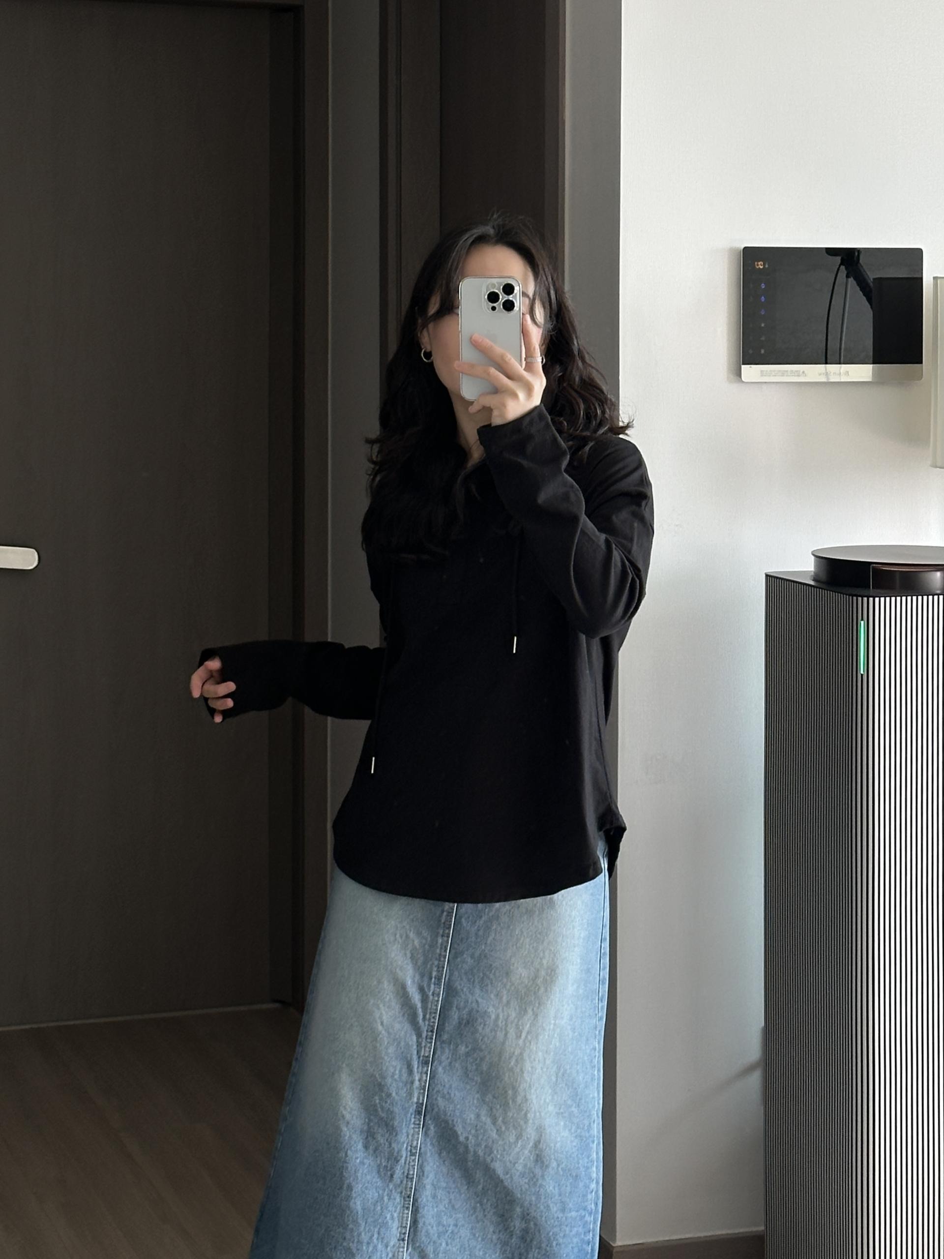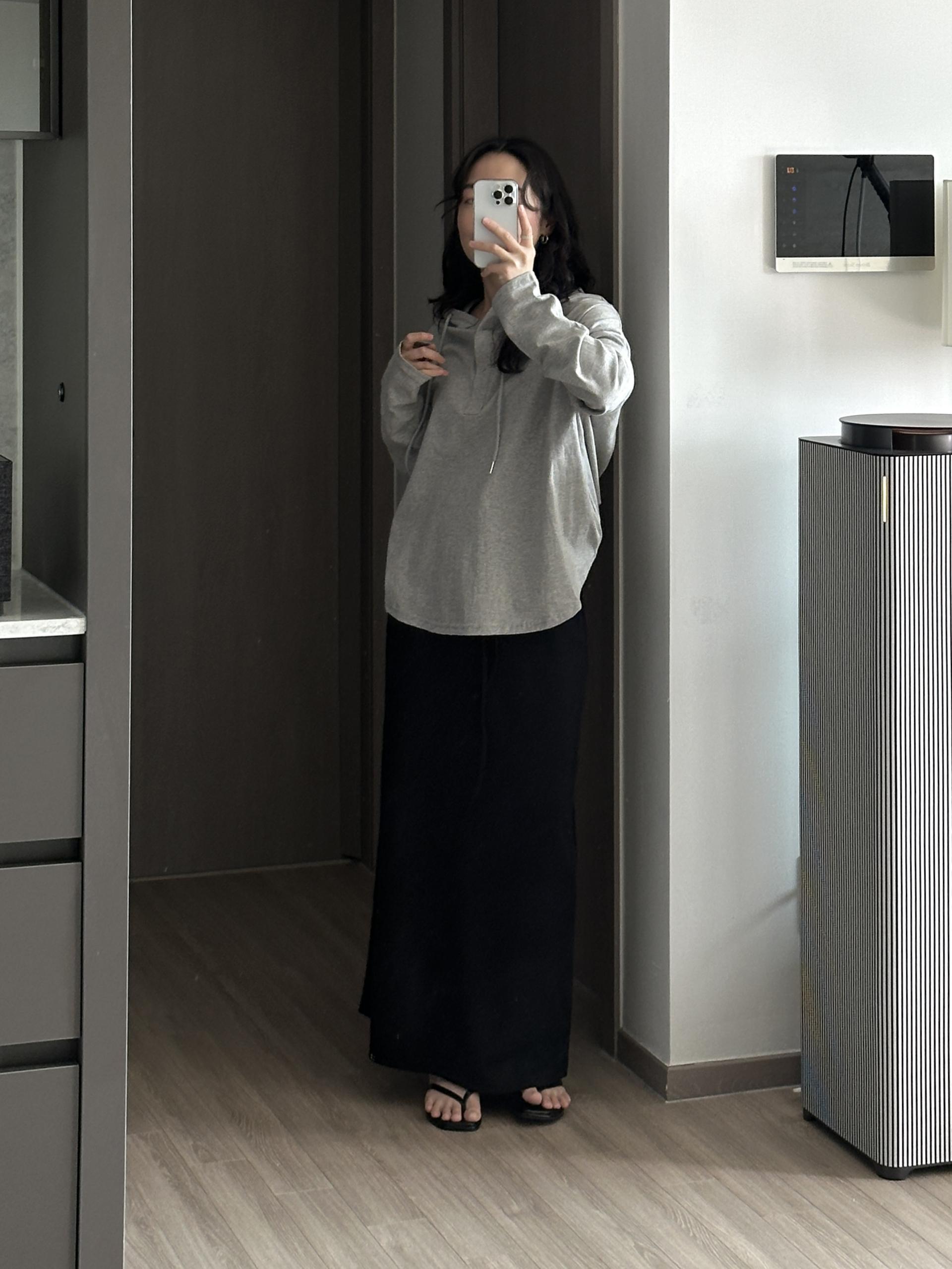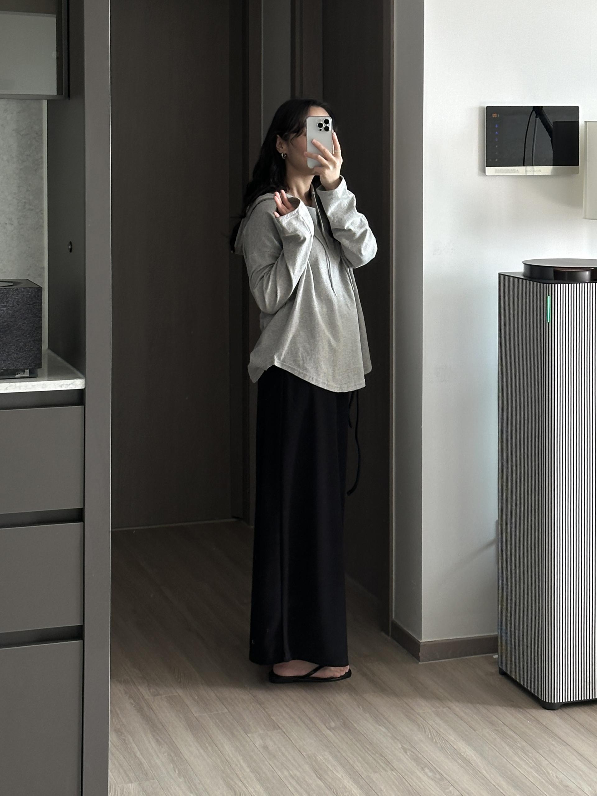 힙을 살짝 덮는 기장으로 안정감 있으며