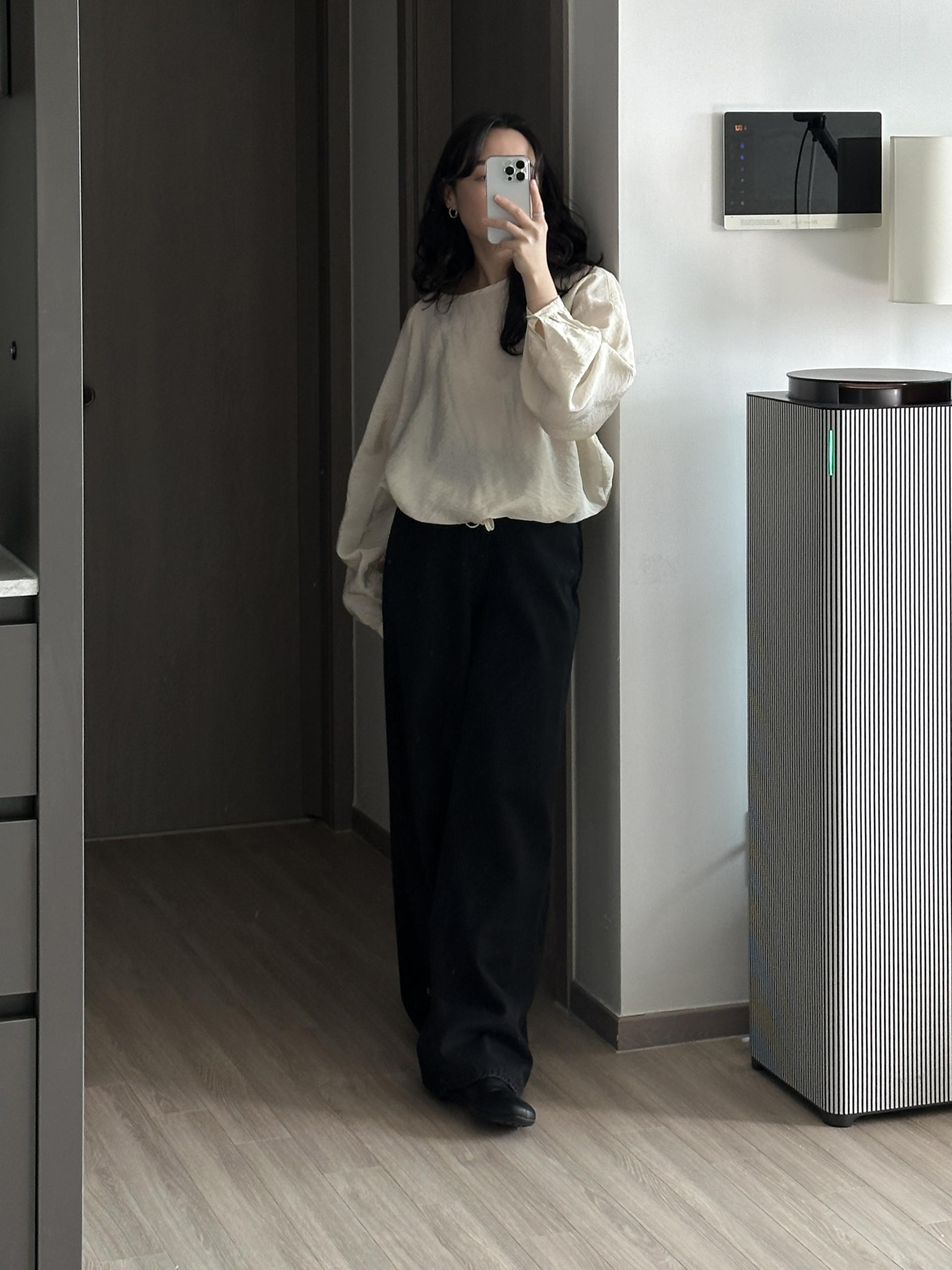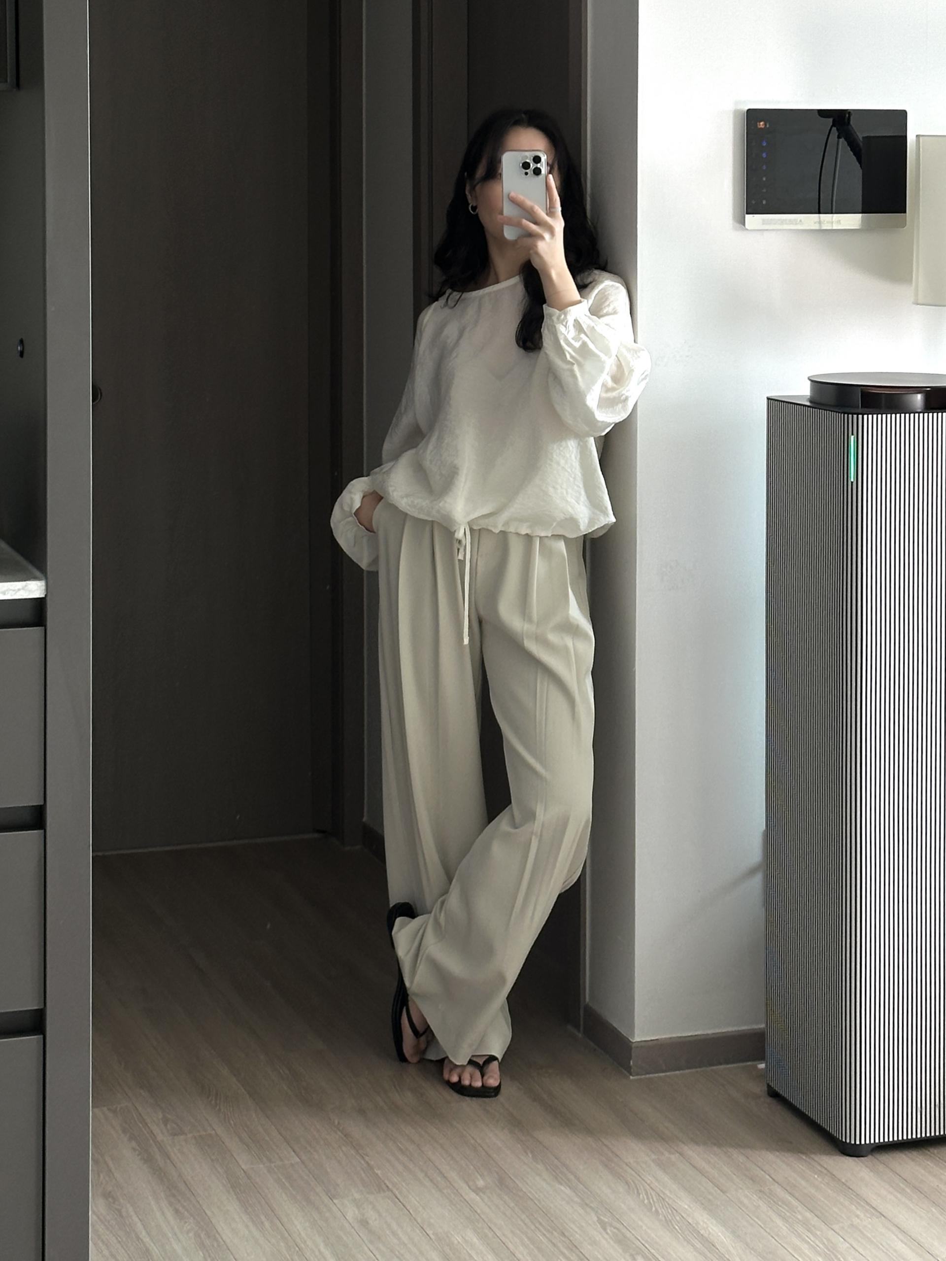 전체적으로 여유 있는 핏이 우아한 무드를 더합니다.