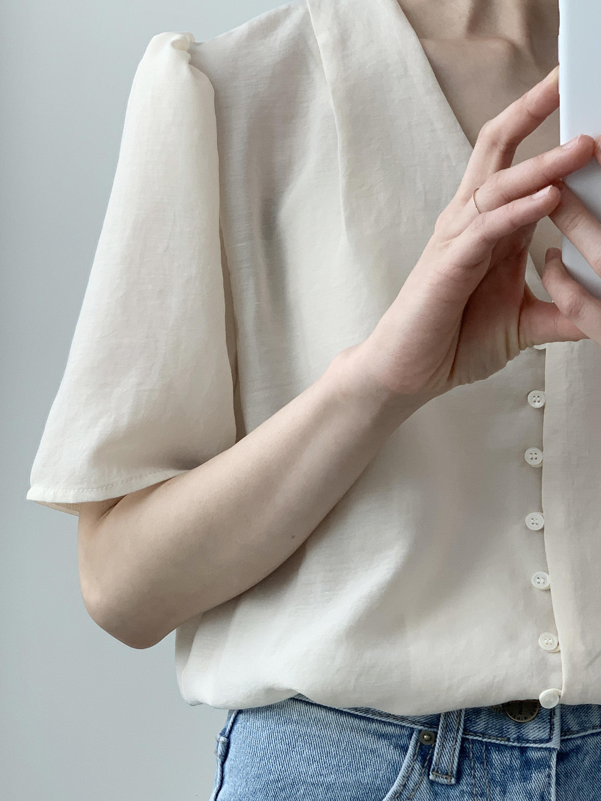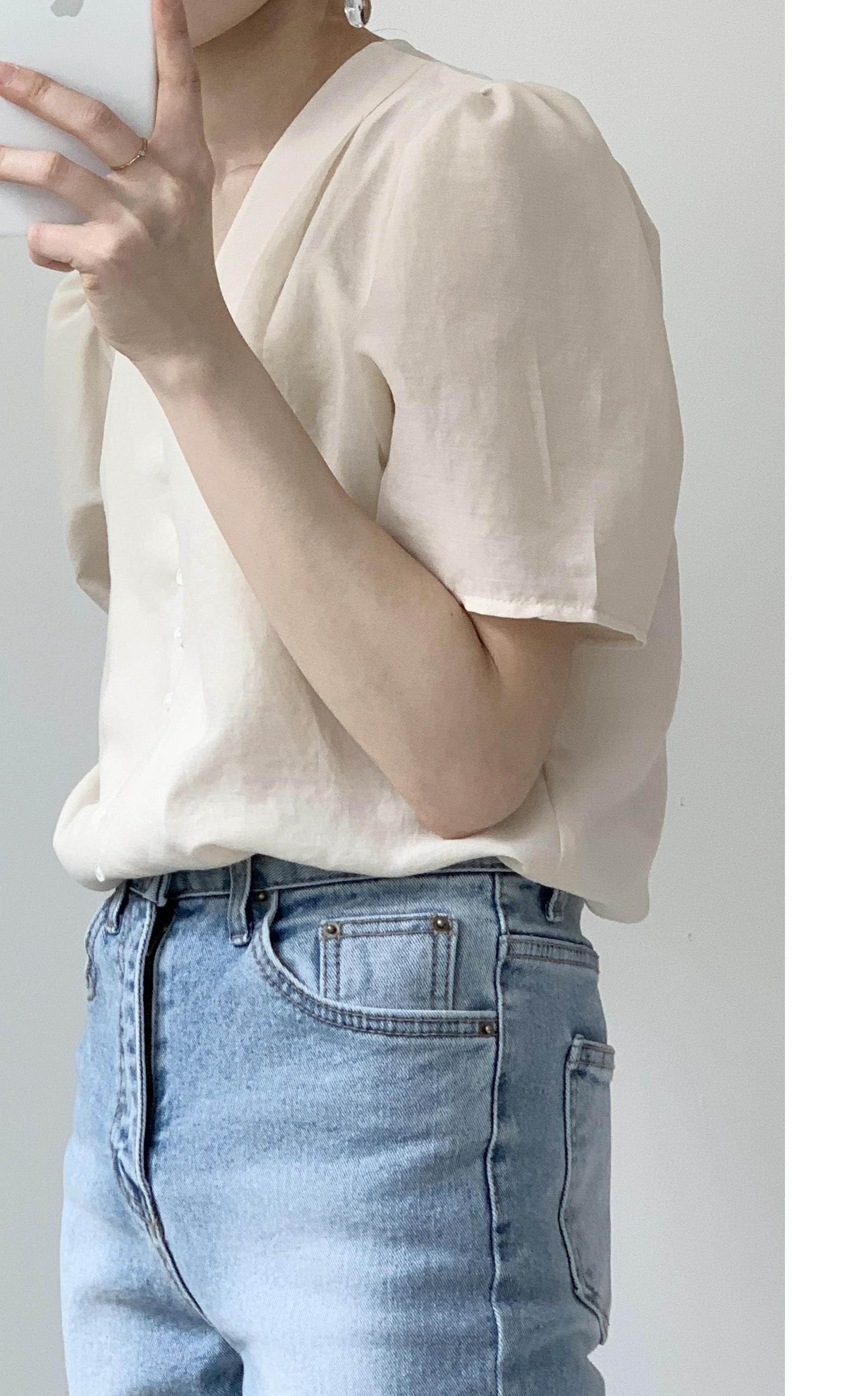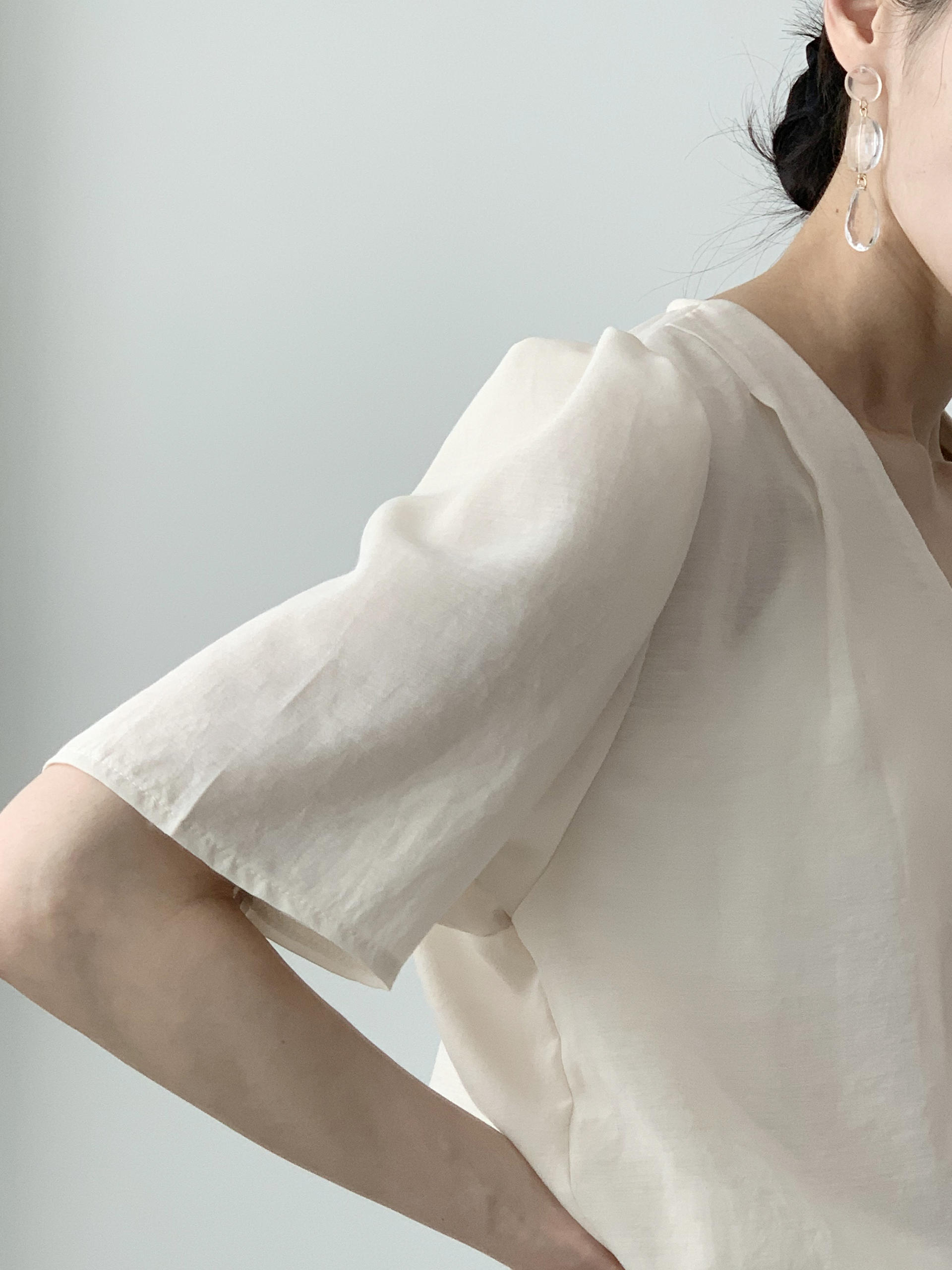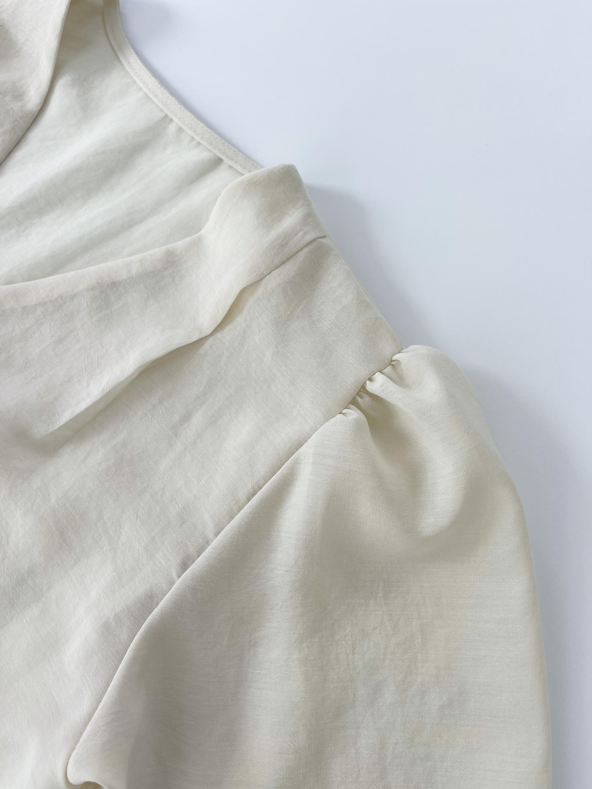 - 어깨에 잡힌 원턱, 셔링을 잡아 볼륨감을 더해준 소매 실루엣