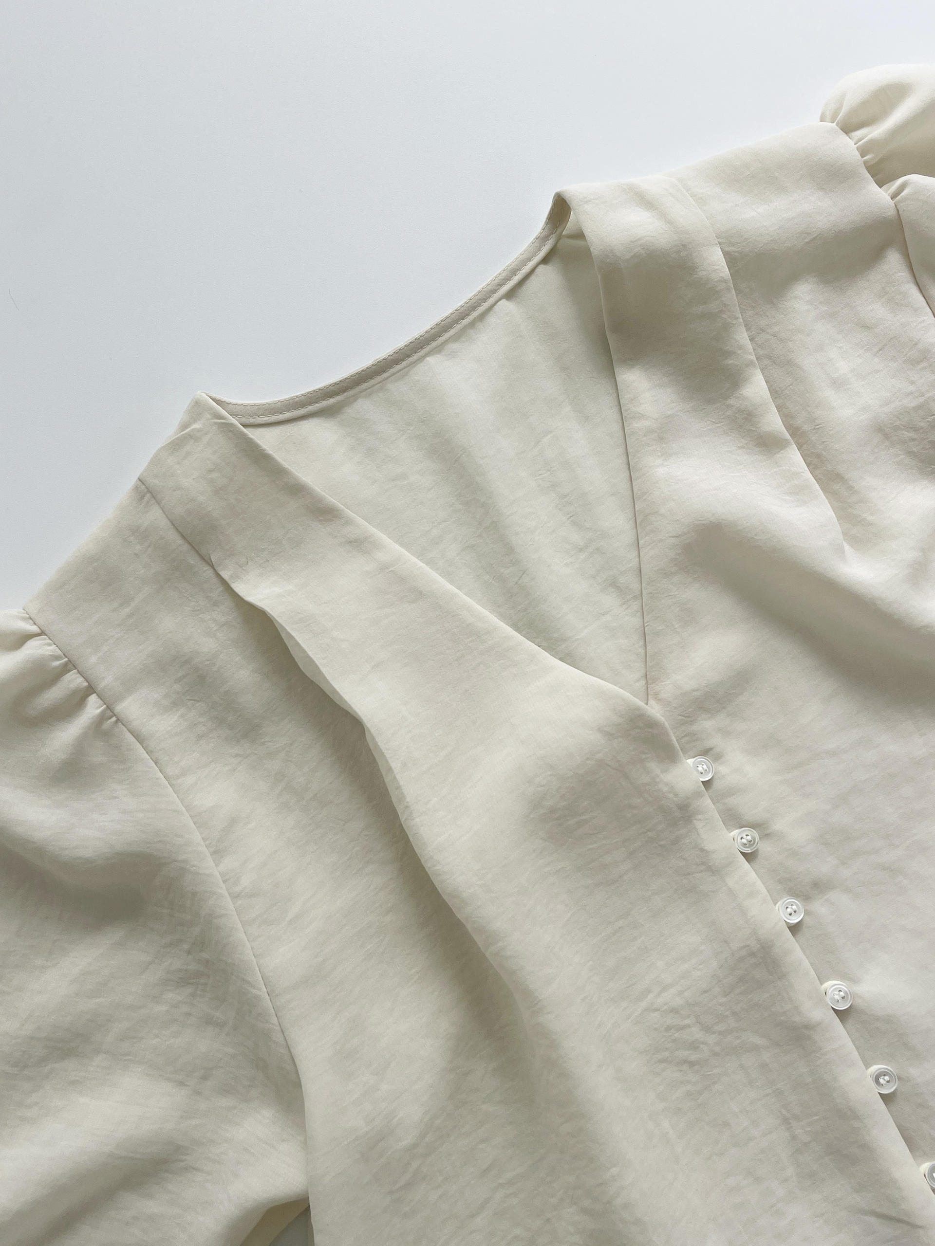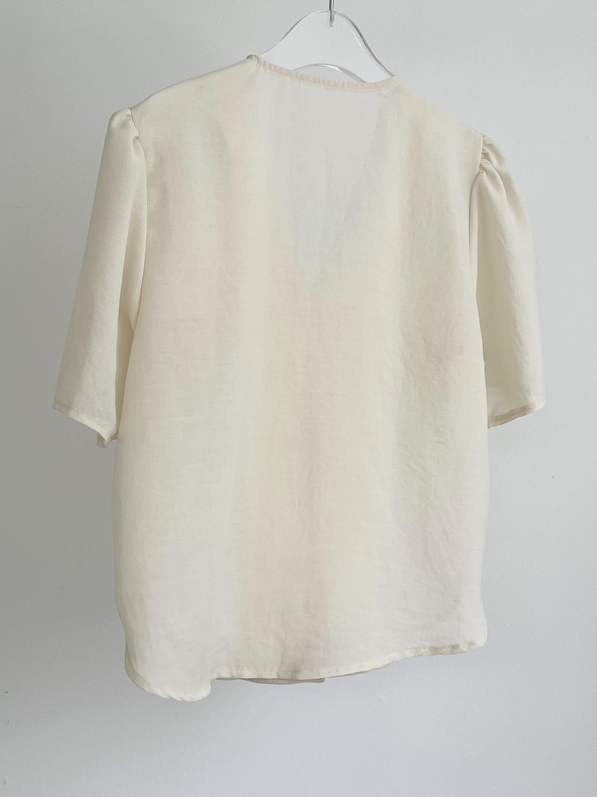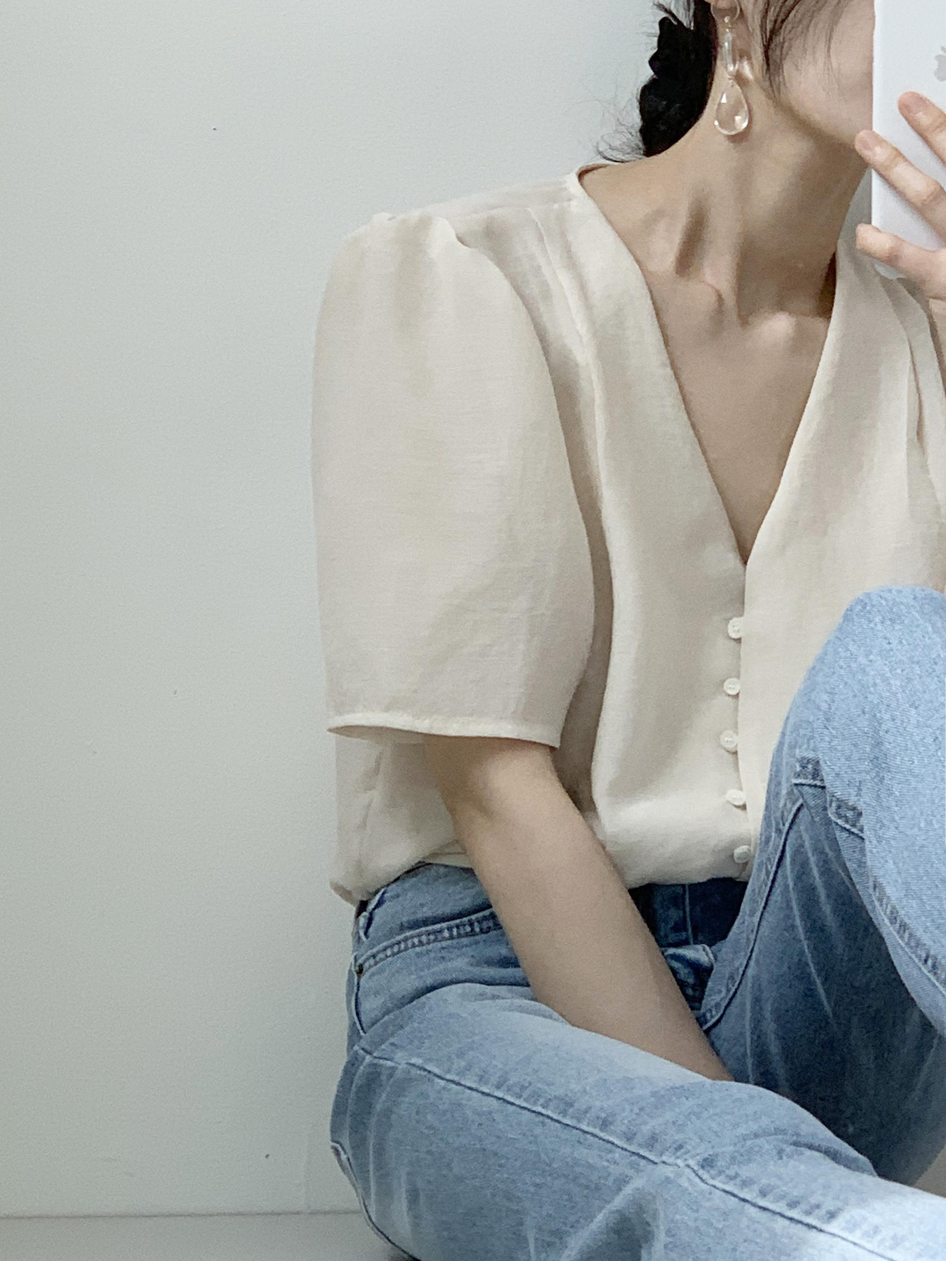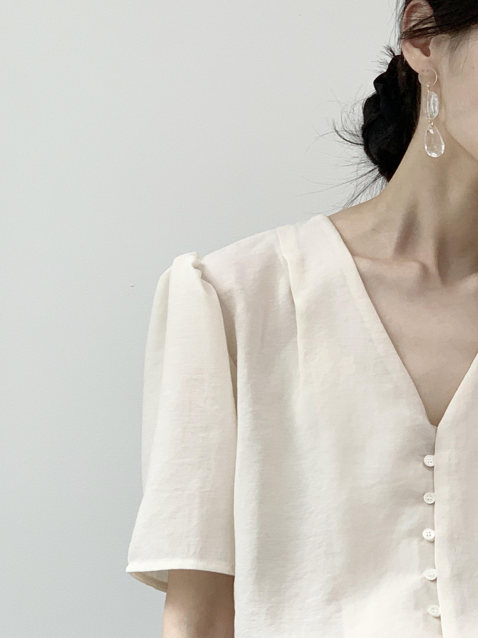 - 어깨에 잡힌 원턱, 셔링을 잡아 볼륨감을 더해준 소매 실루엣