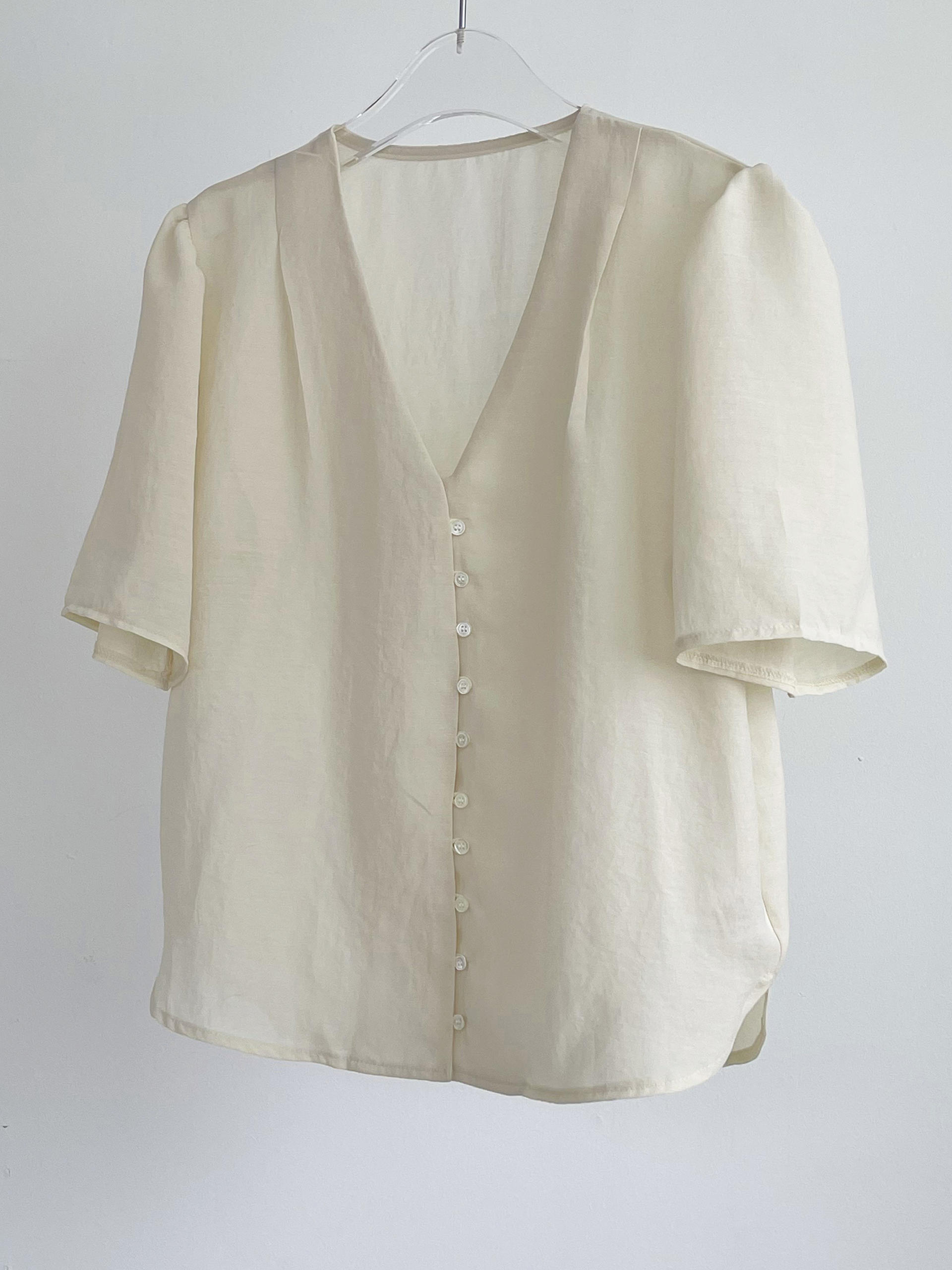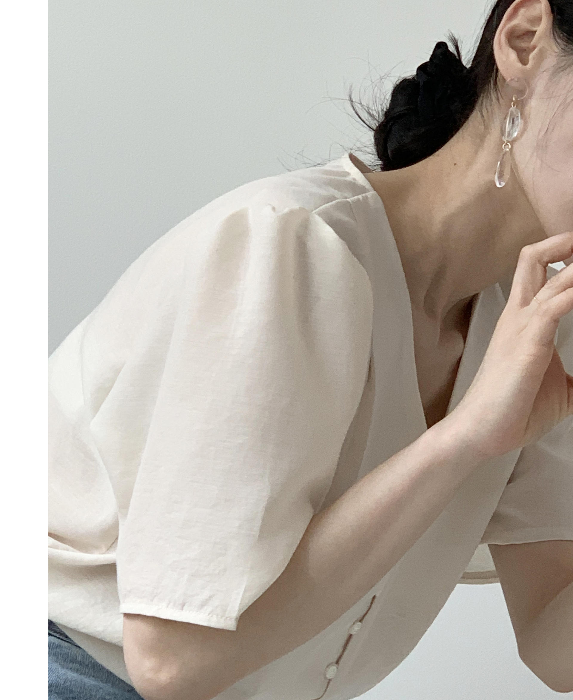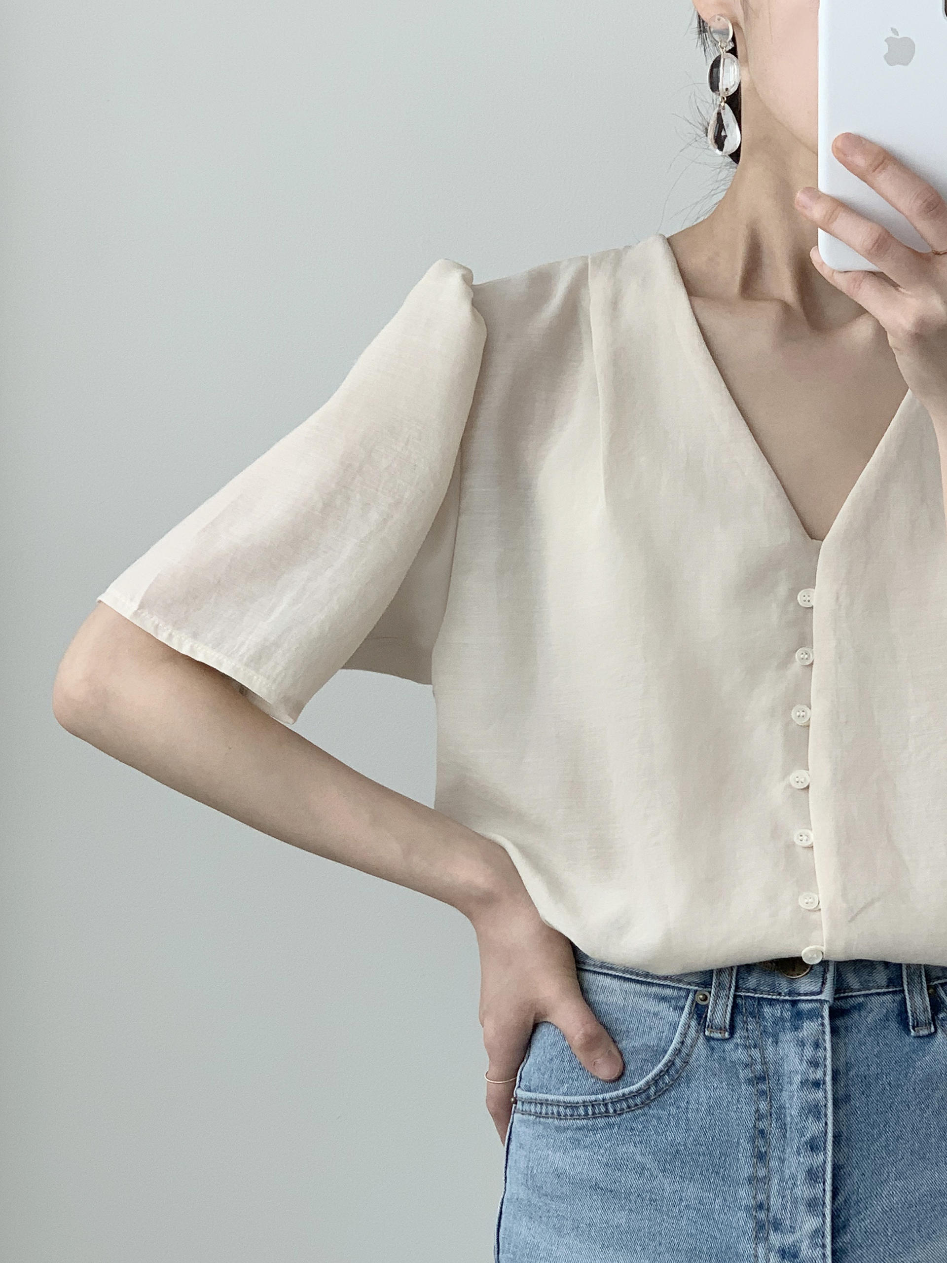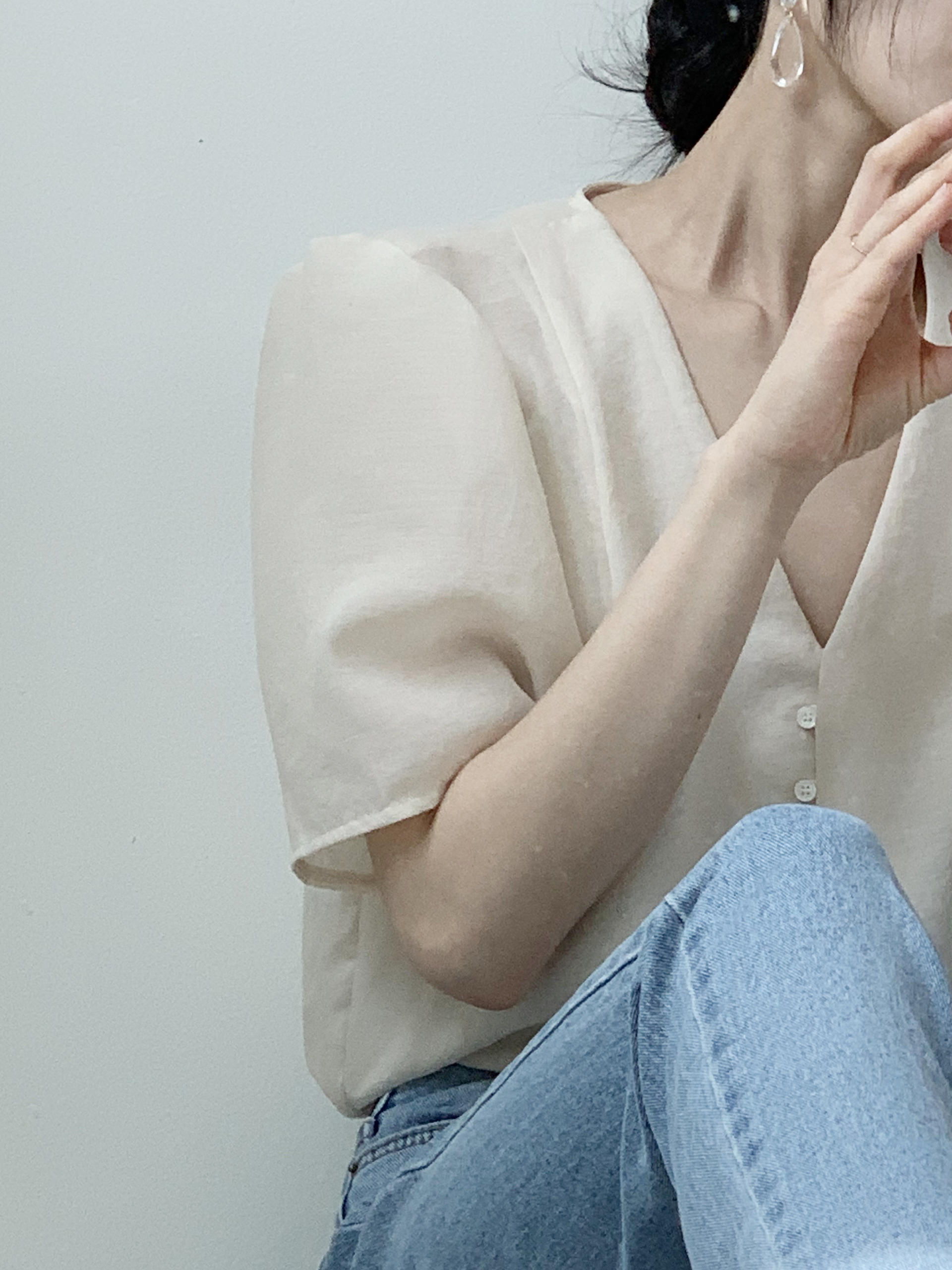 - 어깨에 잡힌 원턱, 셔링을 잡아 볼륨감을 더해준 소매 실루엣