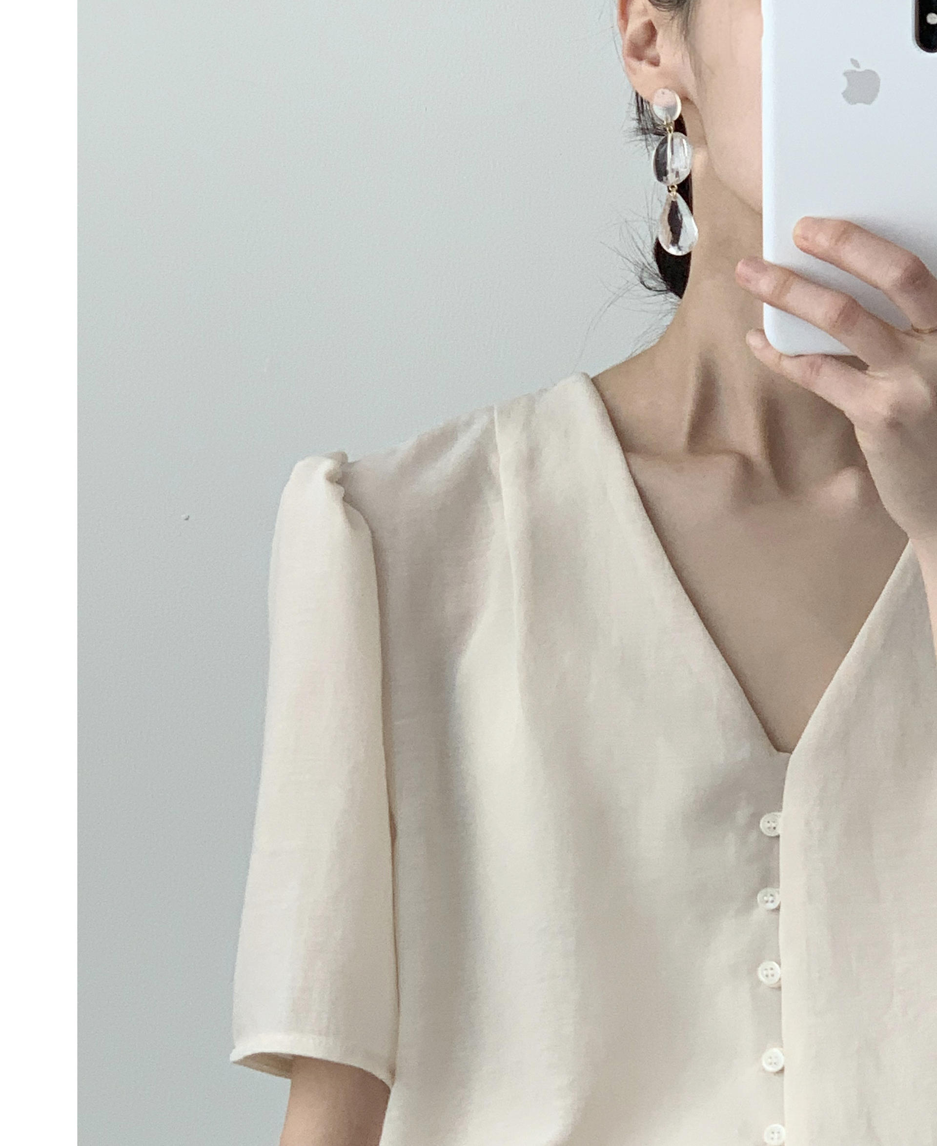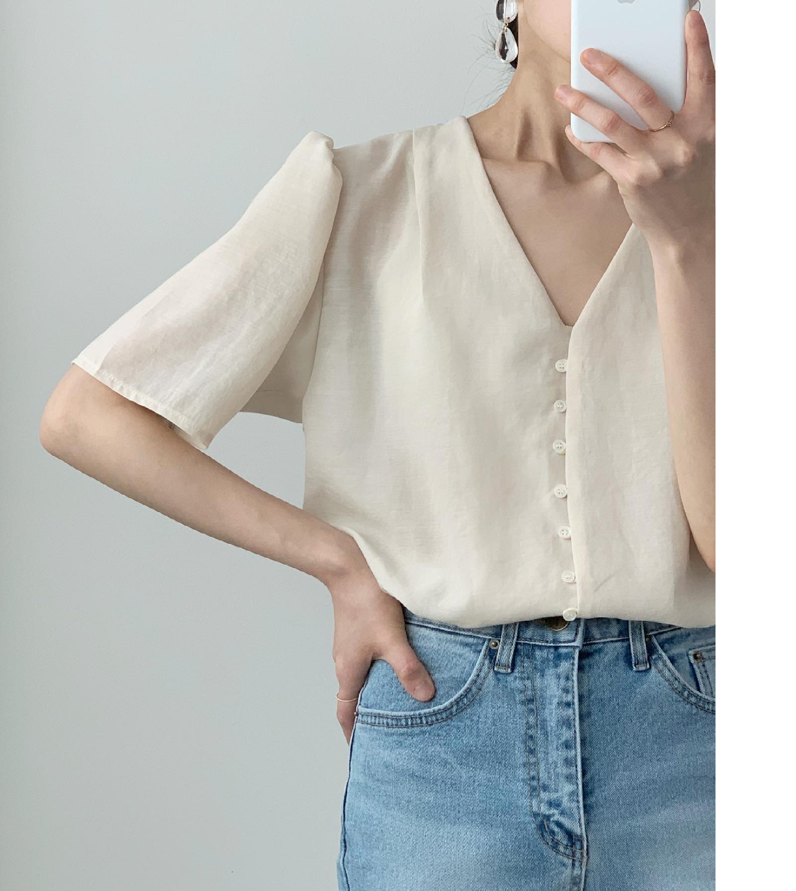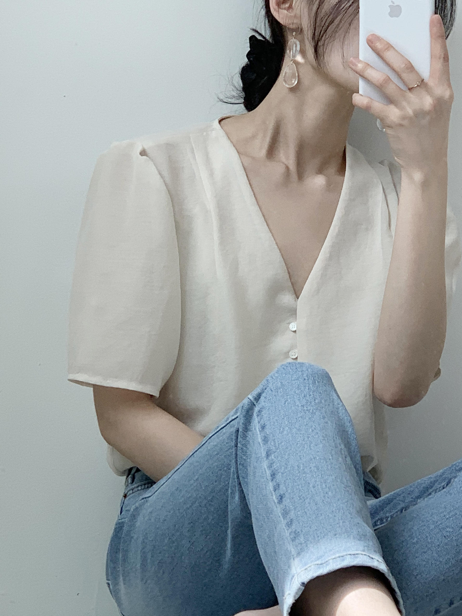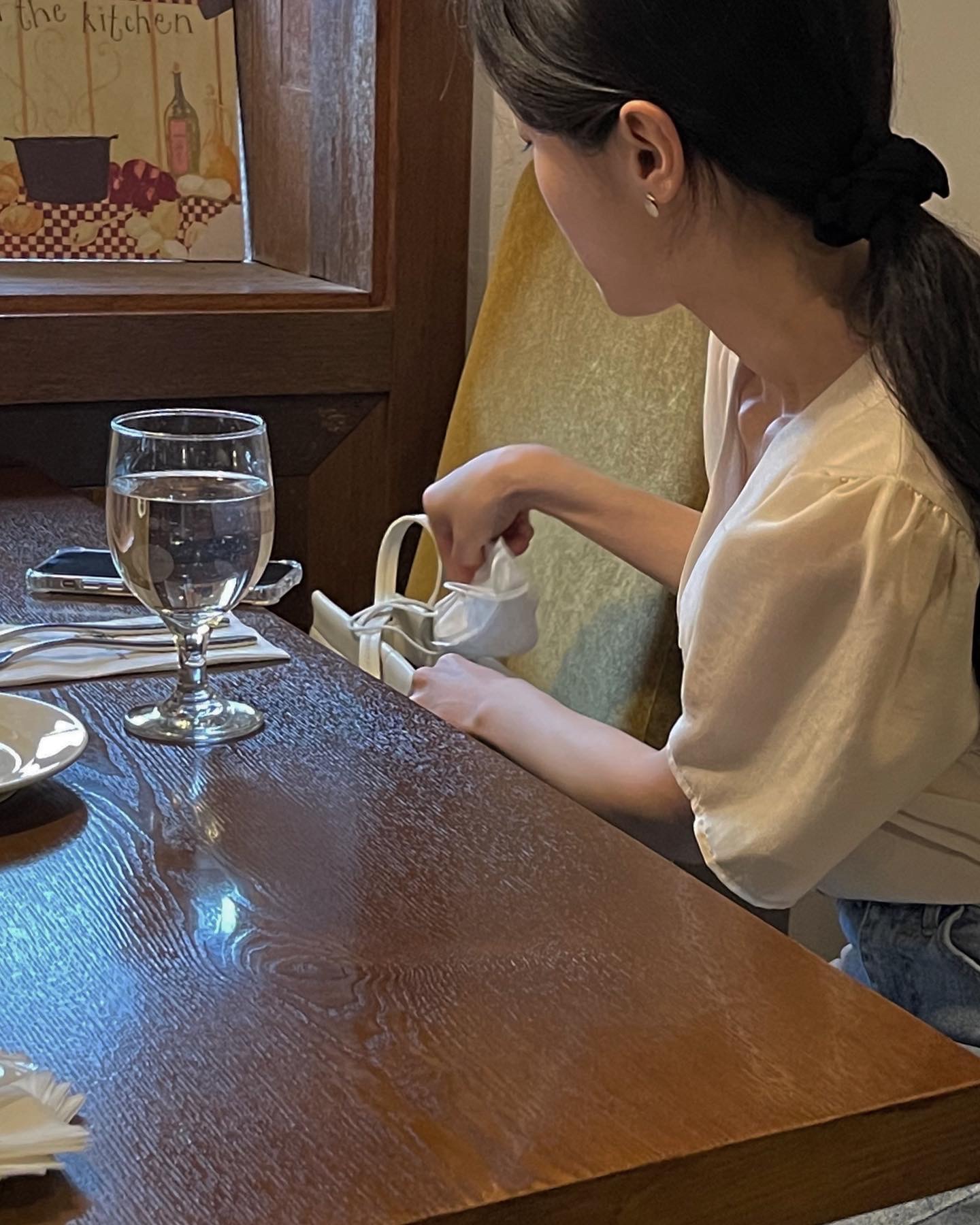 - 어깨에 잡힌 원턱, 셔링을 잡아 볼륨감을 더해준 소매 실루엣