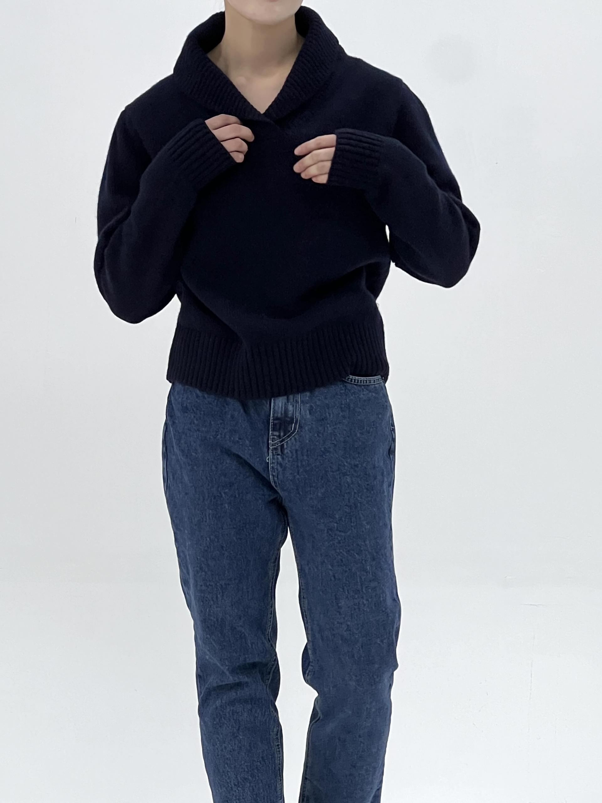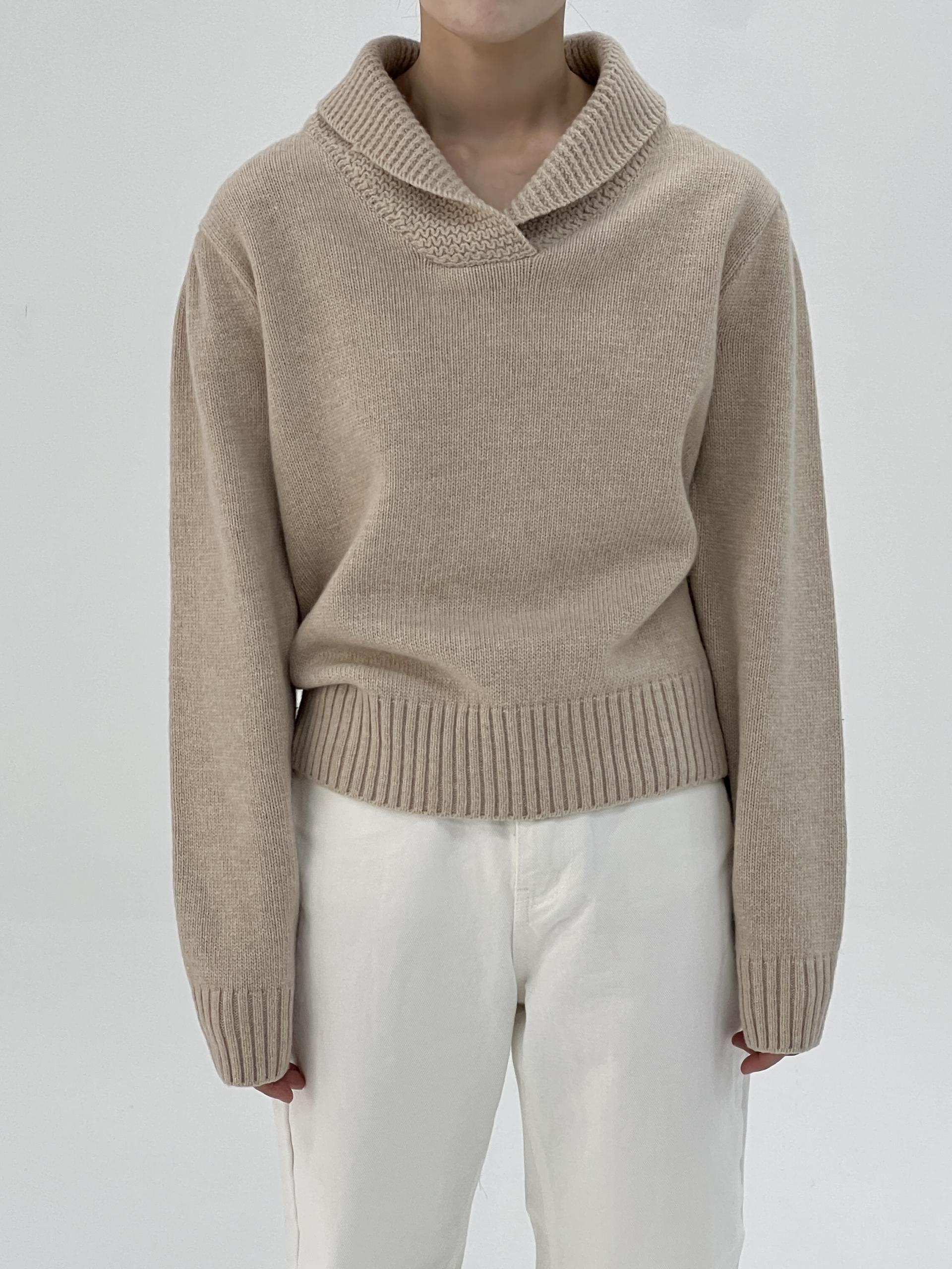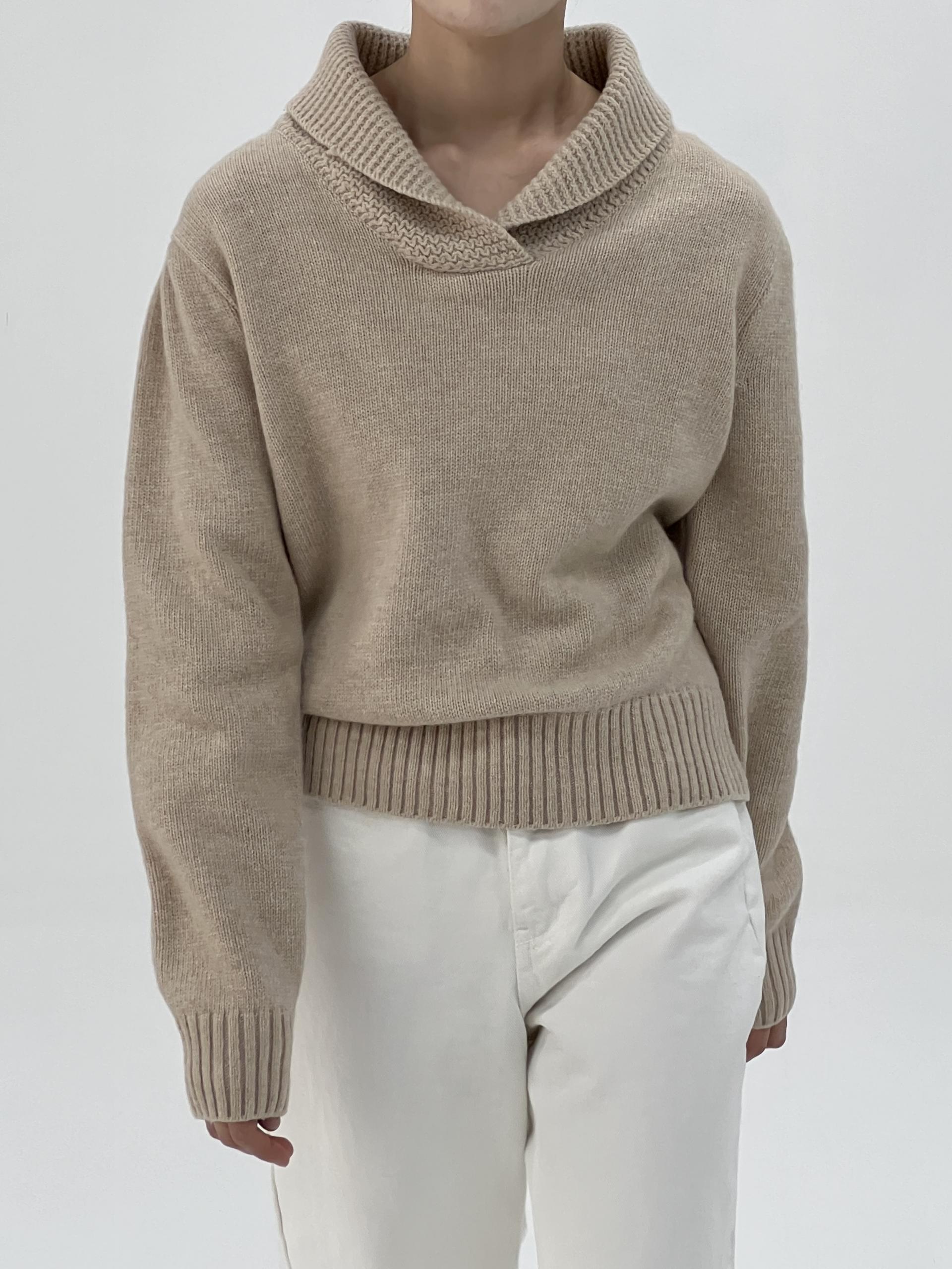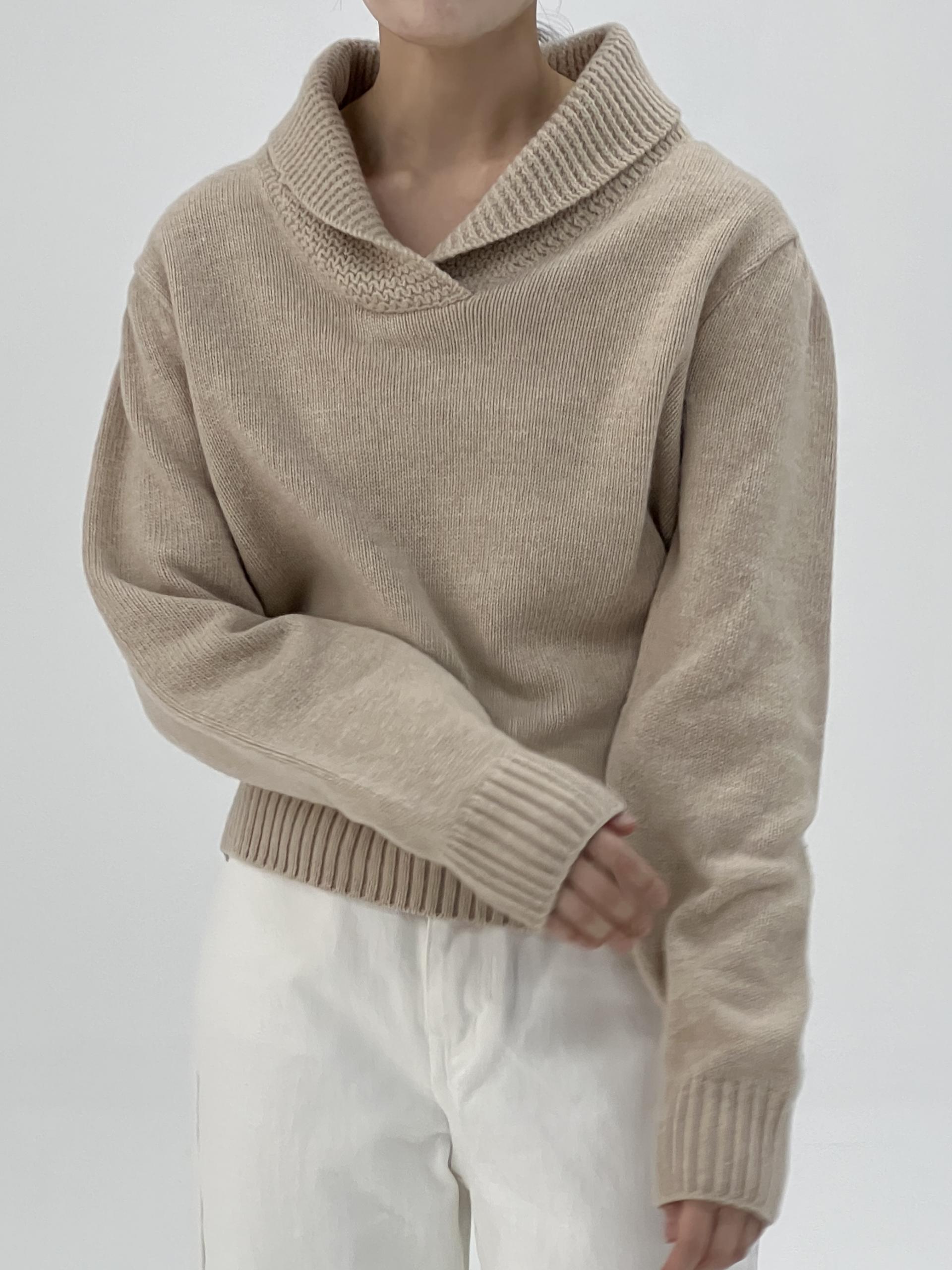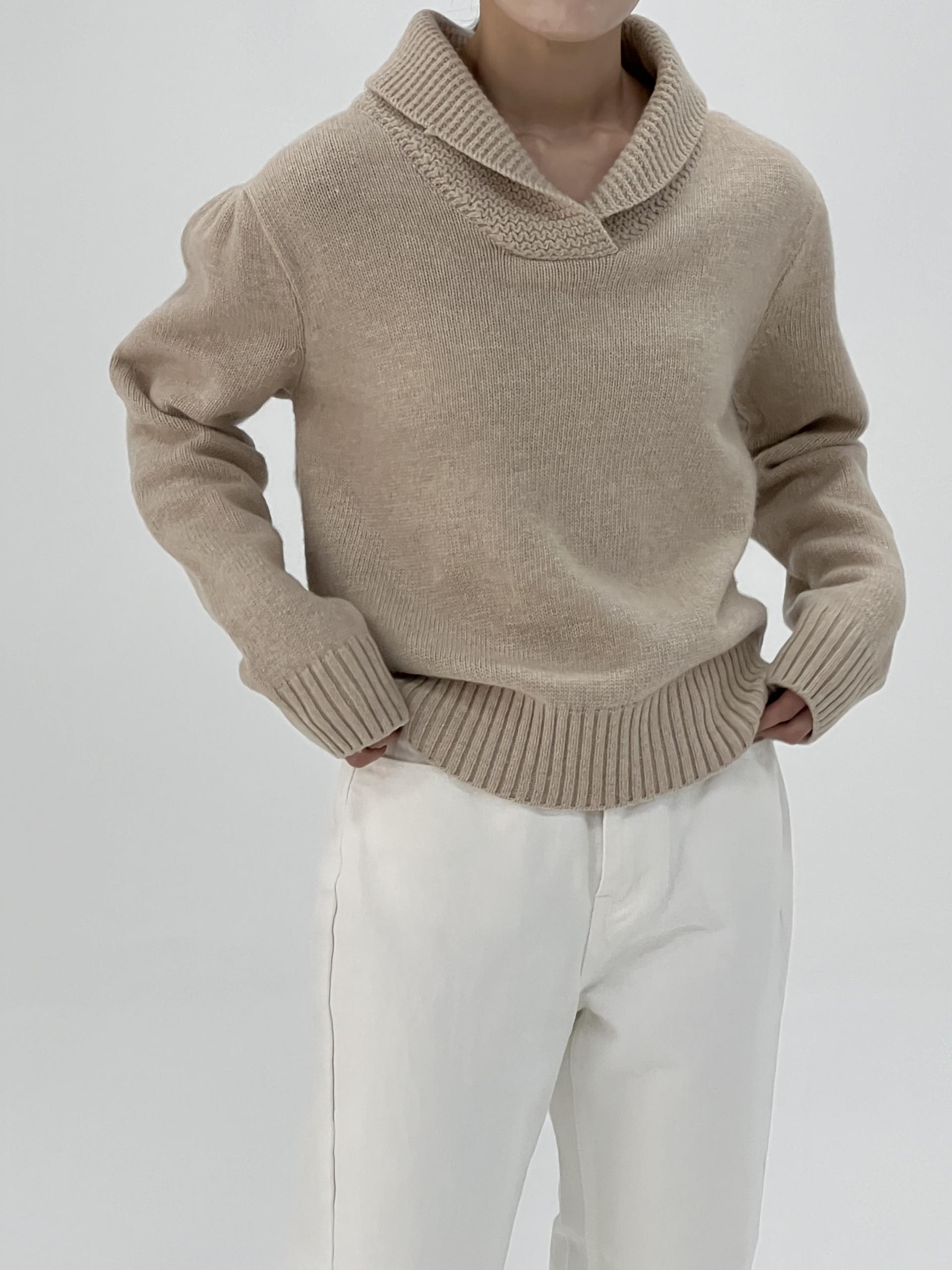 - 얕은 깊이의 숄 카라 디자인이 안정감을 느끼게 해주는 니트 웨어