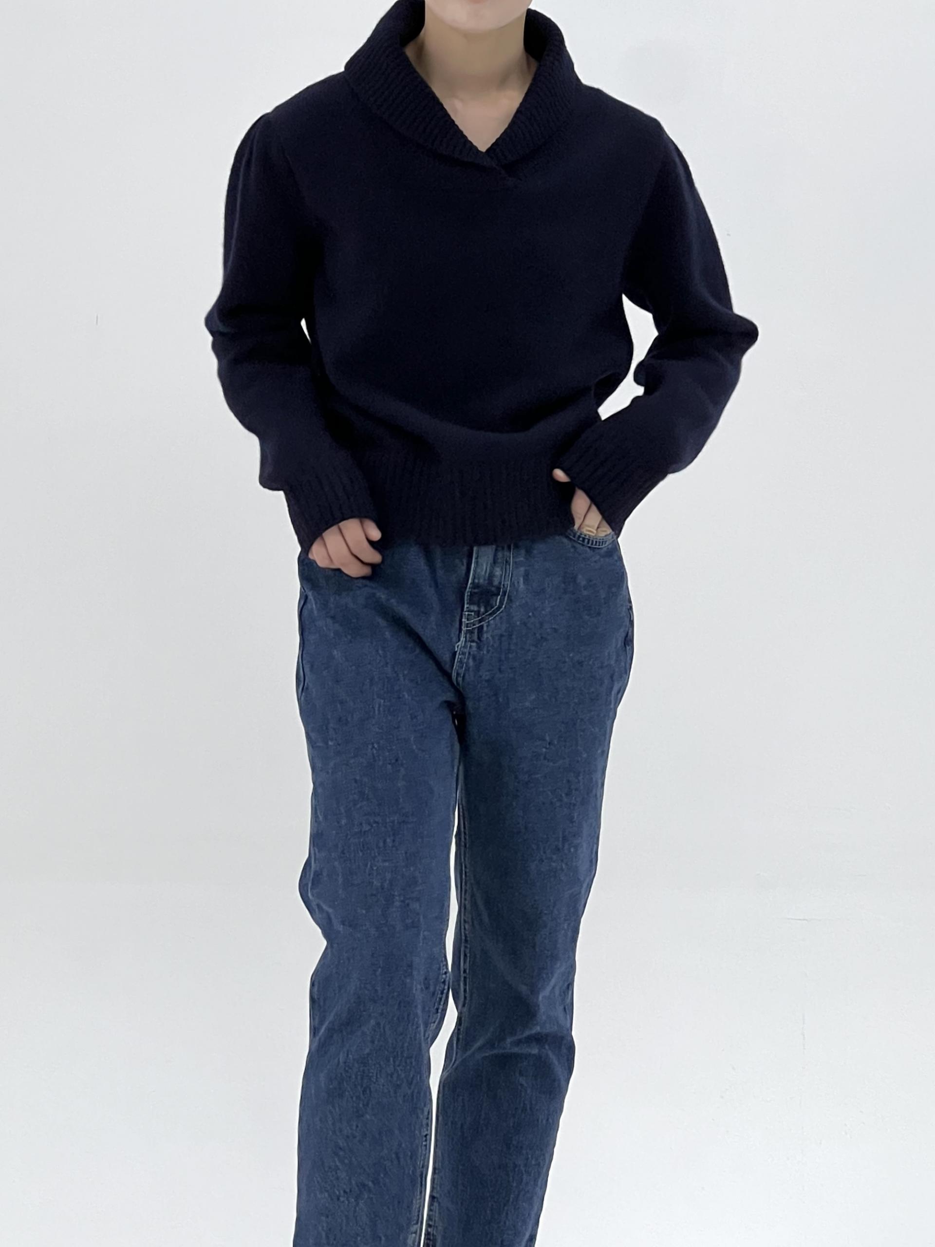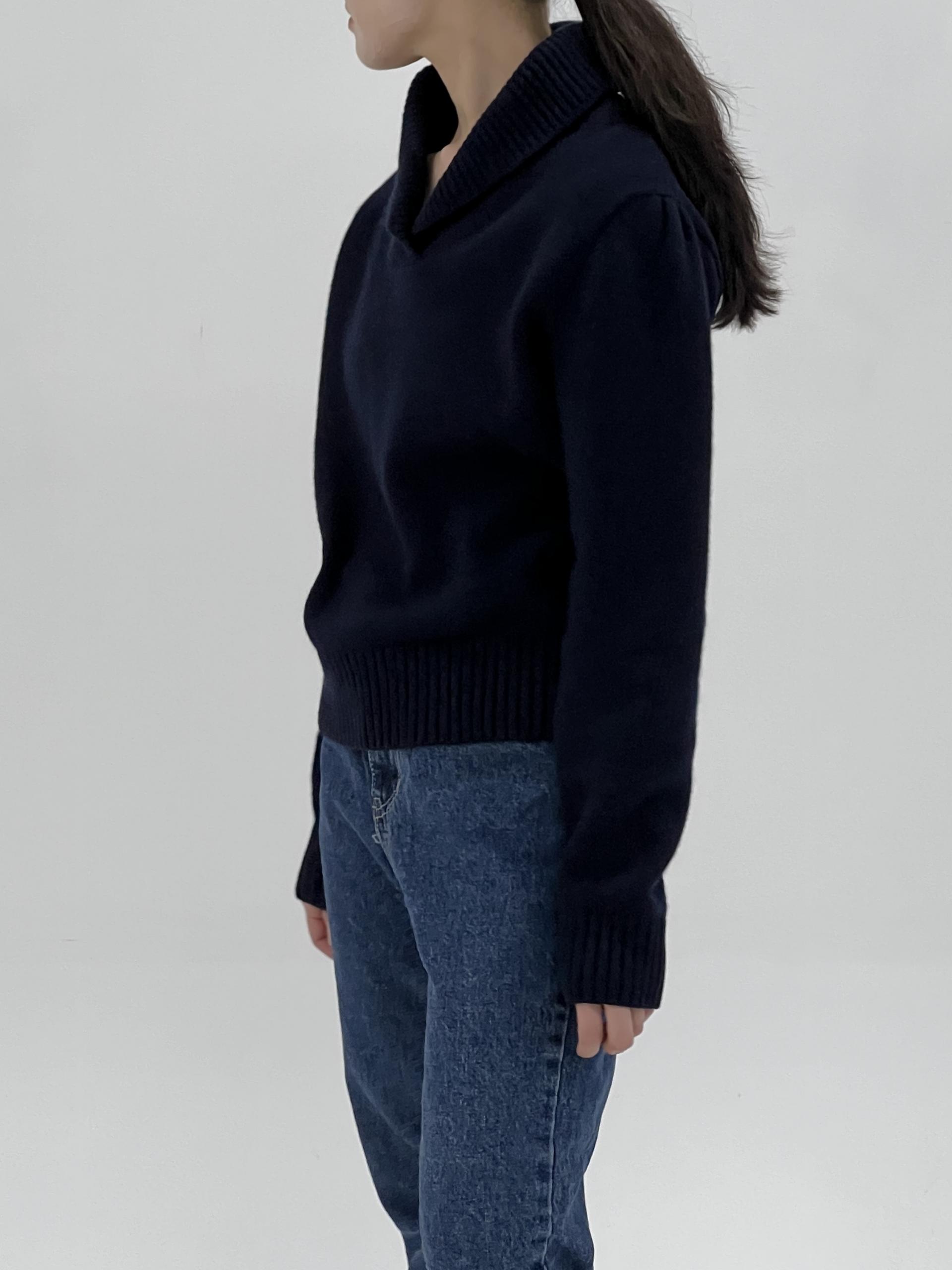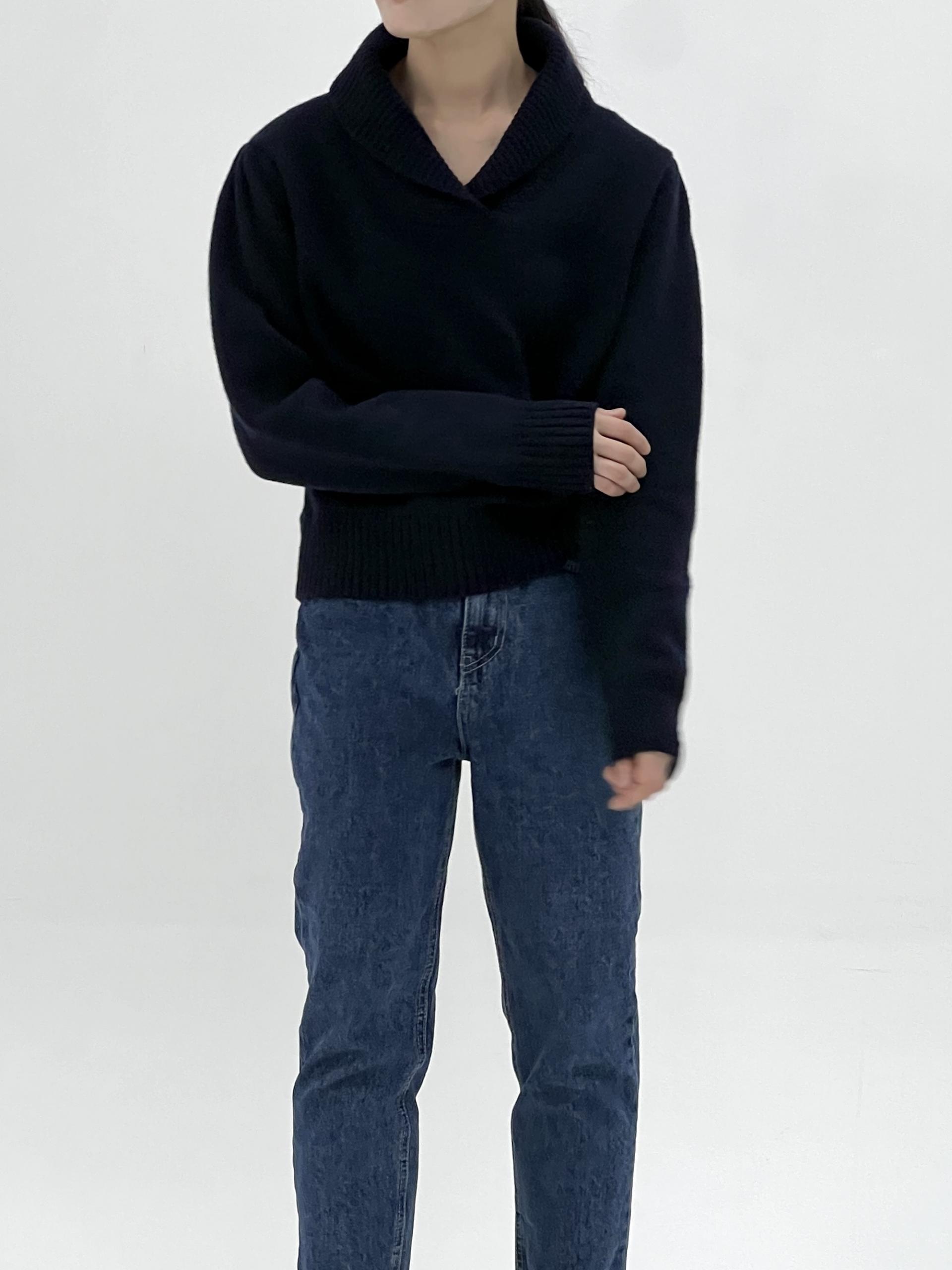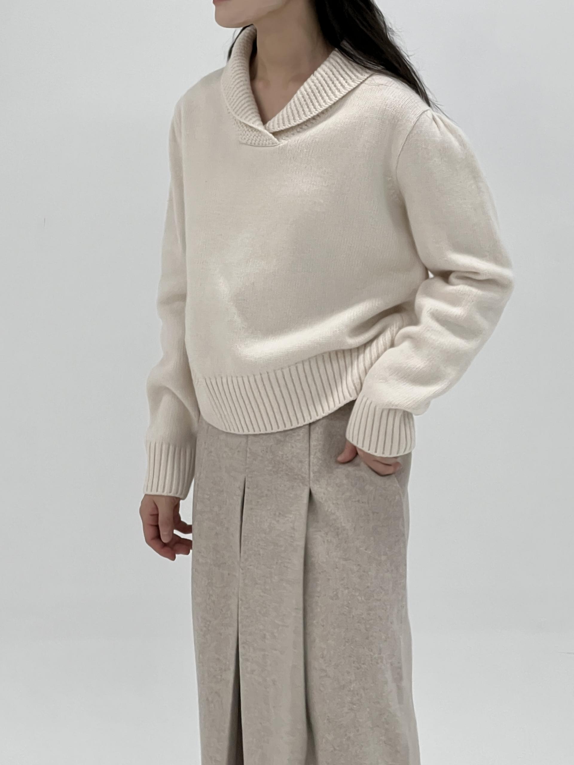 - 얕은 깊이의 숄 카라 디자인이 안정감을 느끼게 해주는 니트 웨어