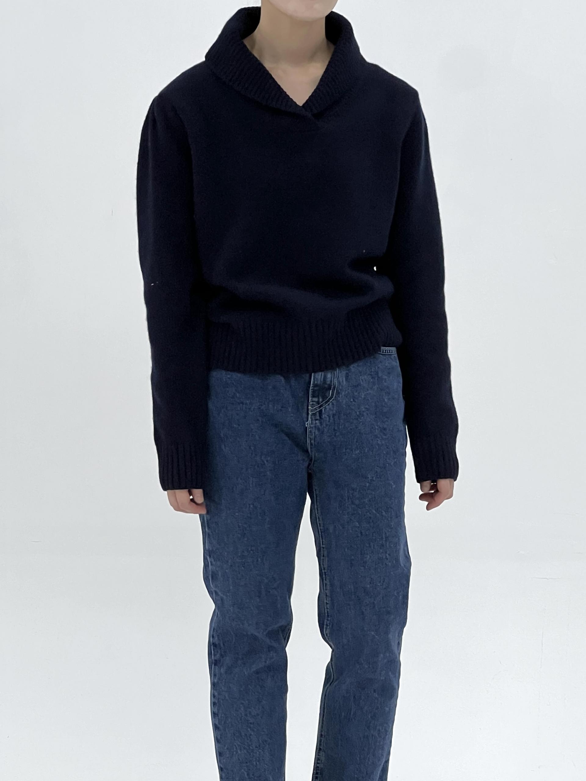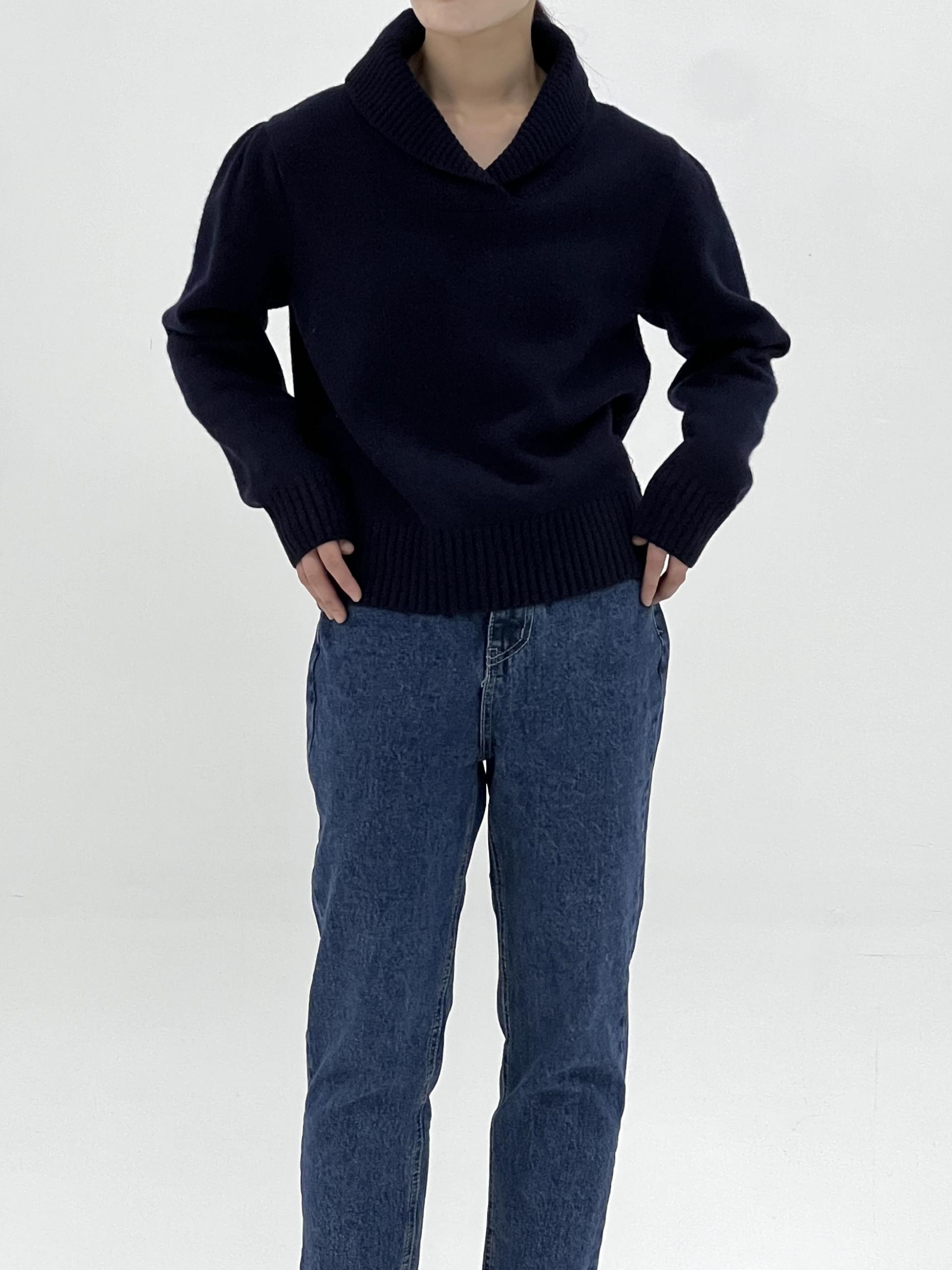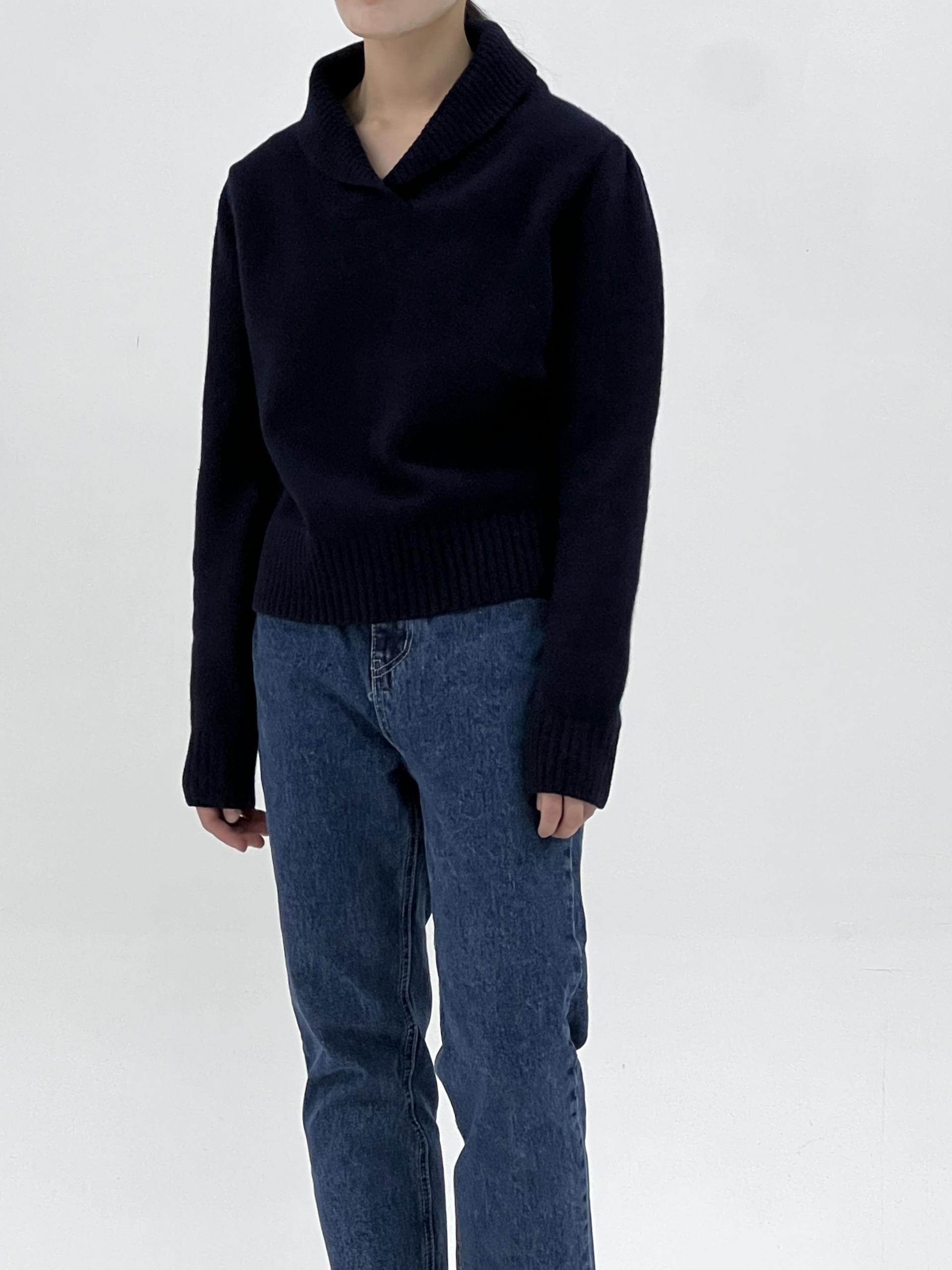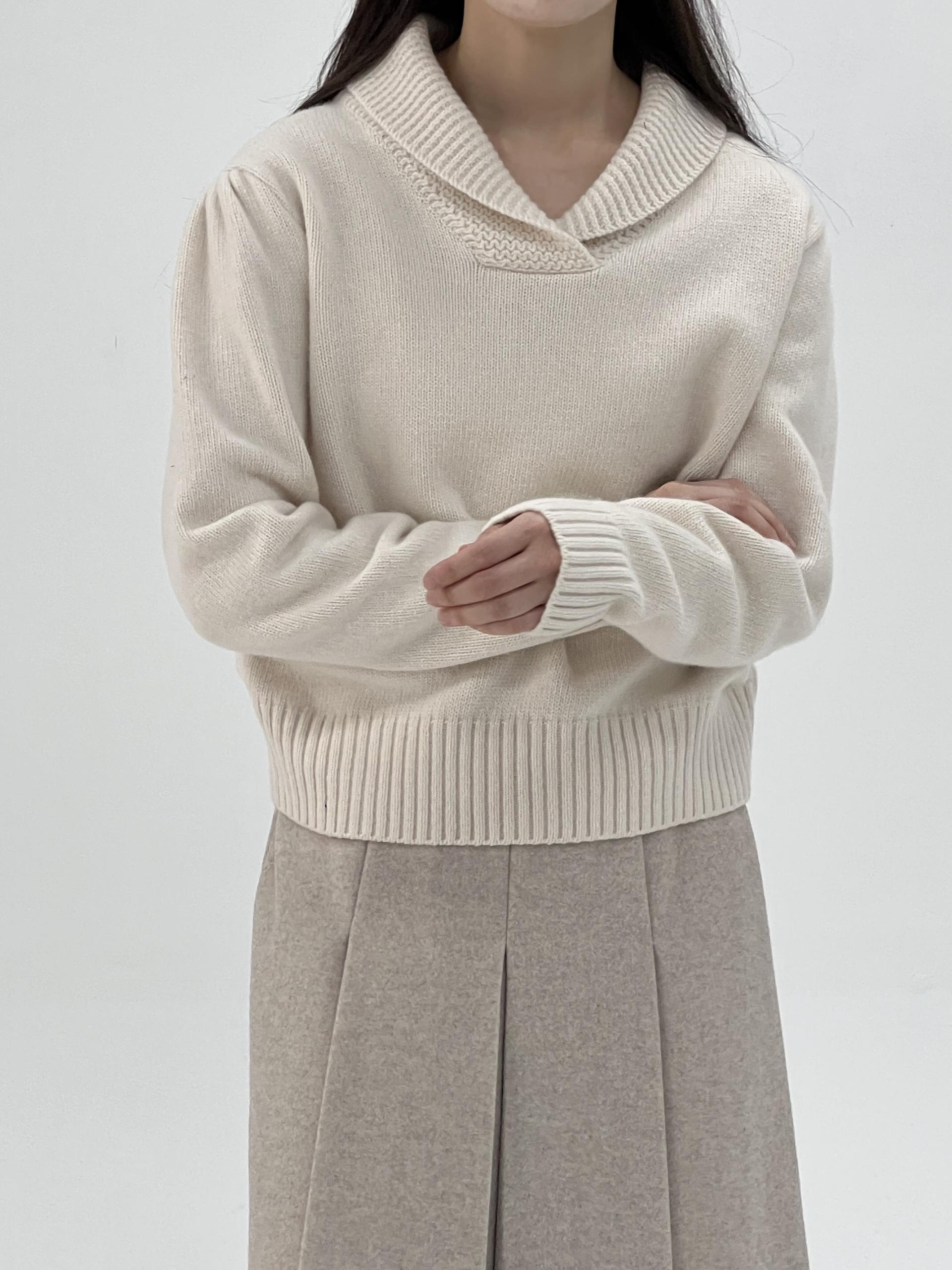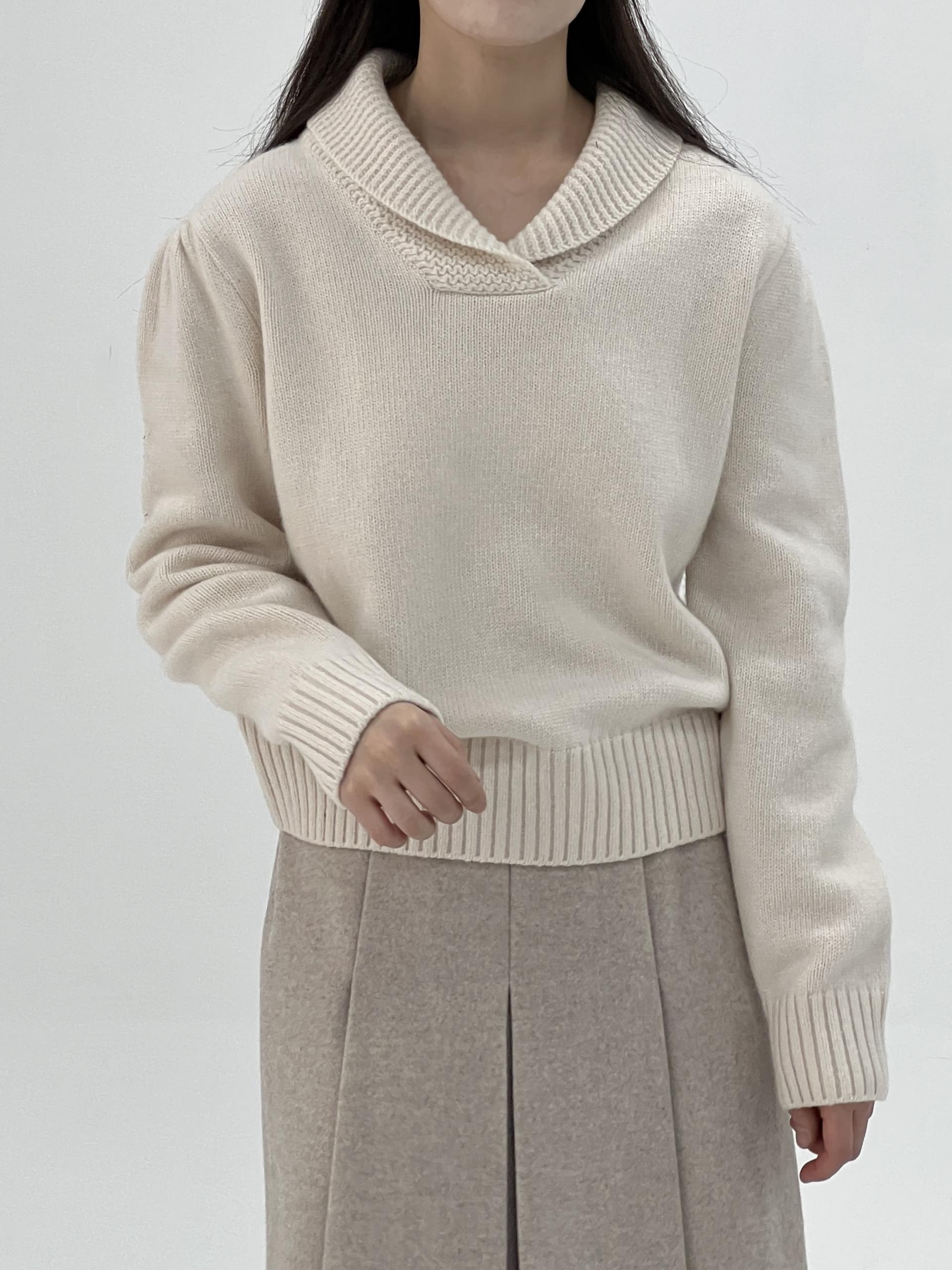 - 얕은 깊이의 숄 카라 디자인이 안정감을 느끼게 해주는 니트 웨어