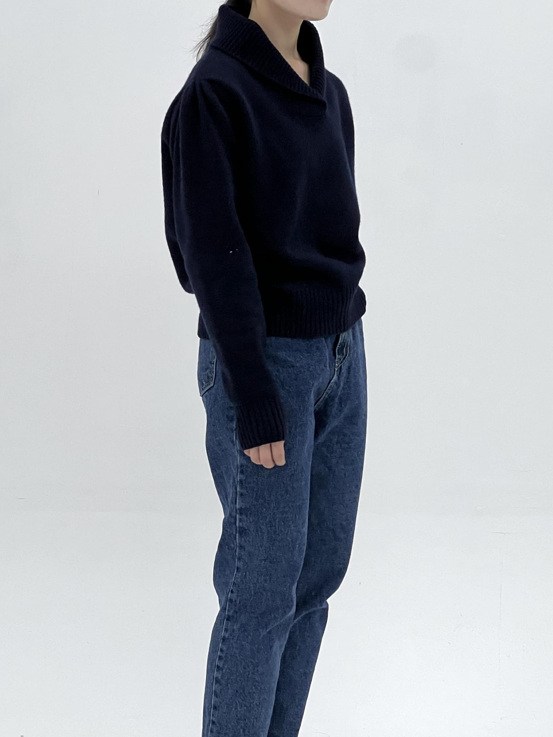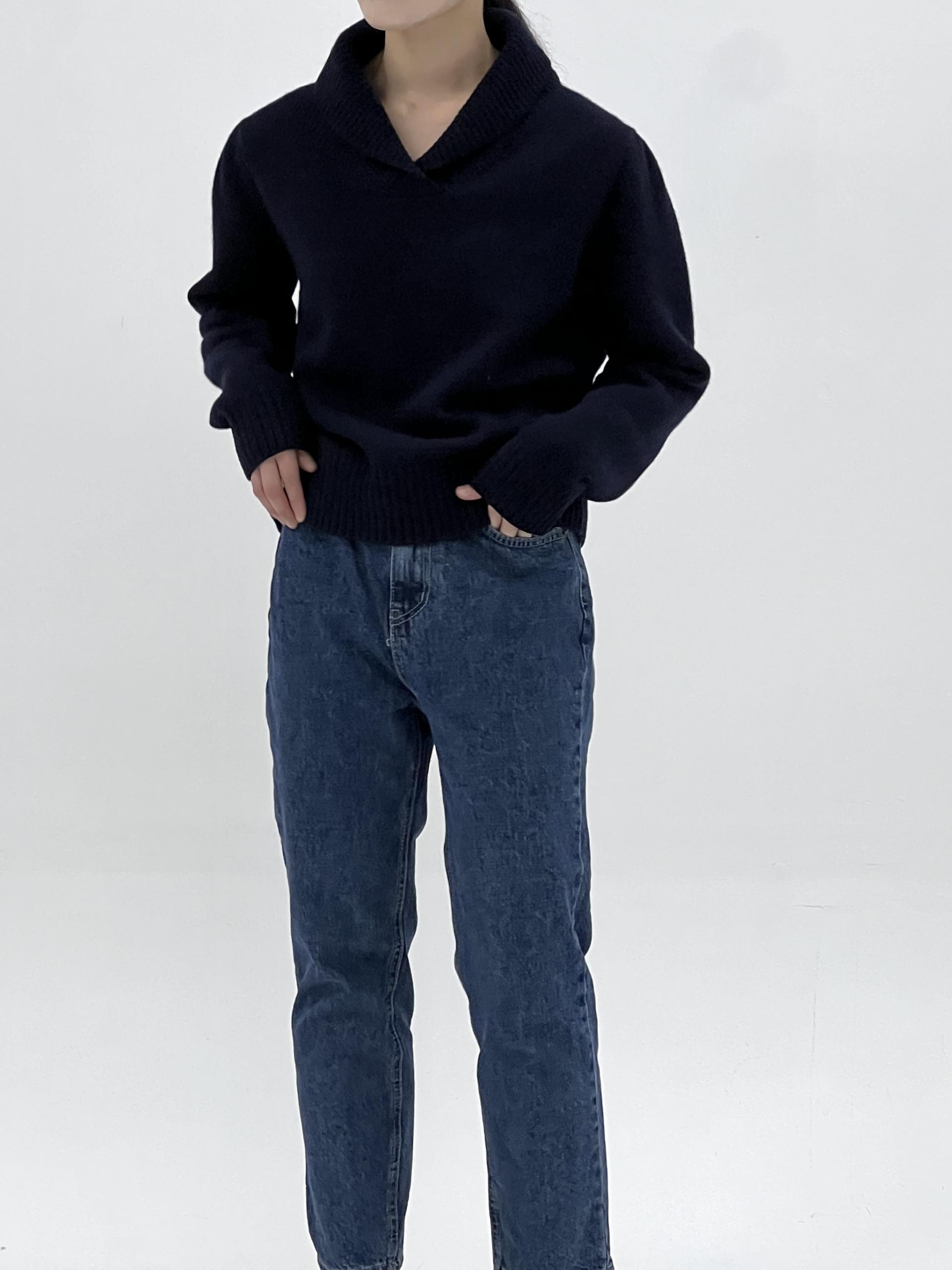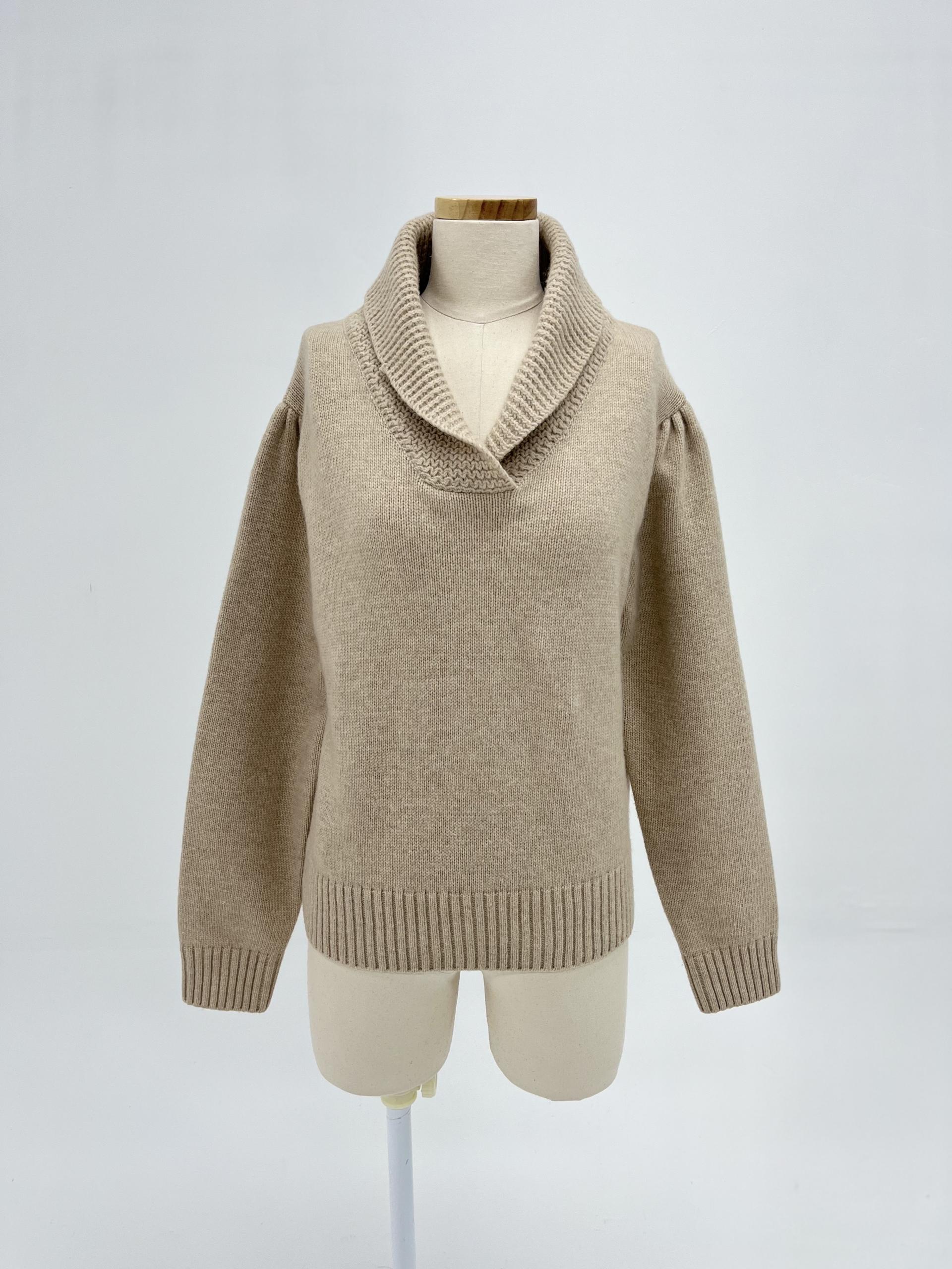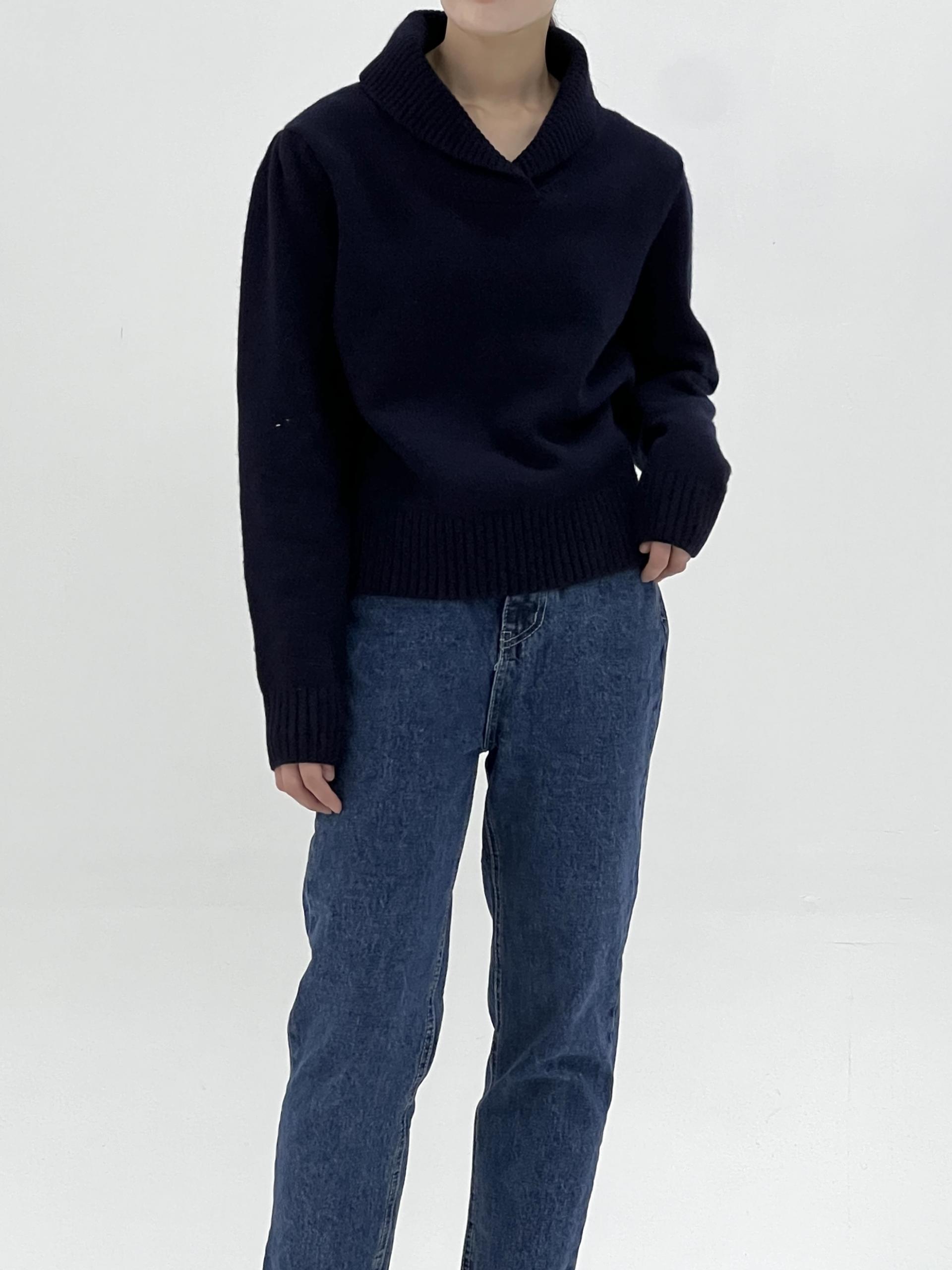 - 얕은 깊이의 숄 카라 디자인이 안정감을 느끼게 해주는 니트 웨어