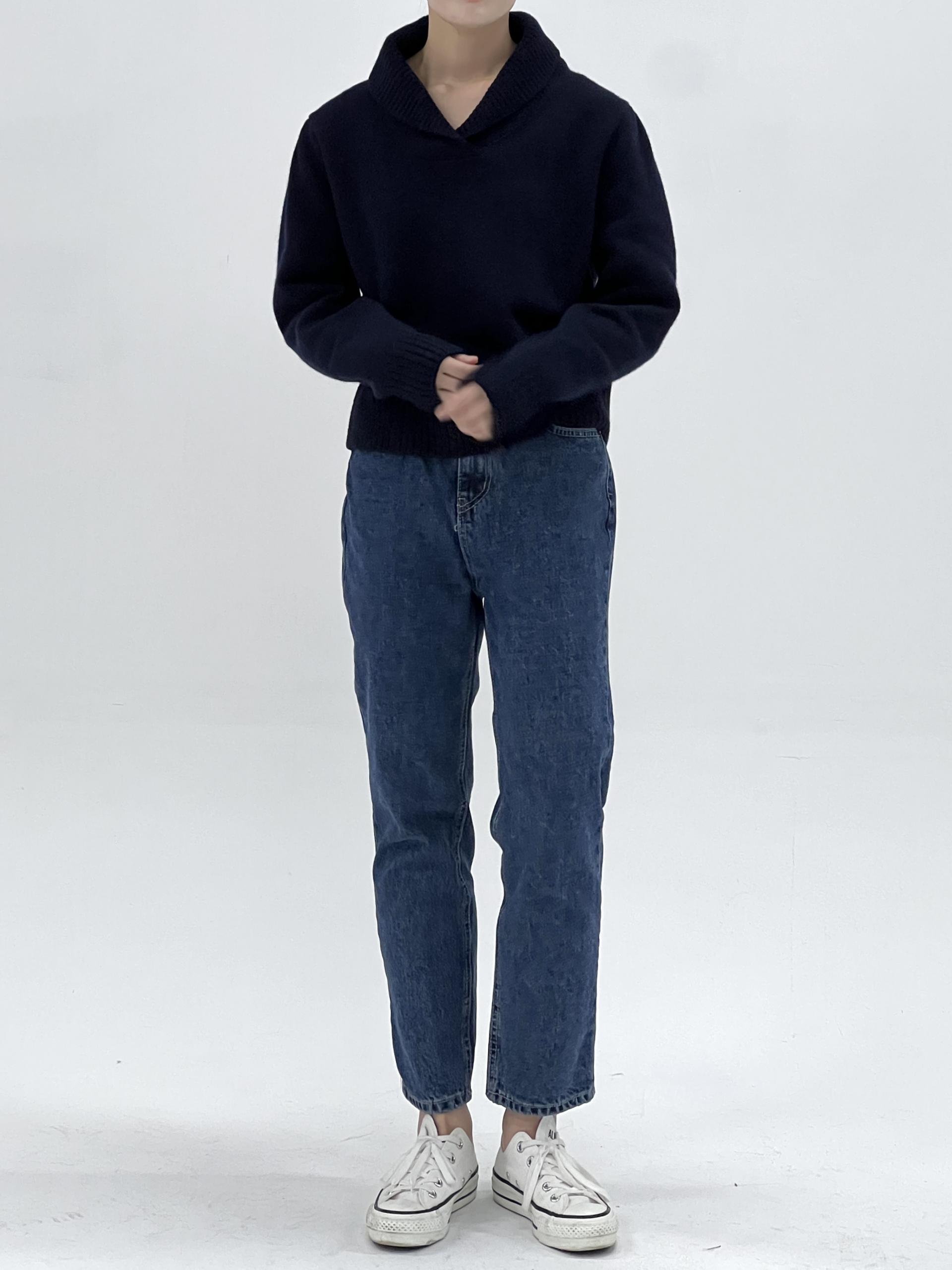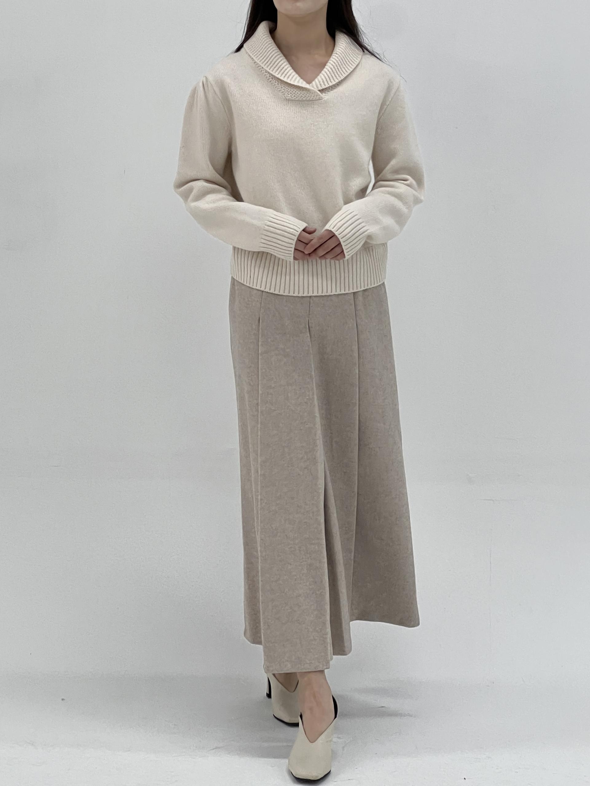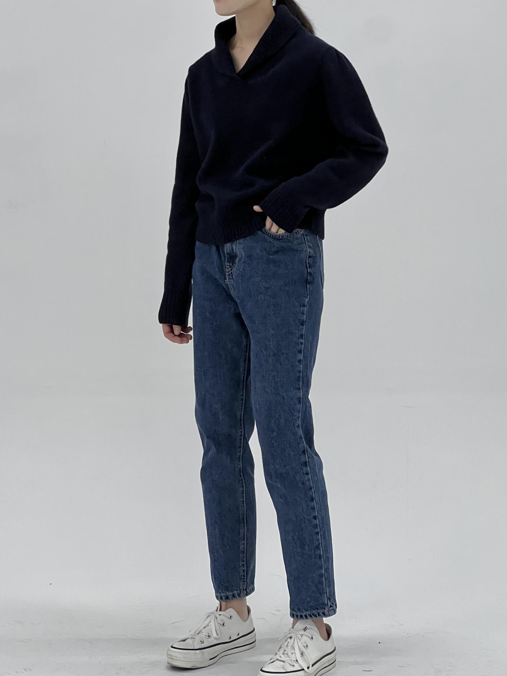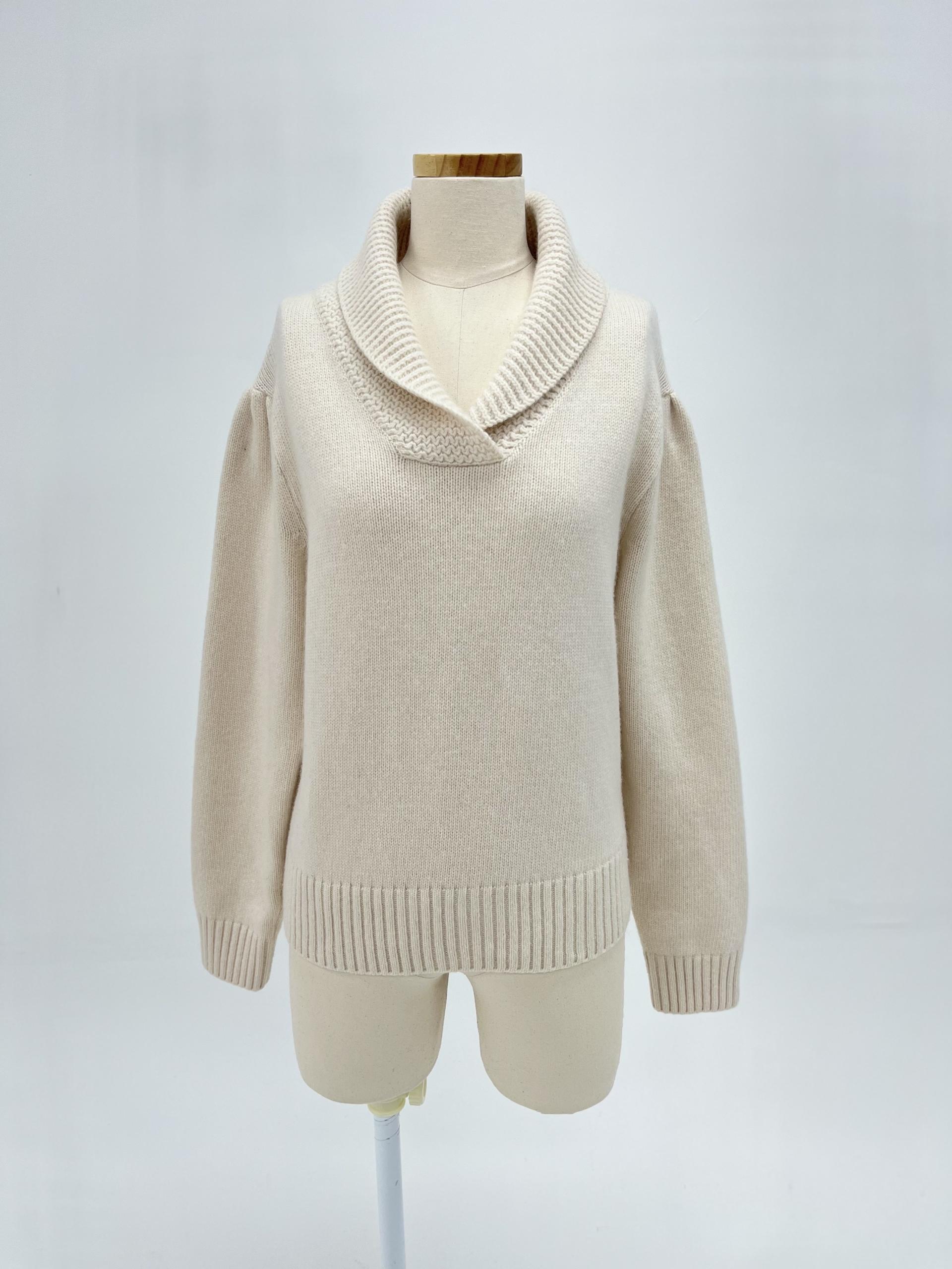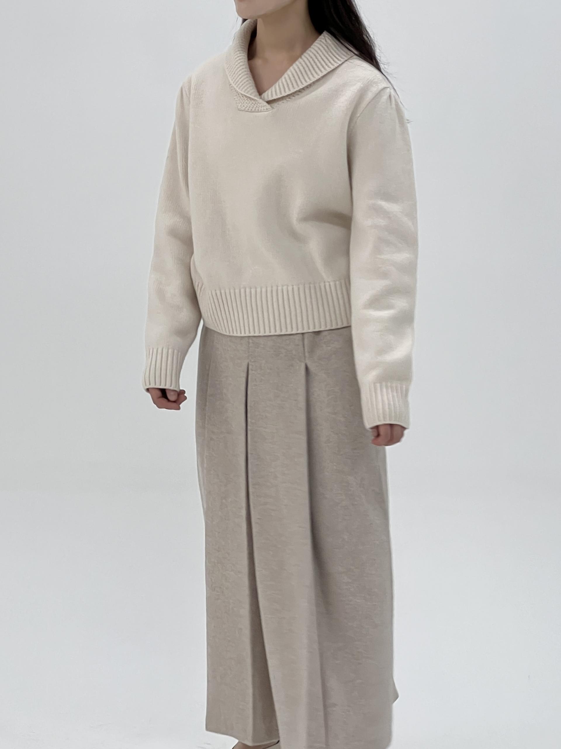 - 얕은 깊이의 숄 카라 디자인이 안정감을 느끼게 해주는 니트 웨어