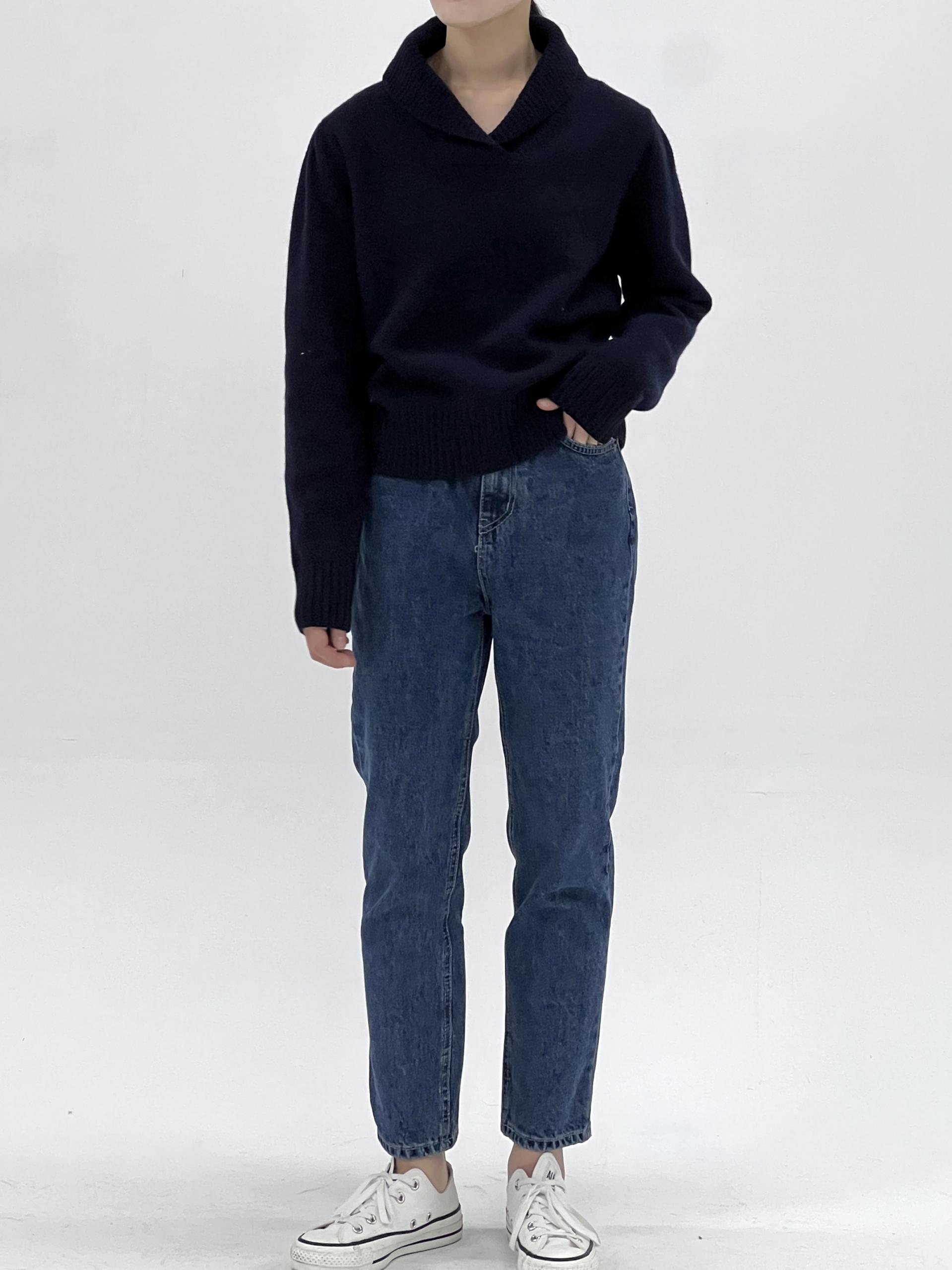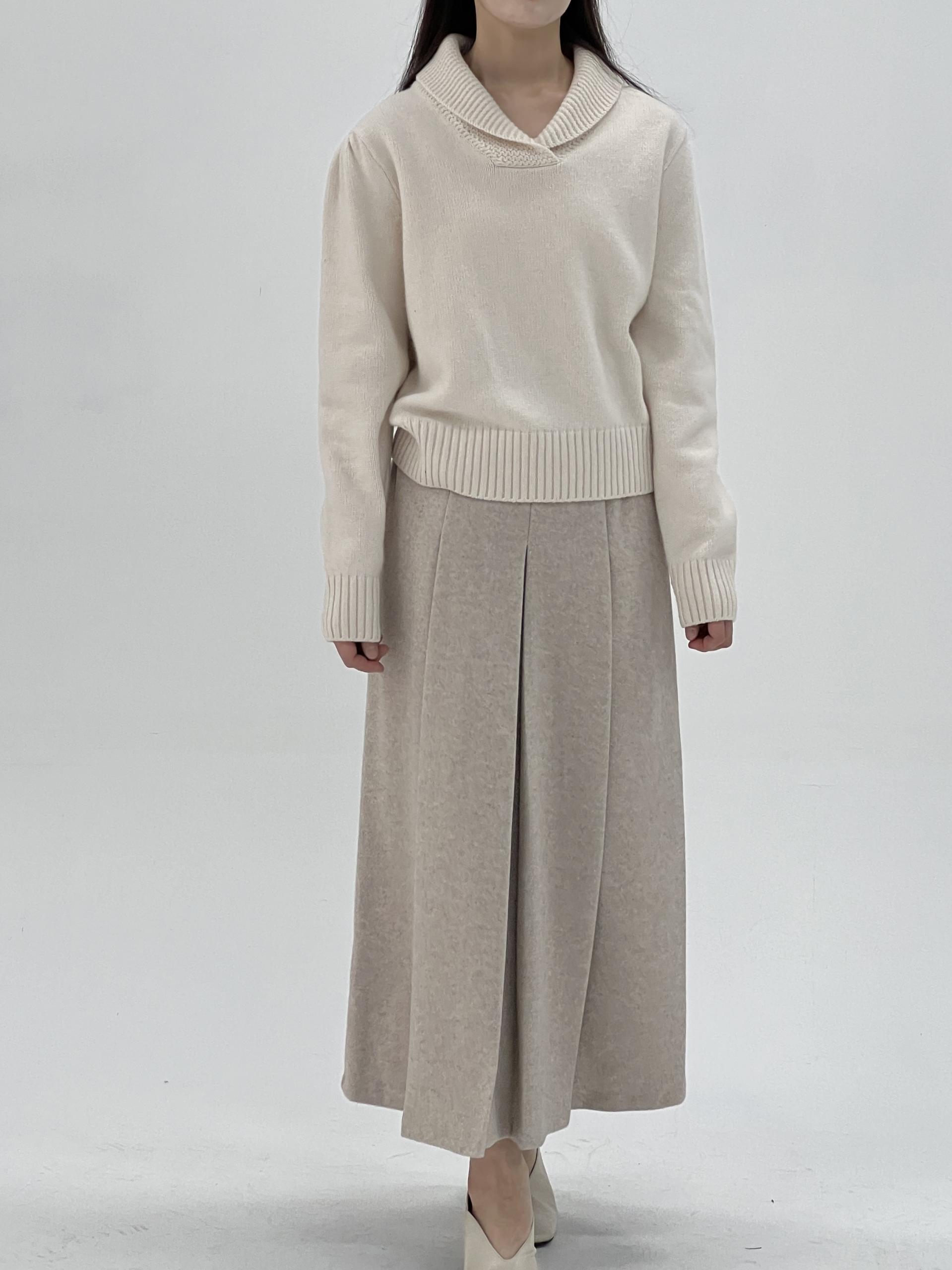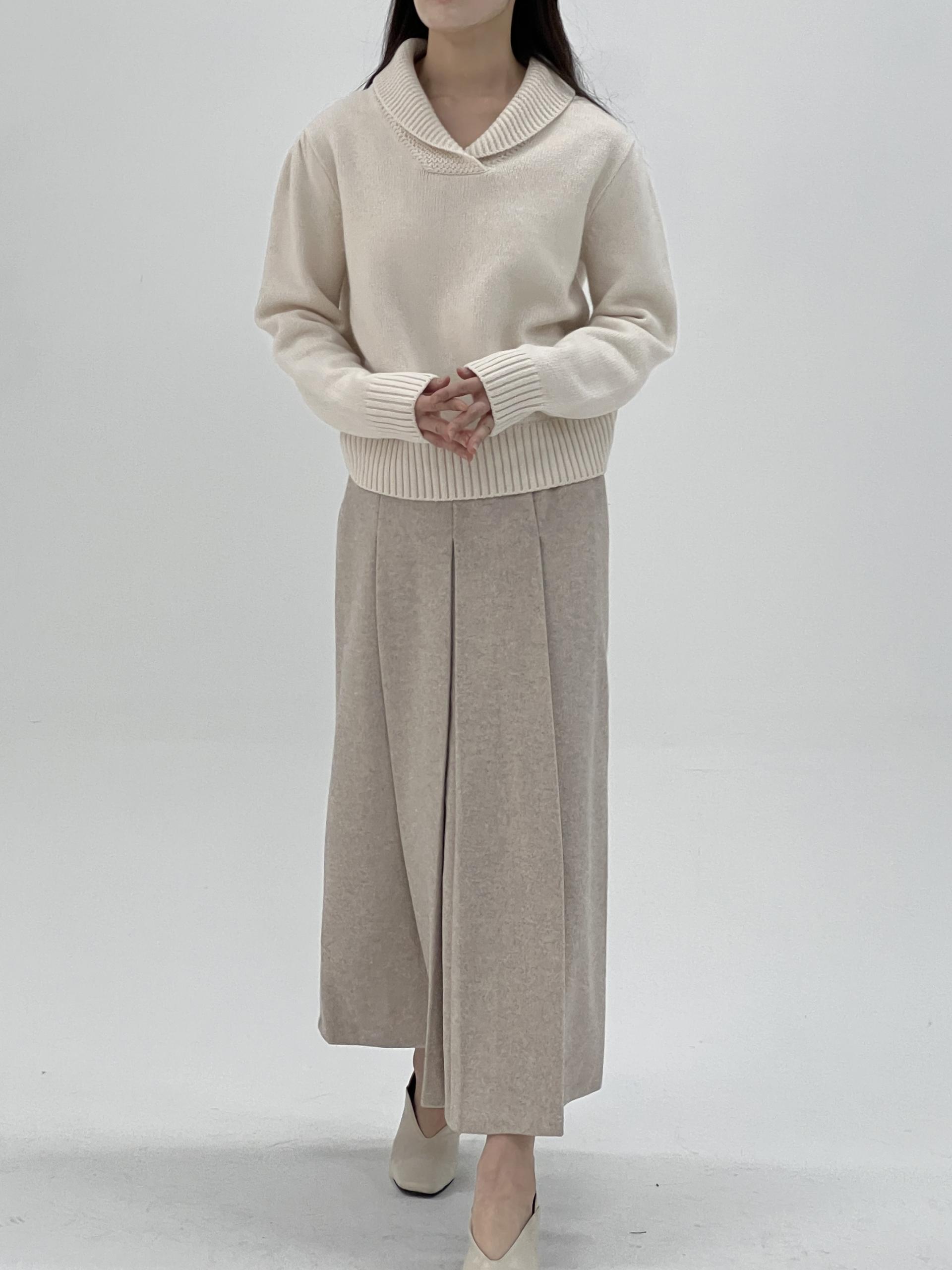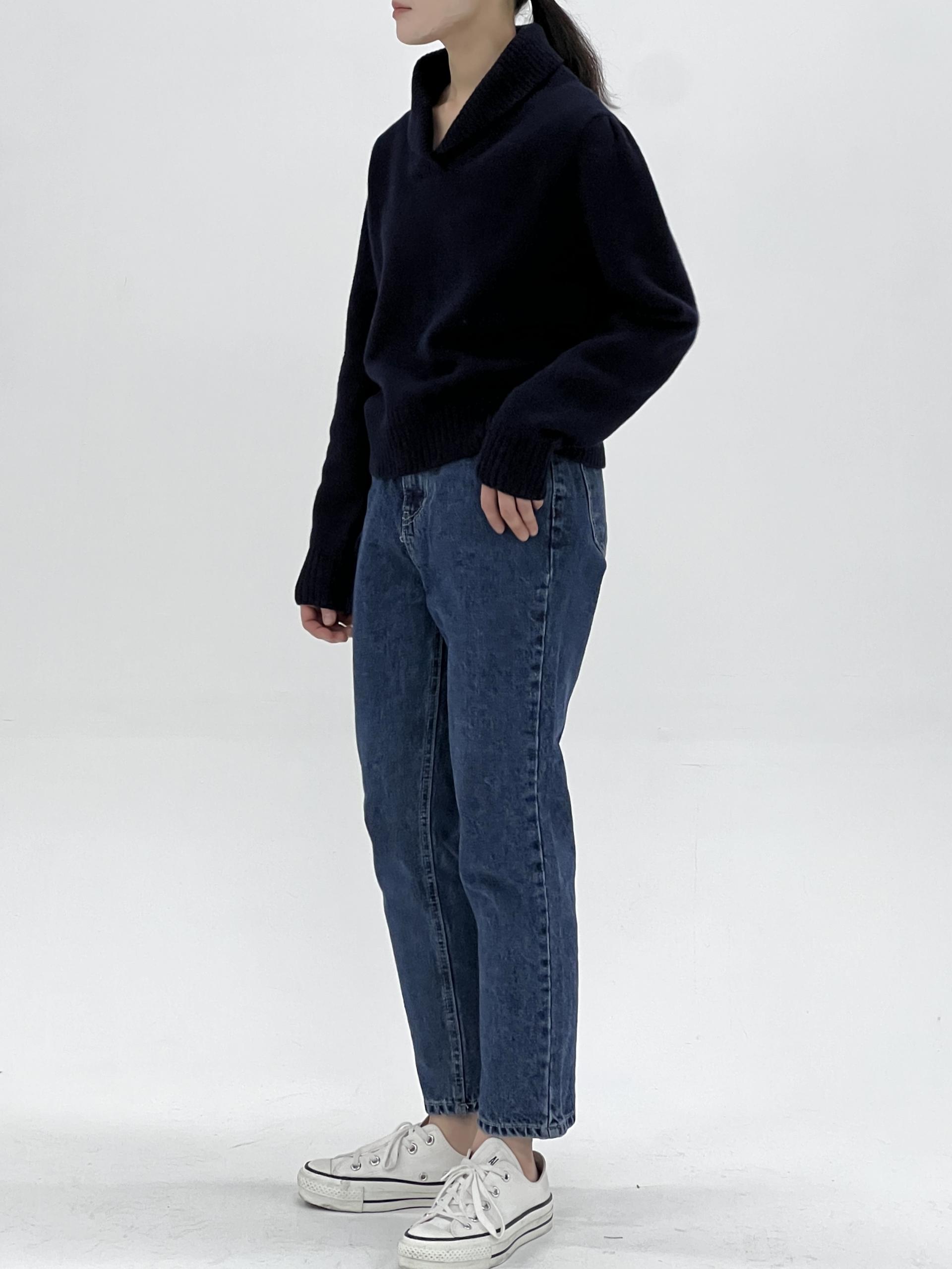 - 얕은 깊이의 숄 카라 디자인이 안정감을 느끼게 해주는 니트 웨어
