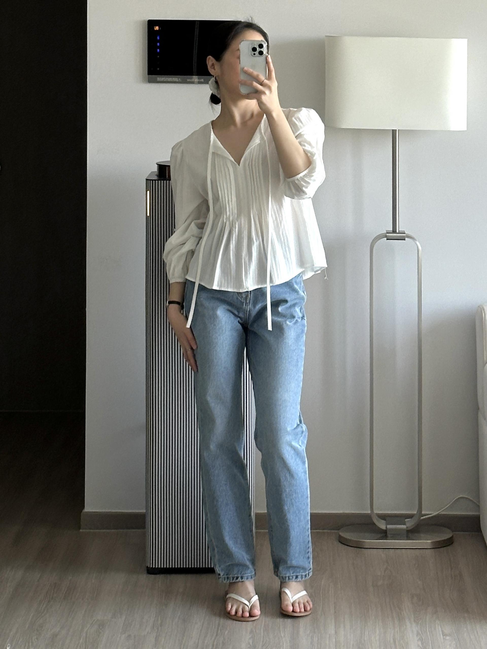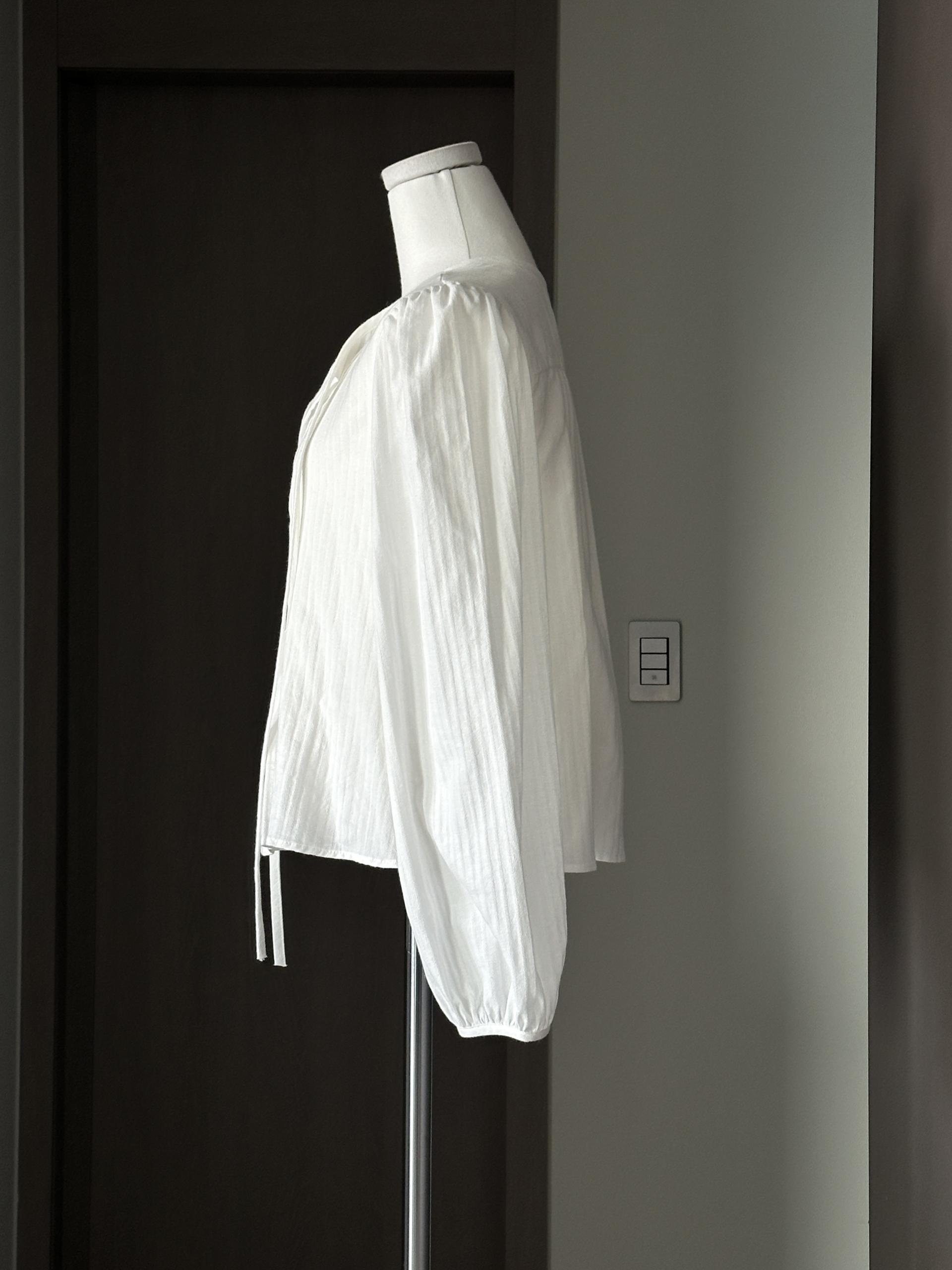 약간 크롭한 기장에 경쾌한 실루엣이 예쁜 블라우스에요.