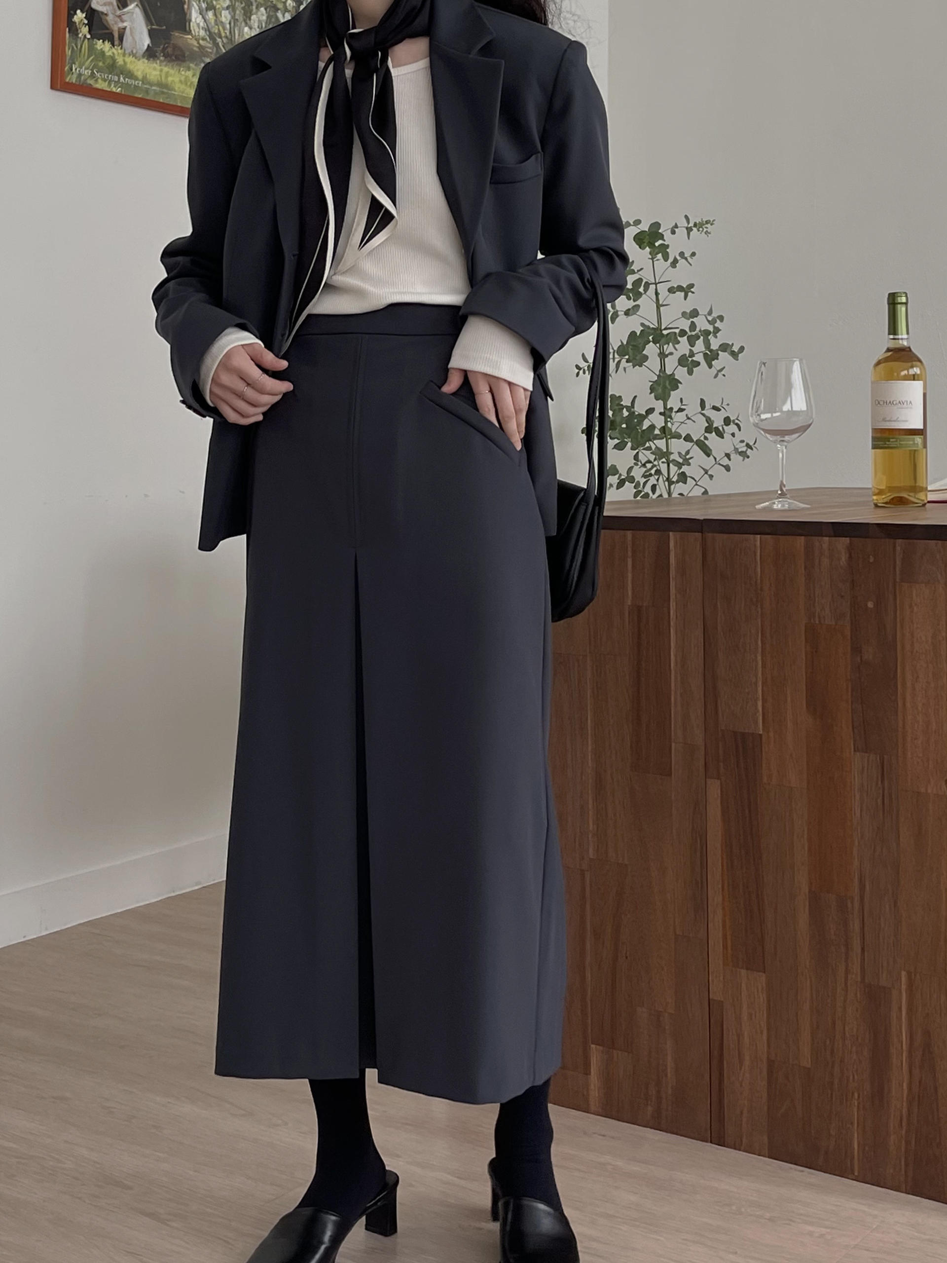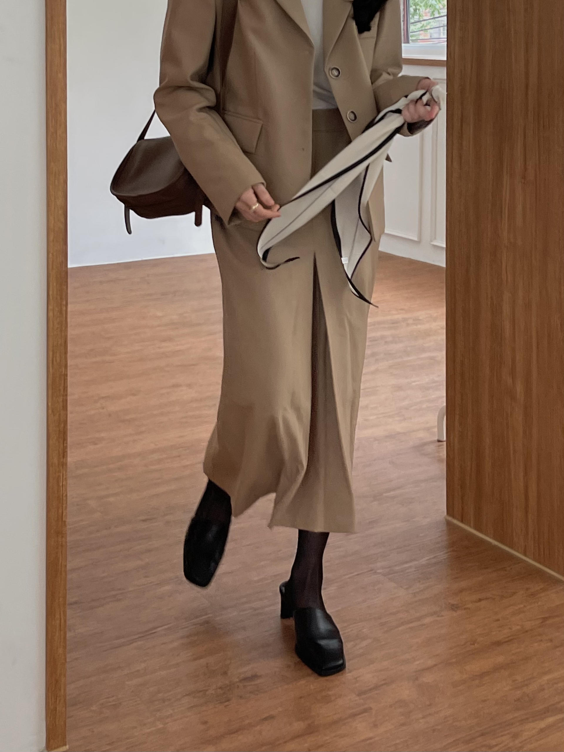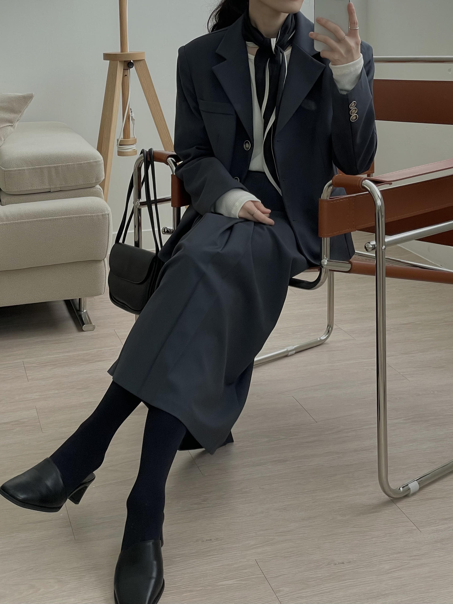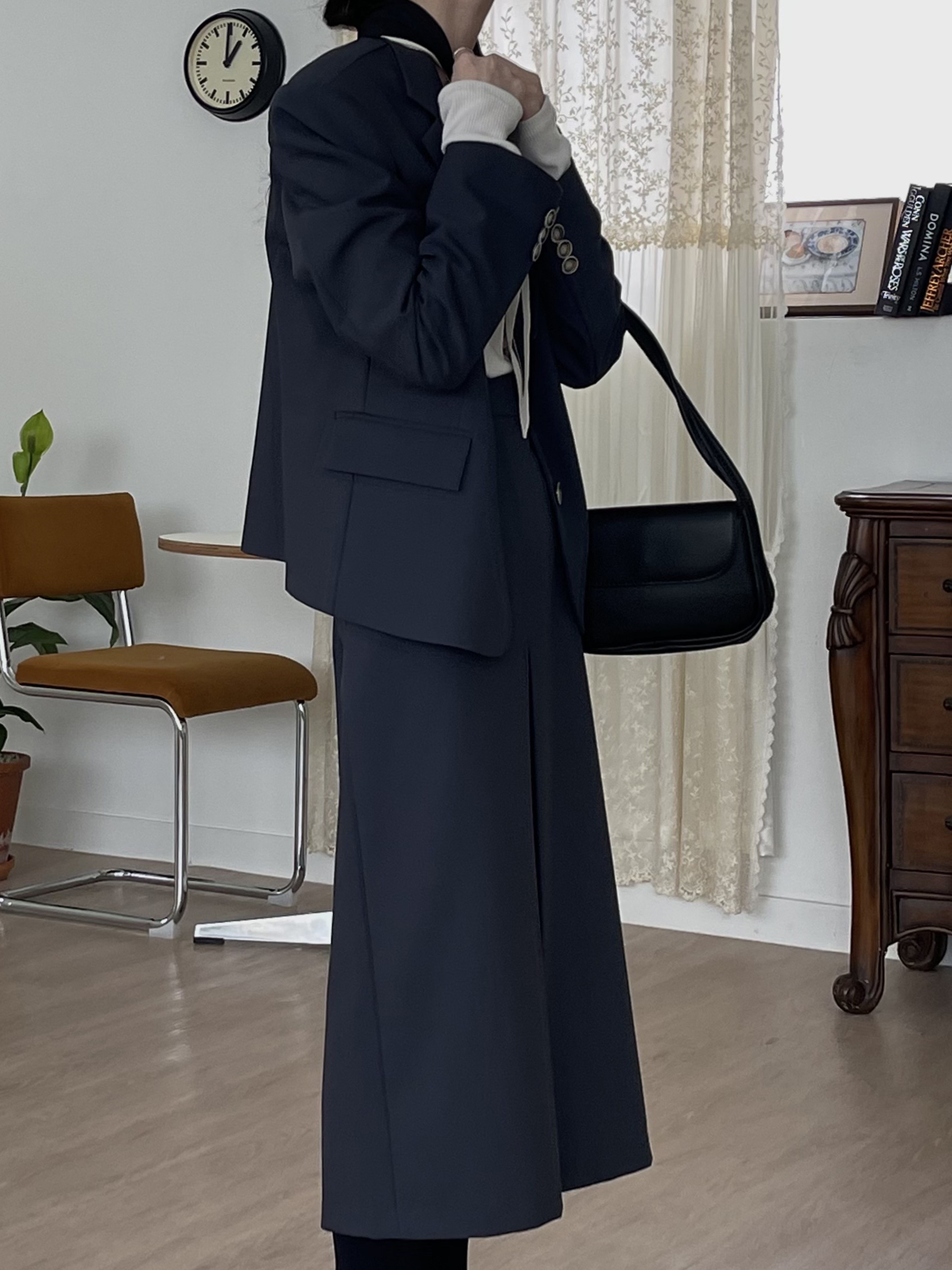자켓과 롱 스커트로 구성 되어있는 셋업으로 함께 착용시 더욱 완성도 있는