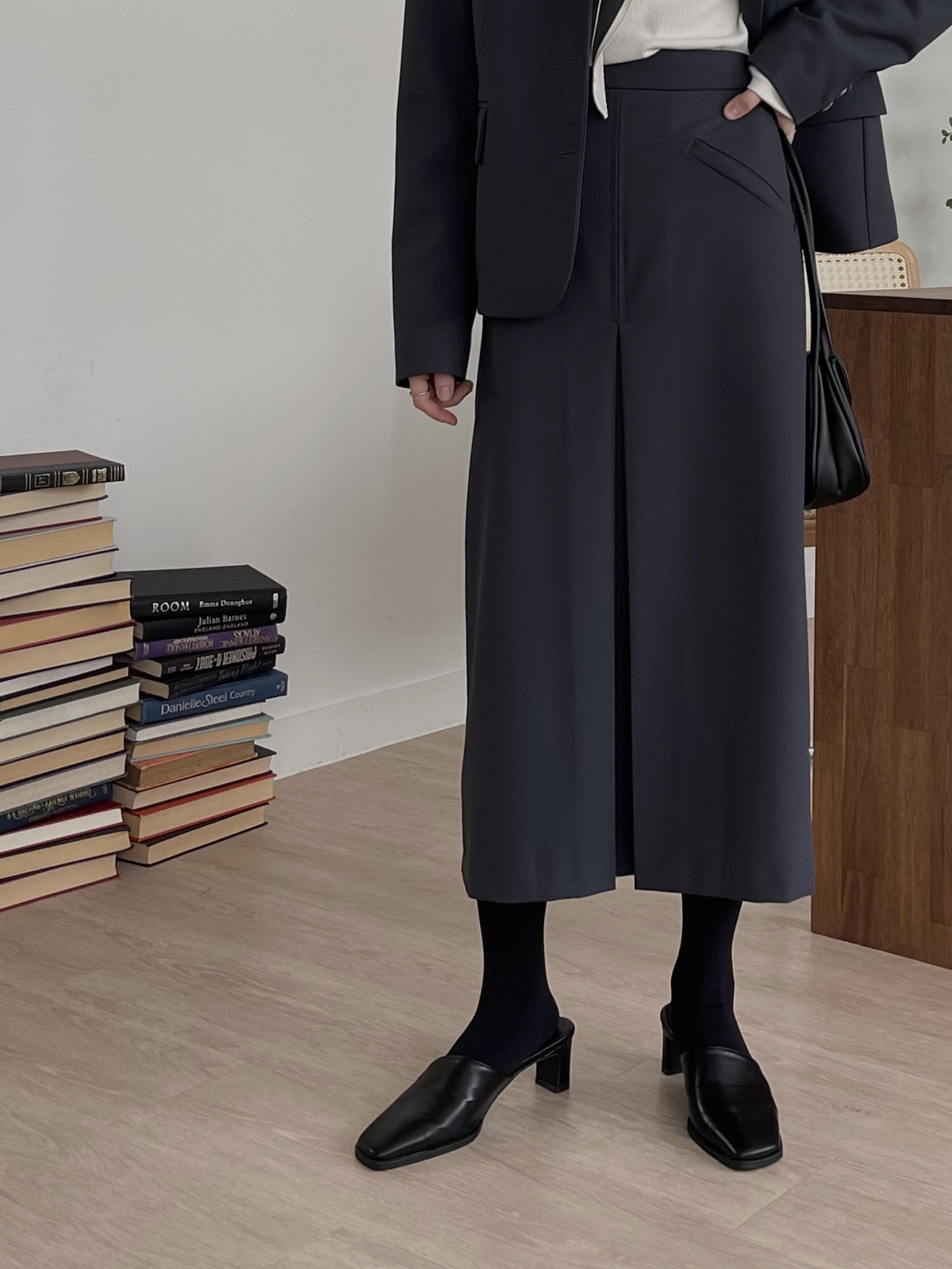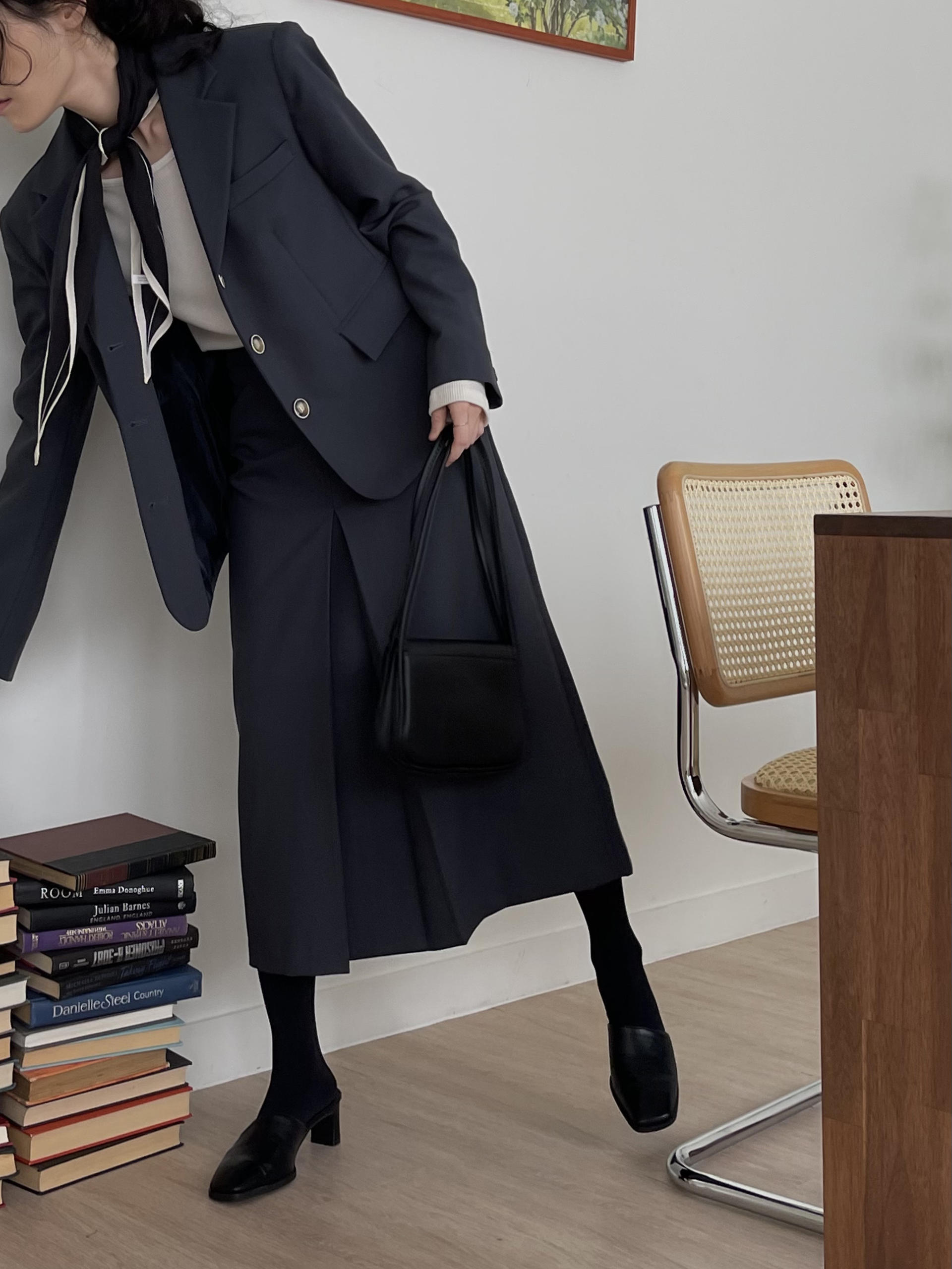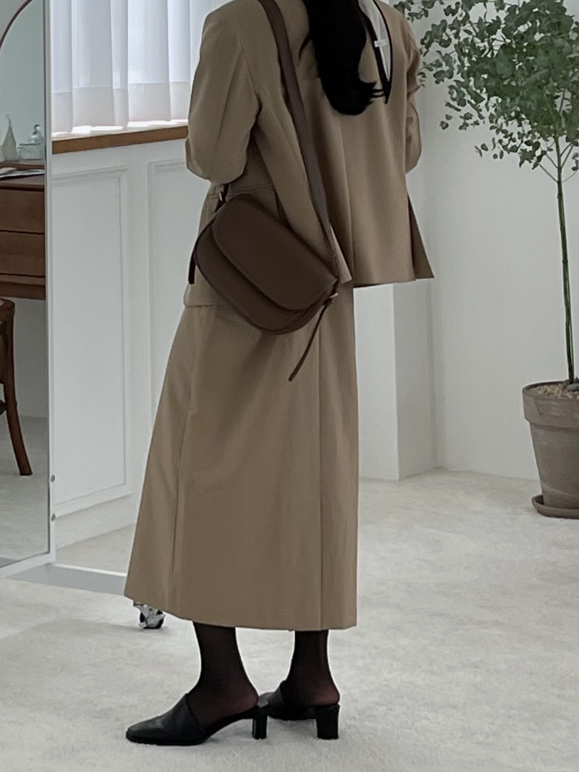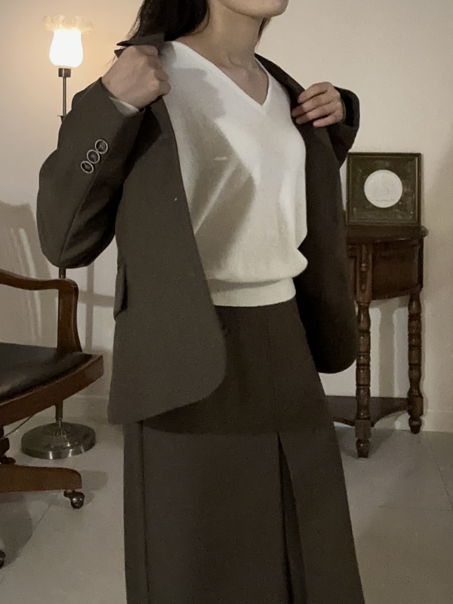 자켓과 롱 스커트로 구성 되어있는 셋업으로 함께 착용시 더욱 완성도 있는